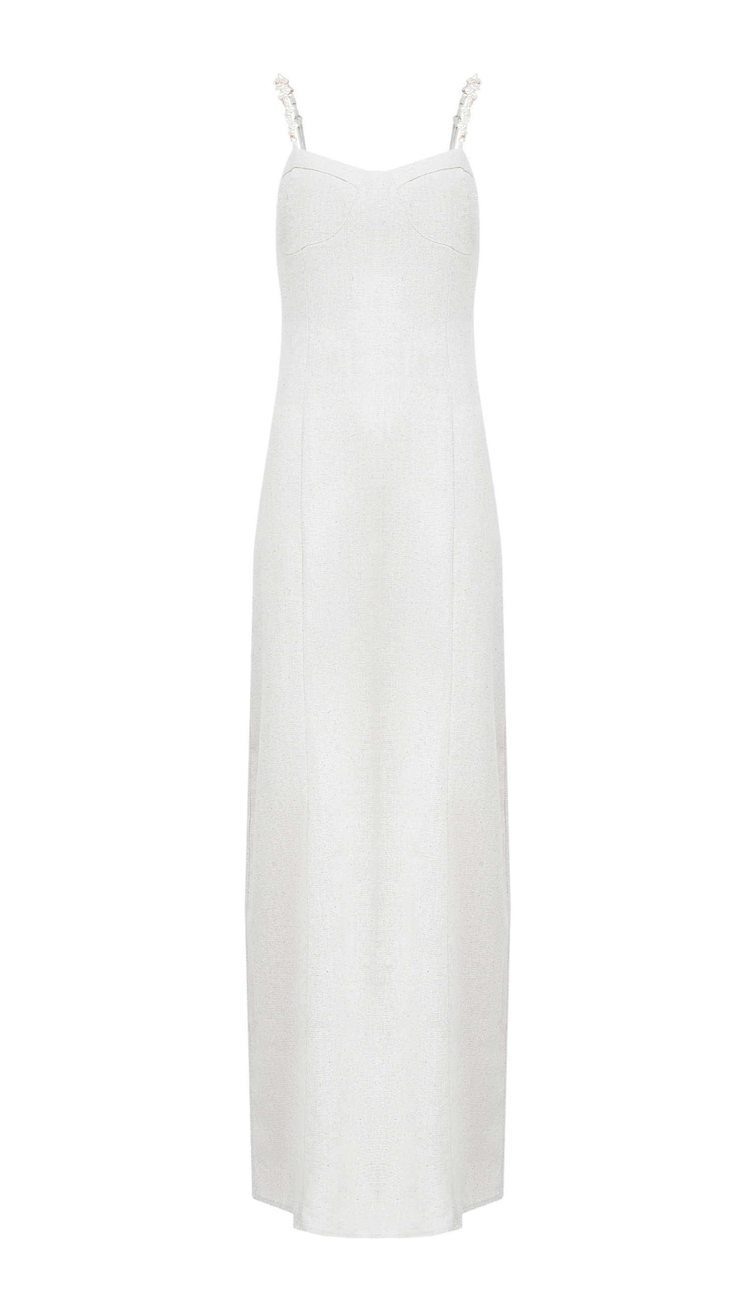Vestido longo confeccionado em linho com forro. Possui modelagem soltinha com saia mais reta, decote coração com recortes que modelam o busto e o corpo, lastex franzido nas costas para melhor ajuste ao corpo e o lindo detalhe de alcinhas reguláveis com aplicação de mix de miçangas em estilo de pérola natural e douradas.