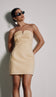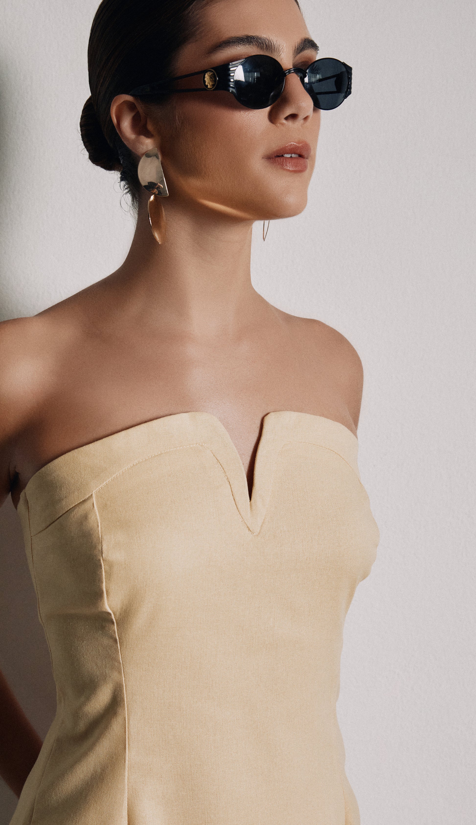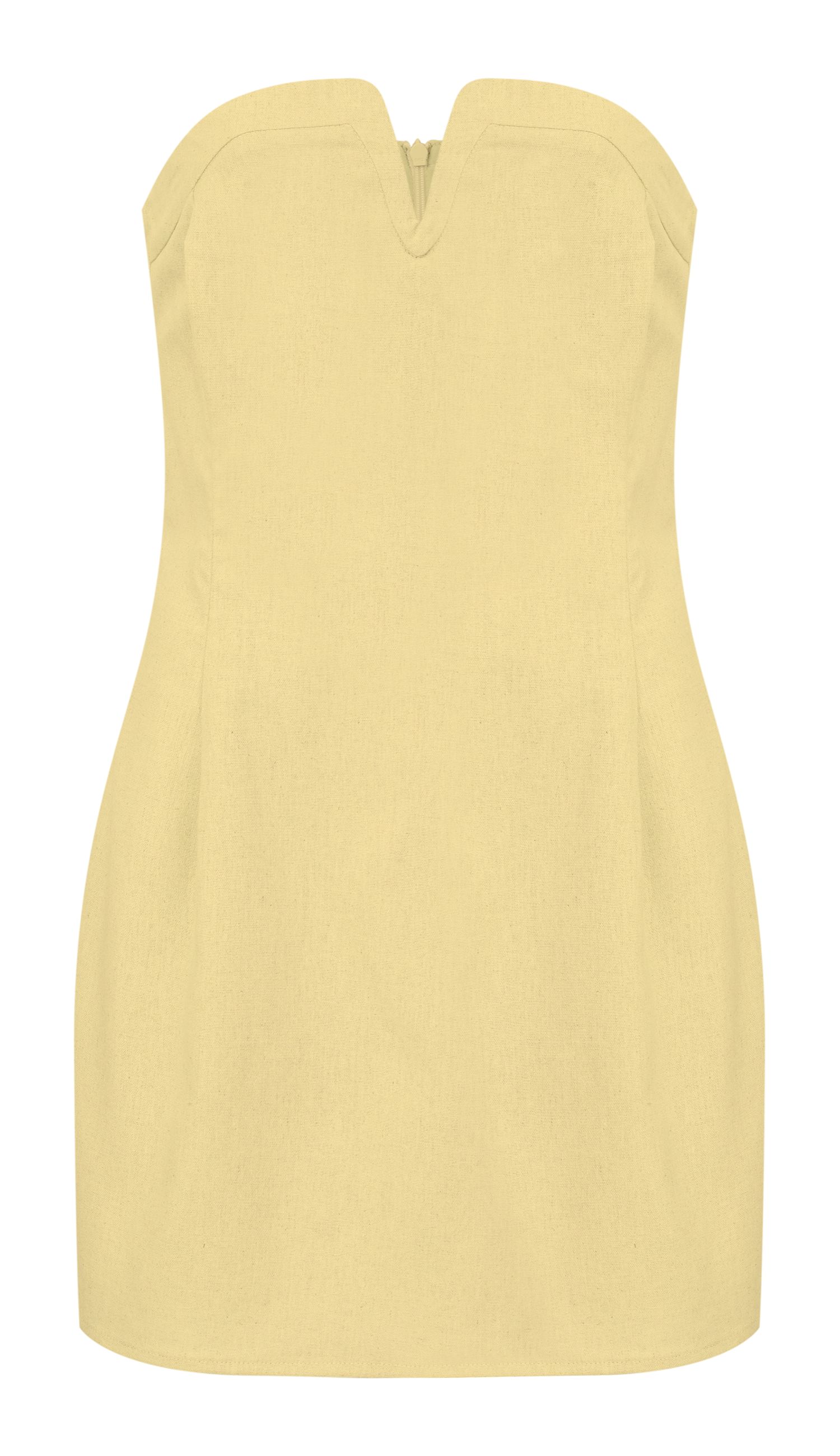 Vestido curto sem mangas confeccionado em linho com forro. Possui modelagem ajustada ao corpo, decote reto com aberturinha em V estruturada no centro do busto, silicone elástico interno para maior segurança, pala no decote, elástico interno nas costas para melhor ajuste ao corpo, fechamento traseiro por zíper invisível e recortes que modelam a peça e desenham a silhueta.