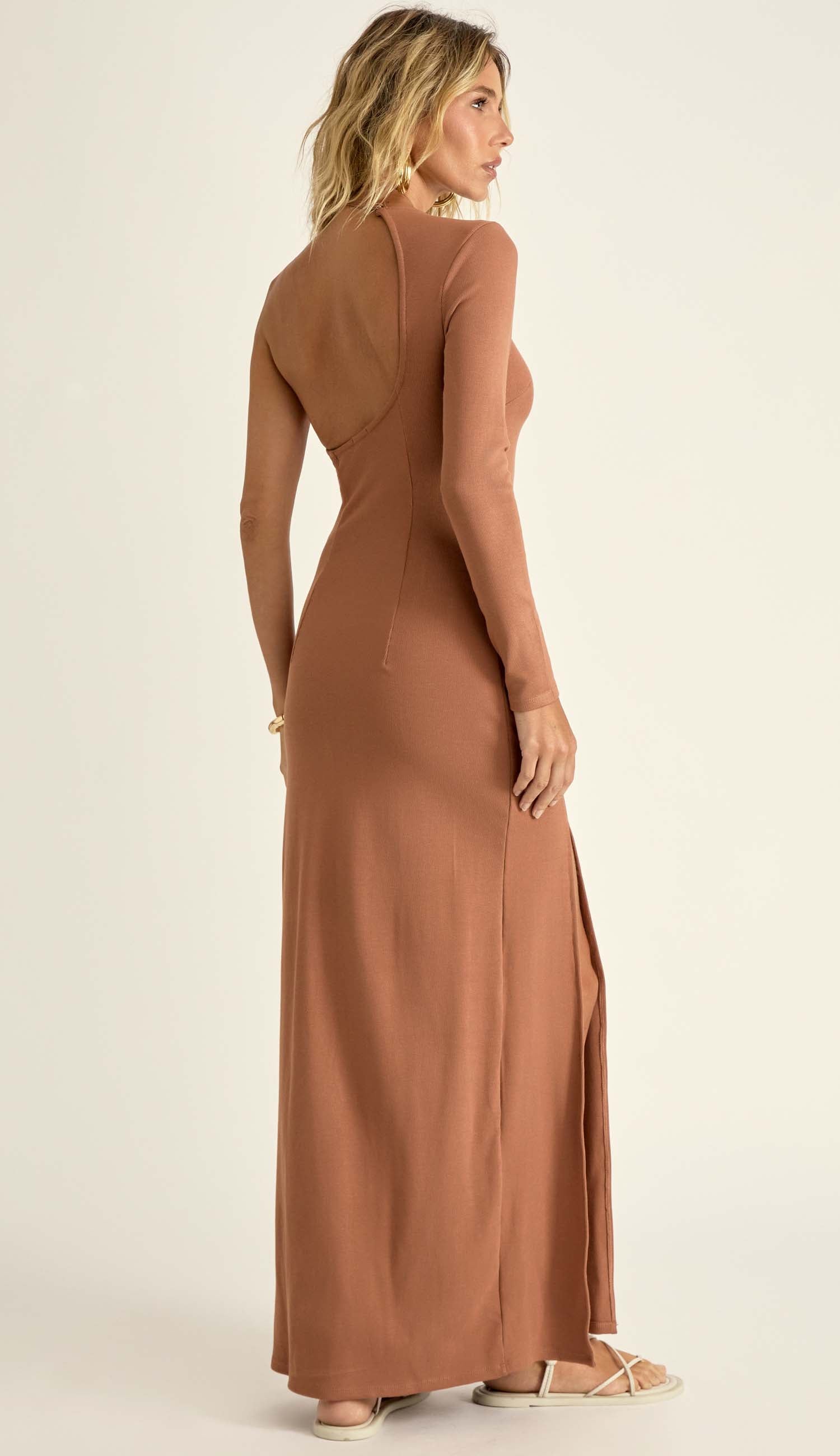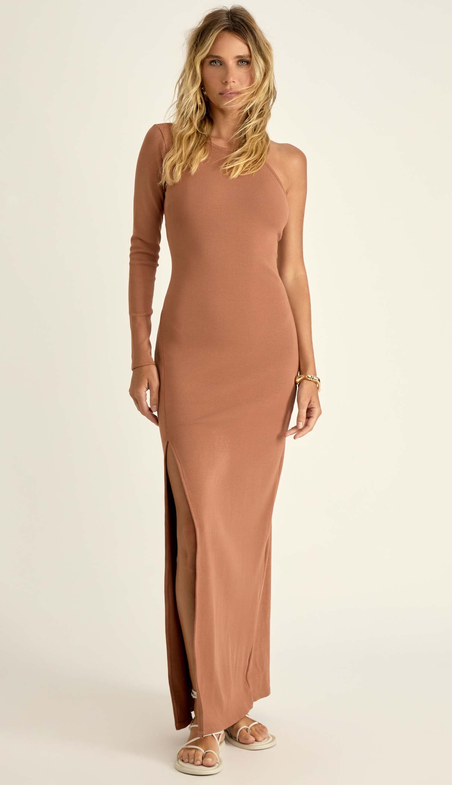 Vestido longo confeccionado em malha canelada. Possui modelagem bem ajustada ao corpo, decote careca com detalhe de ombro único com recorte vazado, sendo sem manga de um lado e com manga comprida do outro lado, criando um um lindo decote nas costas e um visual assimétrico bem moderno e estiloso; fechamento na nuca por botão esmaltado e fenda lateral na saia.
