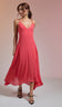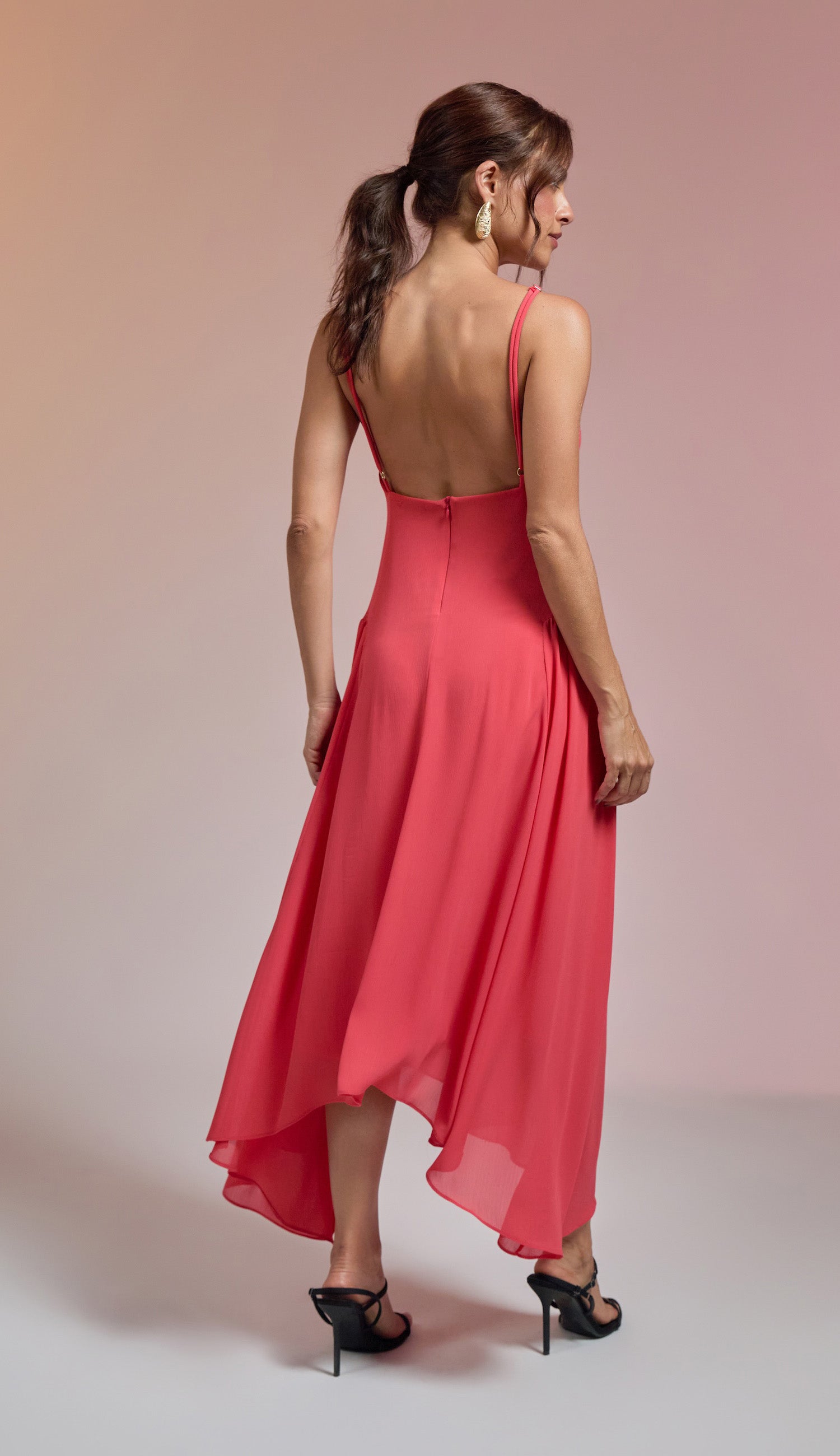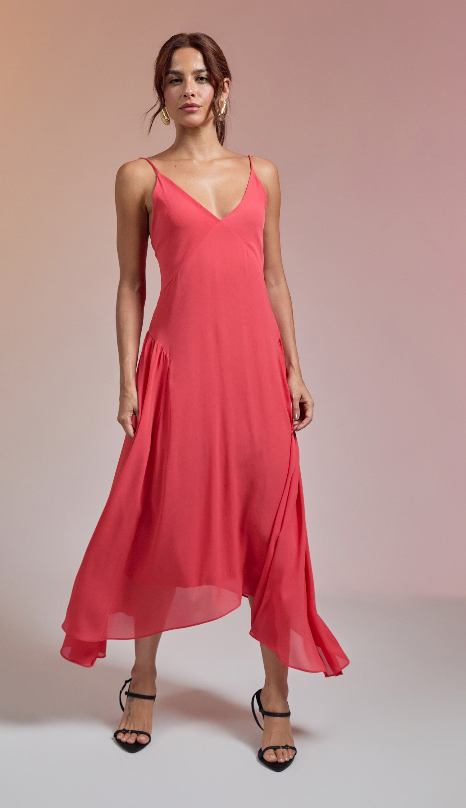 Vestido midi confeccionado em crepe leve texturizado com forro. Possui decote "V" com recorte abaixo do busto, alcinhas reguláveis, fechamento traseiro por zíper invisível, recortes laterais na saia com franzidos que criam sutilmente um lindo volume na peça e a barra assimétrica, que dá um movimento incrível ao look!