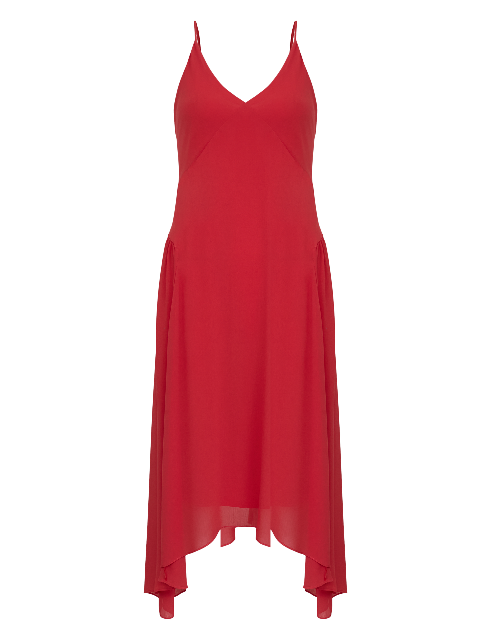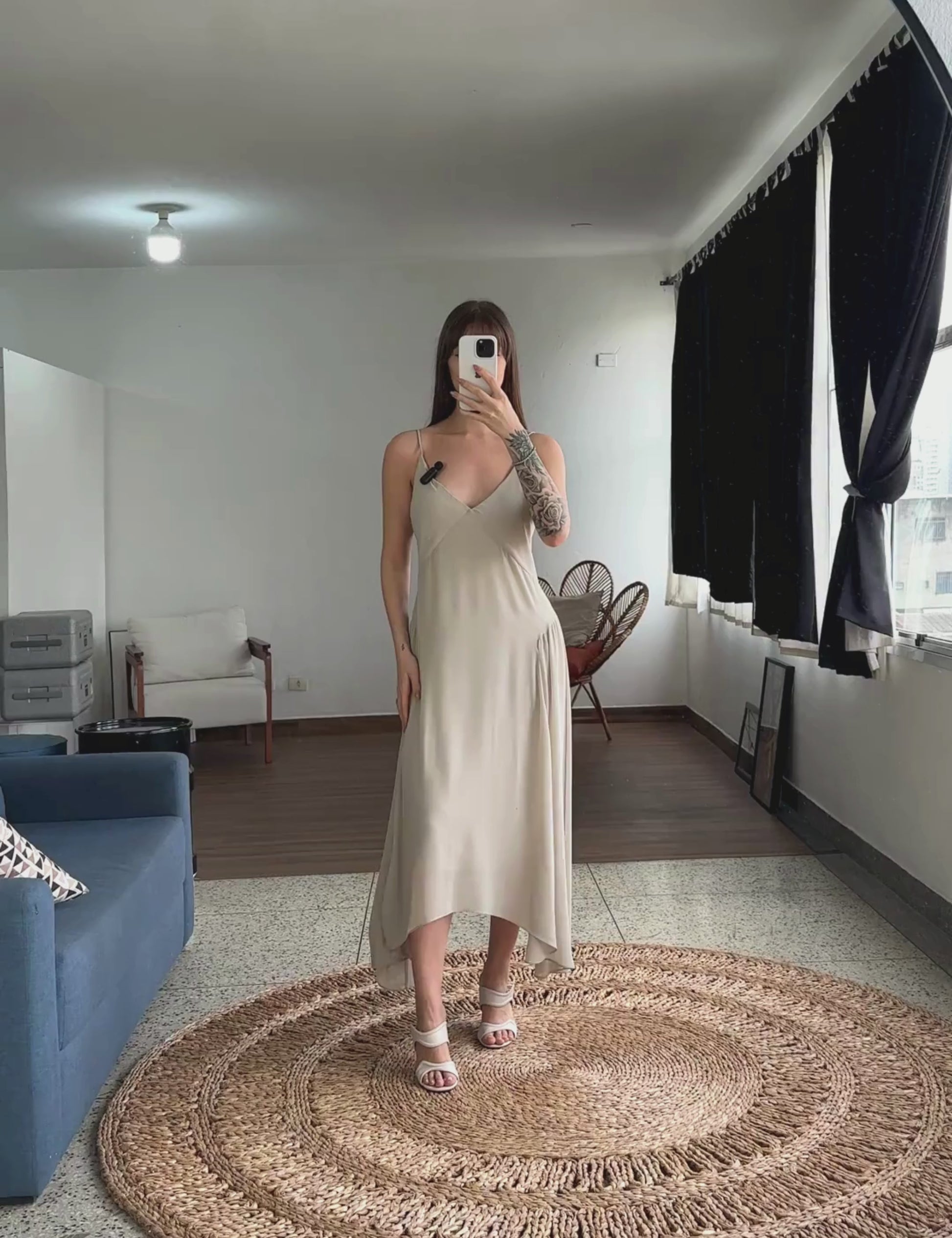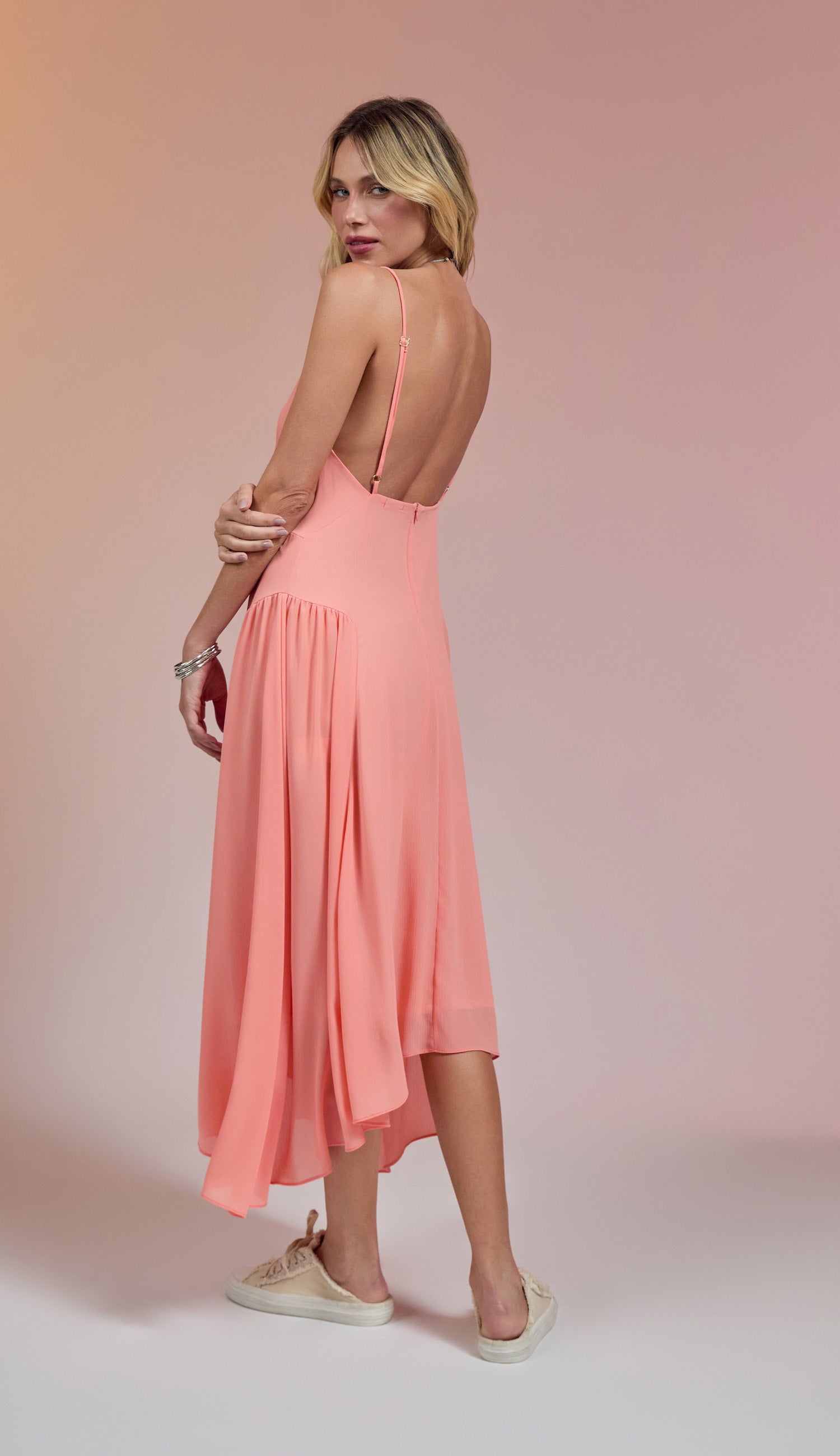 Vestido midi confeccionado em crepe leve texturizado com forro. Possui decote "V" com recorte abaixo do busto, alcinhas reguláveis, fechamento traseiro por zíper invisível, recortes laterais na saia com franzidos que criam sutilmente um lindo volume na peça e a barra assimétrica, que dá um movimento incrível ao look!