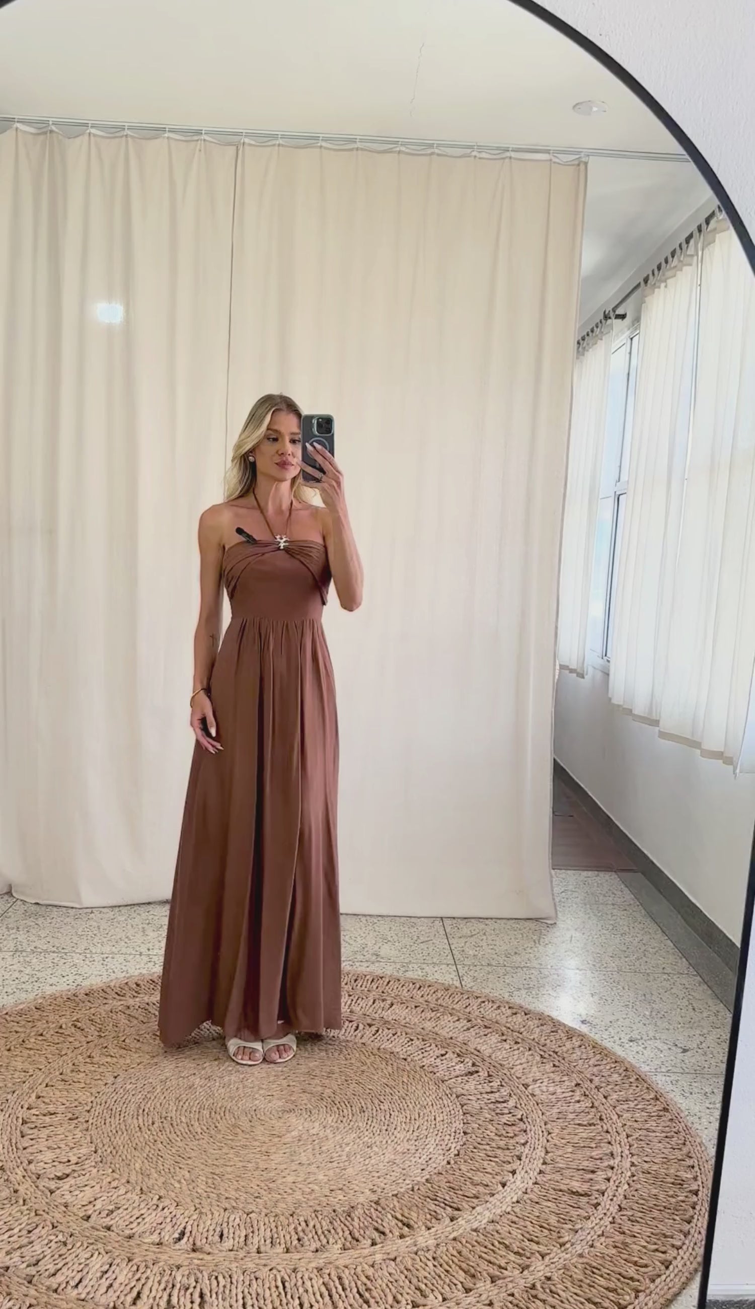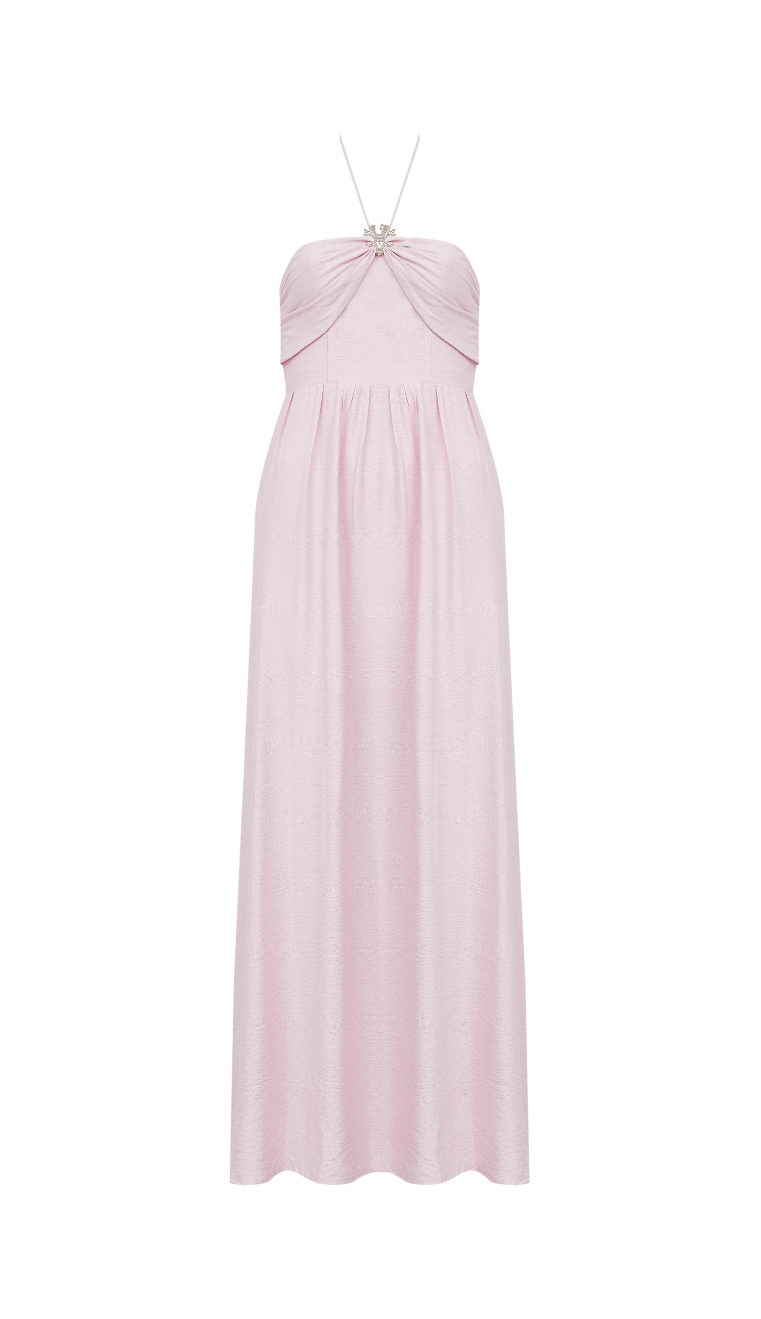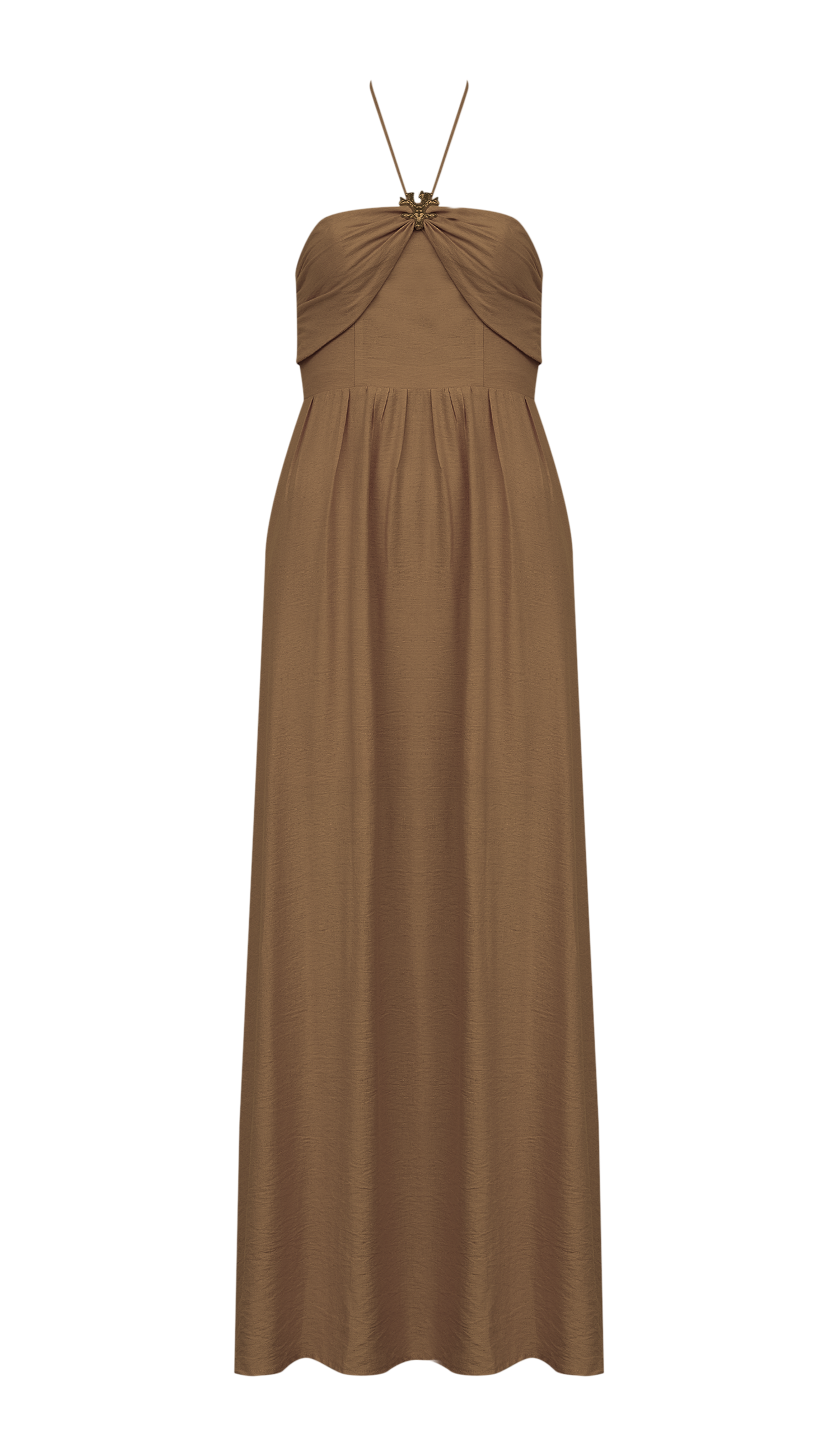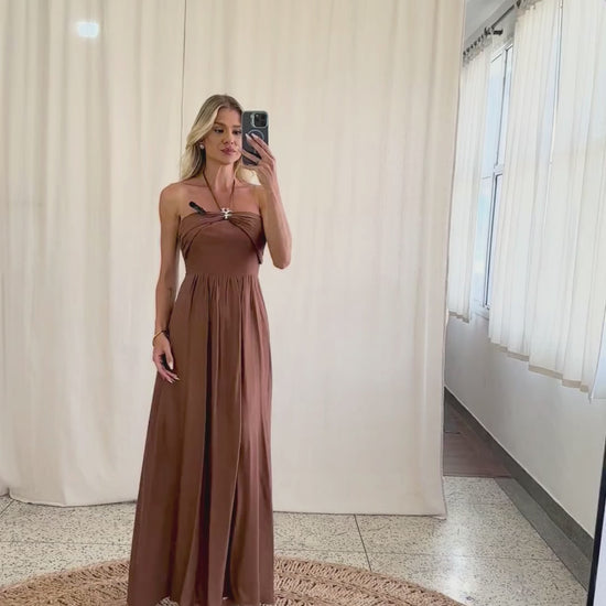 Vestido longo confeccionado em poliviscose texturizada com forro. Possui decote reto com sobreposição de tecido na região do busto partindo das laterais, com aplicação de aviamento de metal em formato de coral no centro, de onde saem tirinhas removíveis com ponteiras de metal em formato de conchinha para amarrar no pescoço se desejar; conta ainda com recortes que modelam o busto, saia evasê com recorte franzidinho na cintura e lastex nas costas para melhor ajuste ao corpo.