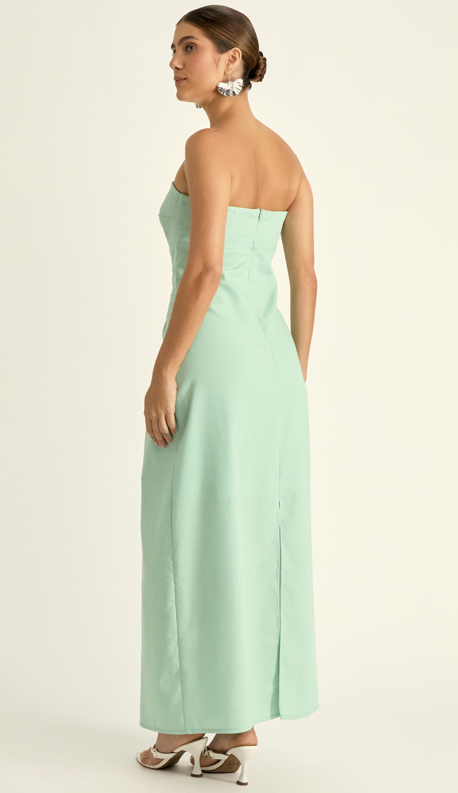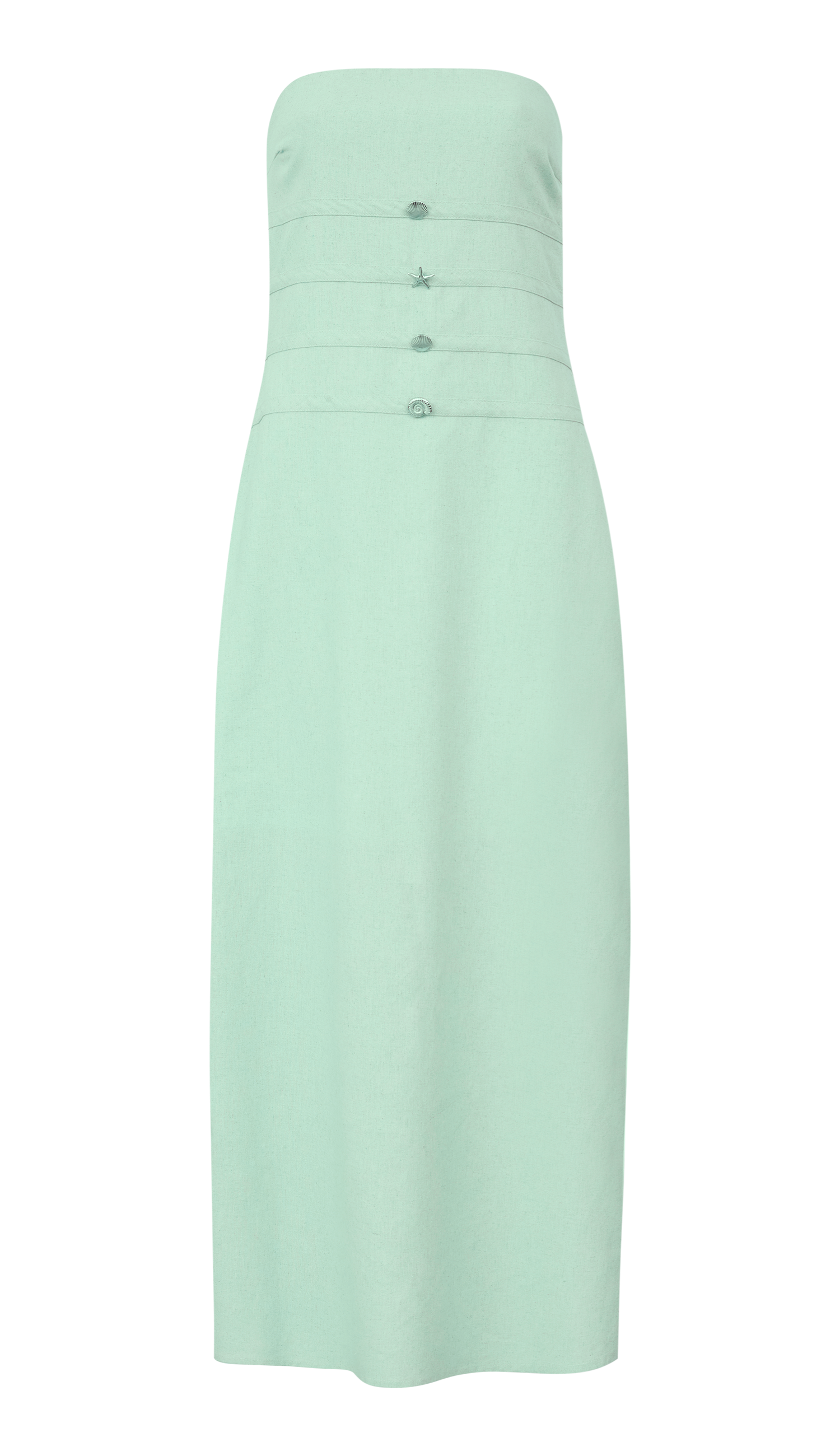 Vestido longo sem mangas confeccionado em linho com forro. Possui decote reto com silicone elástico interno para maior segurança, modelagem ajustada ao corpo, fechamento traseiro por zíper invisível, tiras fixas do mesmo tecido costuradas no corpo do peça horizontalmente com o detalhe super charmoso de pingentes de metal com temática "marinha" fixadas no centro da peça e fenda traseira na saia para facilitar os movimentos e deixar o look mais confortável.