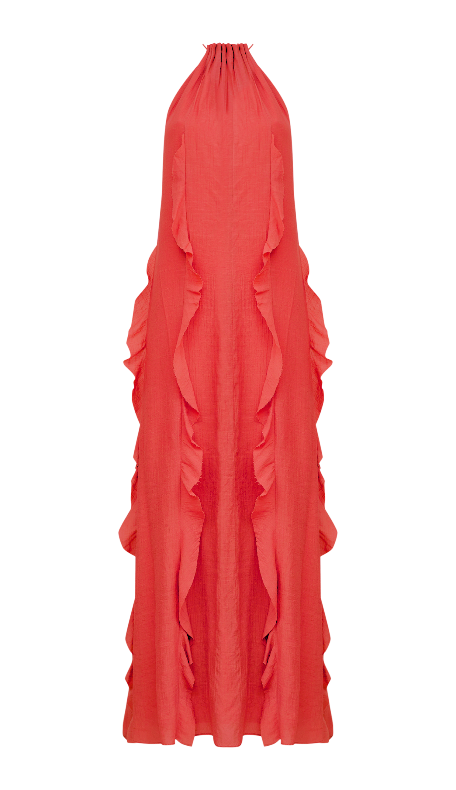 Vestido longo confeccionado em poliviscose texturizada com forro. Possui decote halter com franzidinhos na frente e nas costas, tirinhas embutidas no decote com ponteiras de metal em formato de conchinha para ajuste e fechamento por amarração, modelagem soltinha e recortes verticais em todo o comprimento da peça com aplicação de babados a fio estilo cascata.