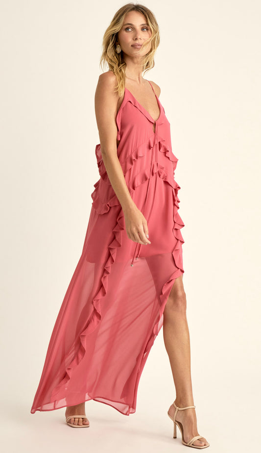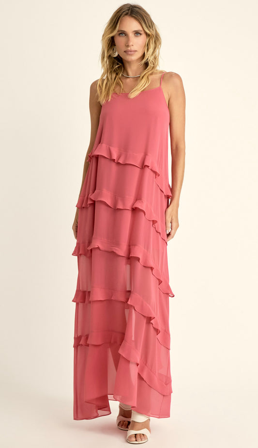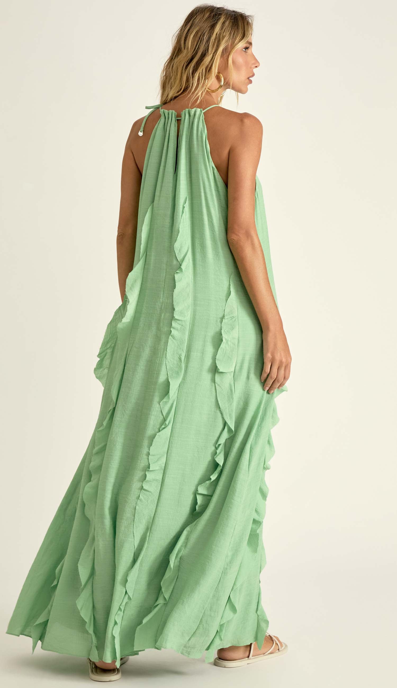 Vestido longo confeccionado em poliviscose texturizada com forro. Possui decote halter com franzidinhos na frente e nas costas, tirinhas embutidas no decote com ponteiras de metal em formato de conchinha para ajuste e fechamento por amarração, modelagem soltinha e recortes verticais em todo o comprimento da peça com aplicação de babados a fio estilo cascata.