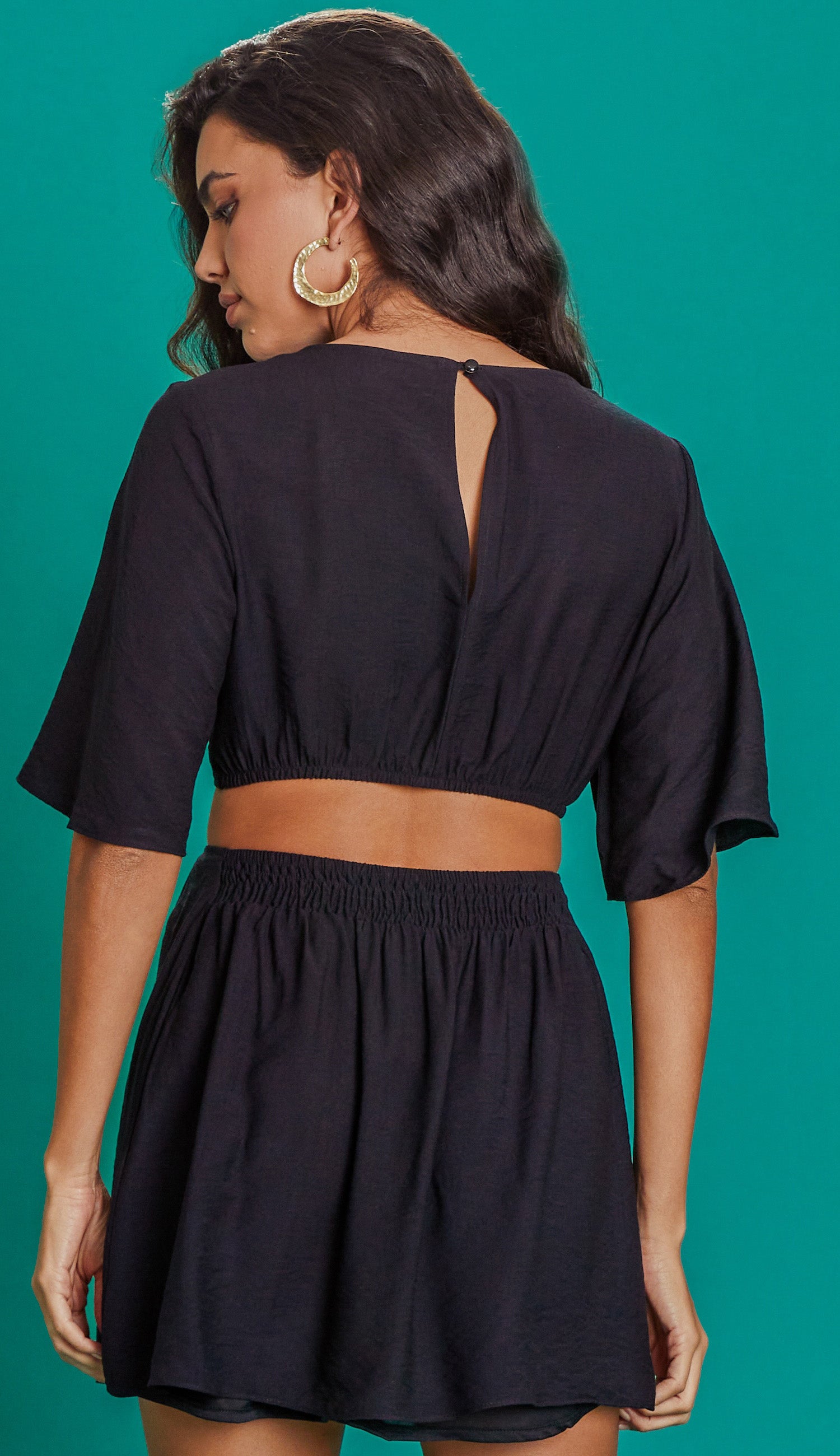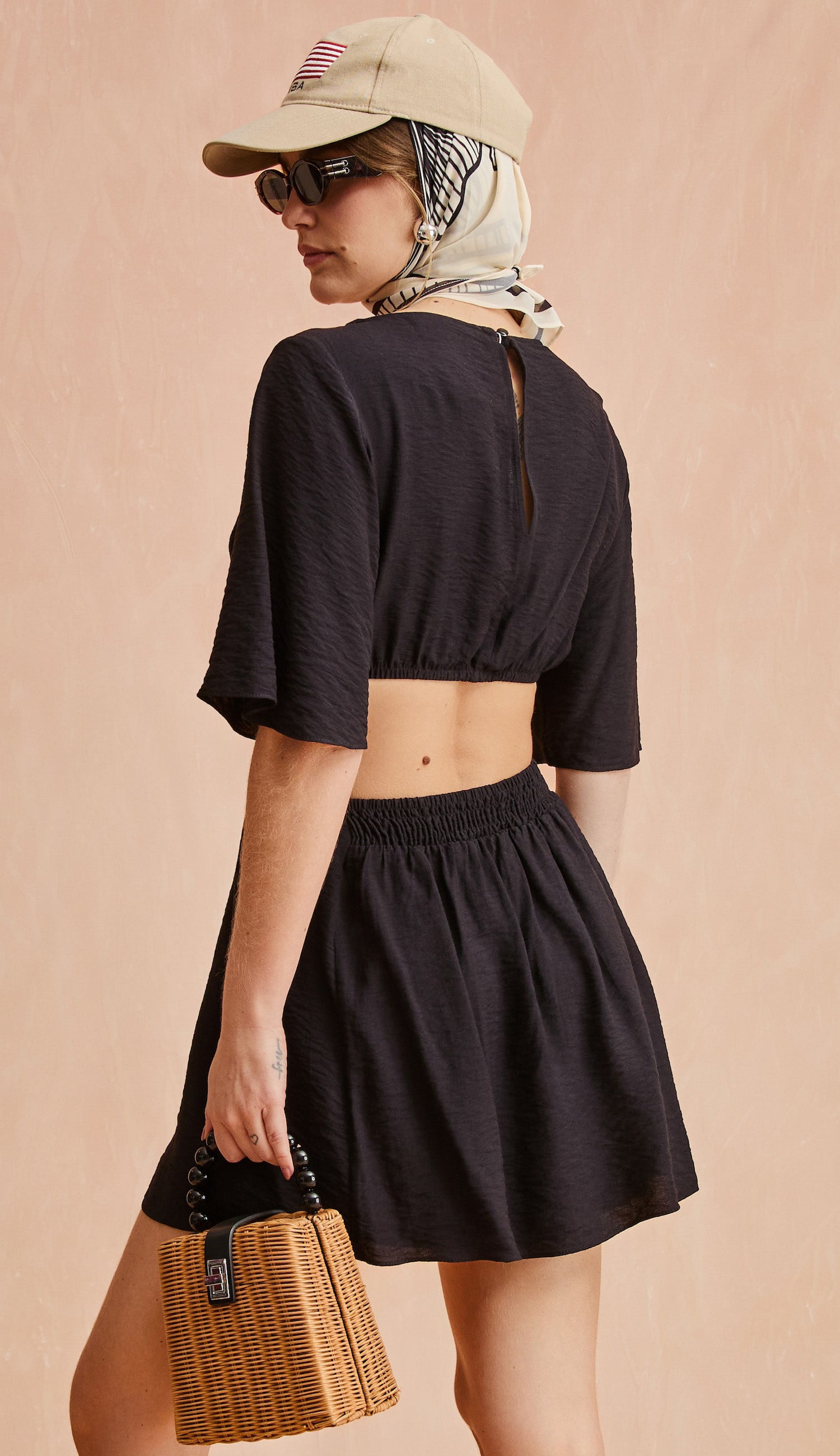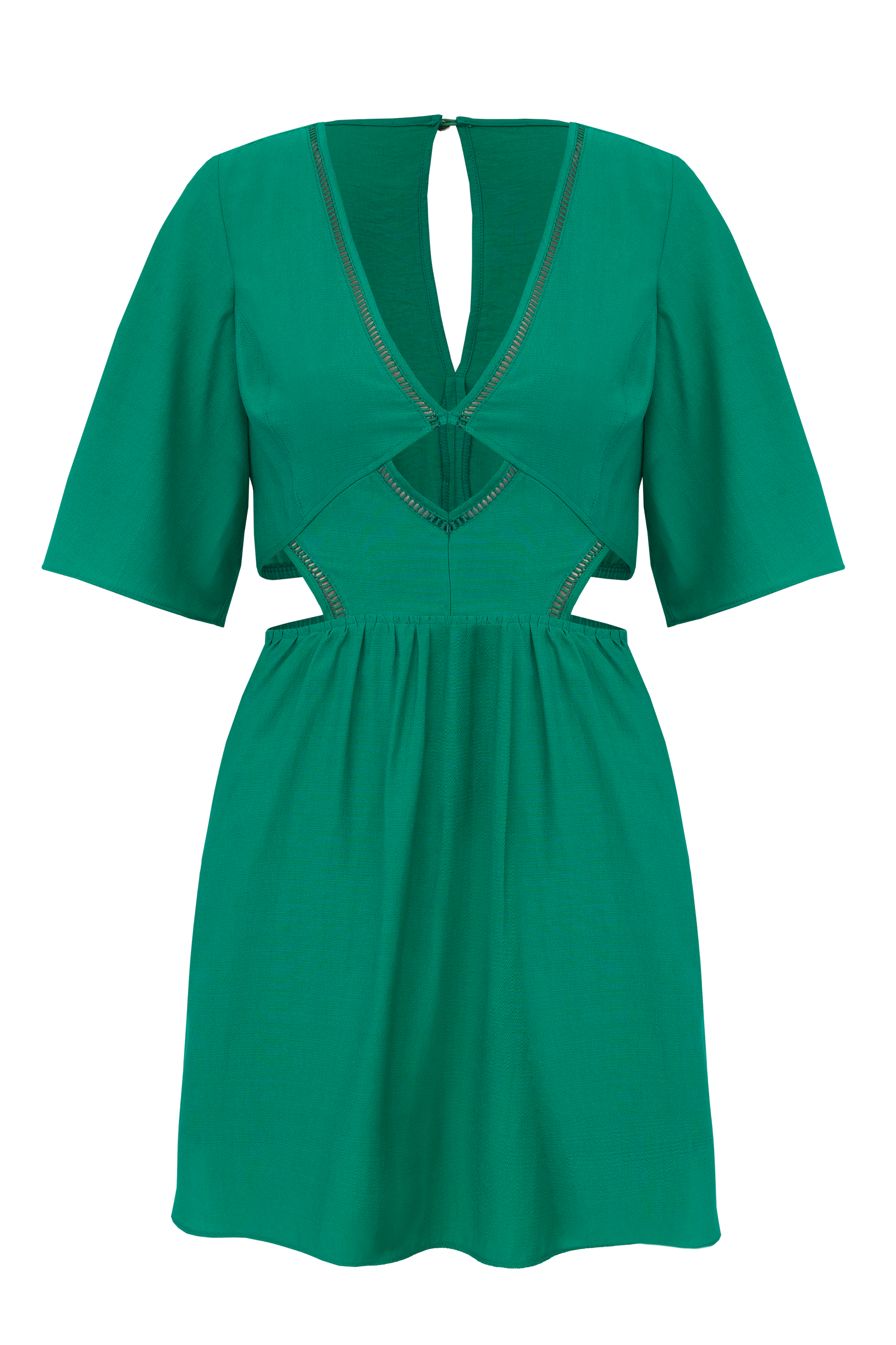 Vestido curto com forro, confeccionado em poliviscose mais encorpada com aspecto de linho. Possui decote em V, mangas curtas sino, busto fixo à saia apenas por recorte frontal que possui detalhes vazados e aplicação de entremeio, toda a região da cintura fica à mostra, a saia é evasê com franzidinhos e nas costas, conta com elástico franzido, fechamento por botão esmaltado na gola da blusa e lastex franzido na saia.