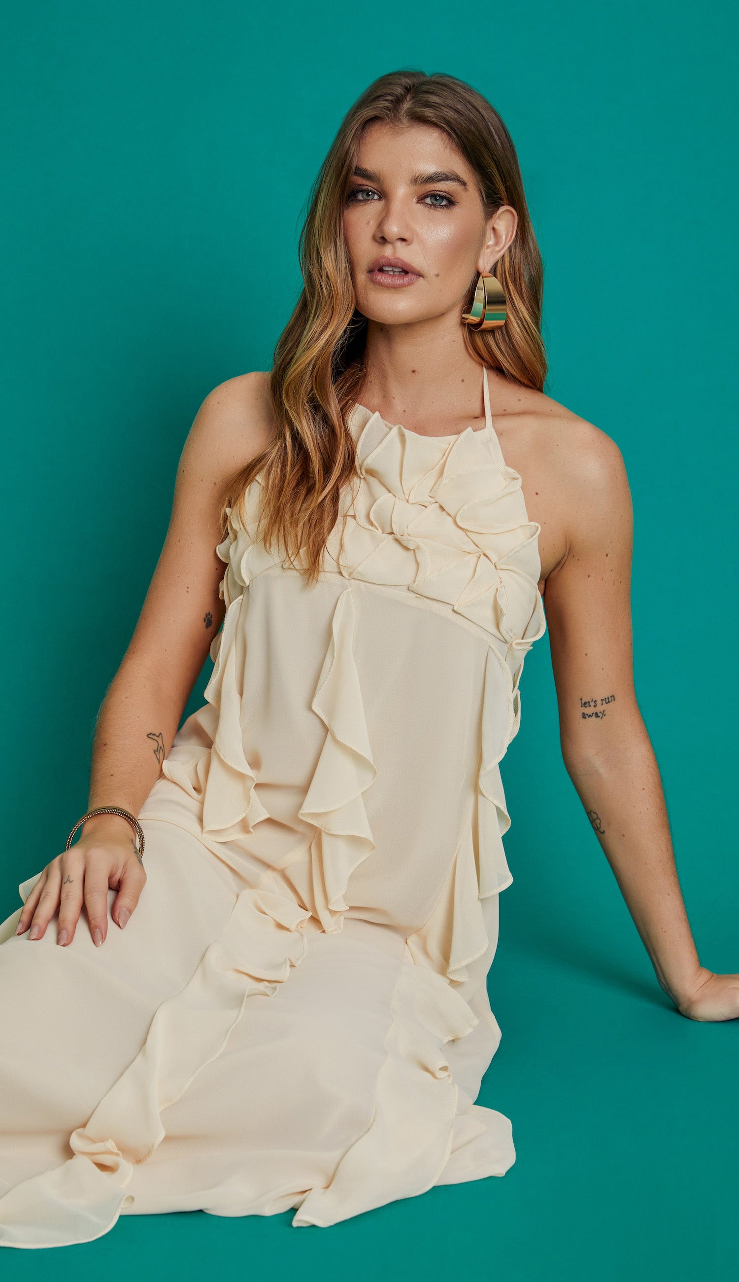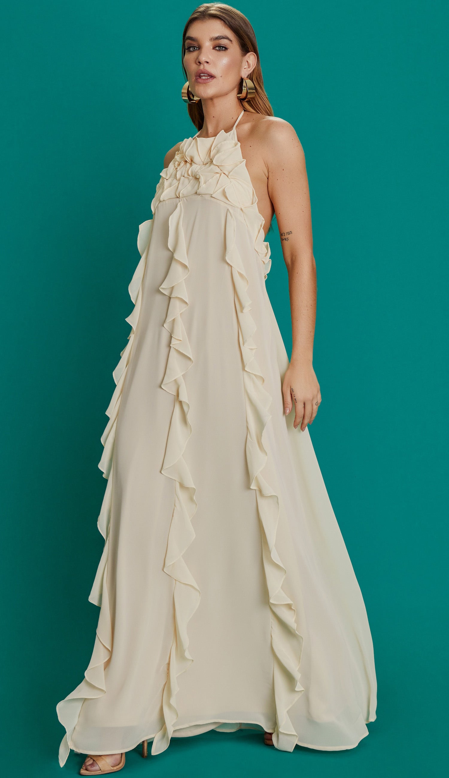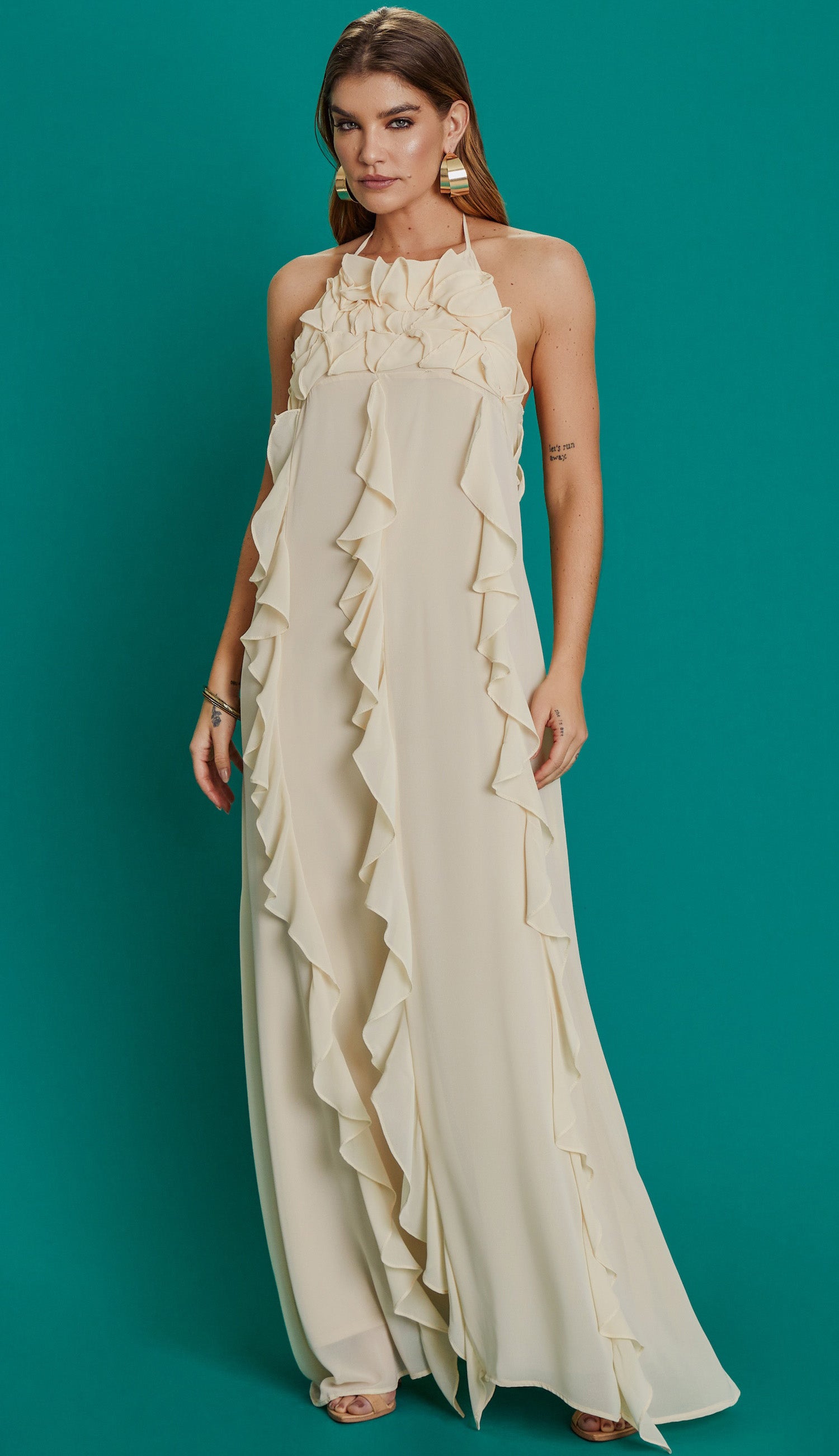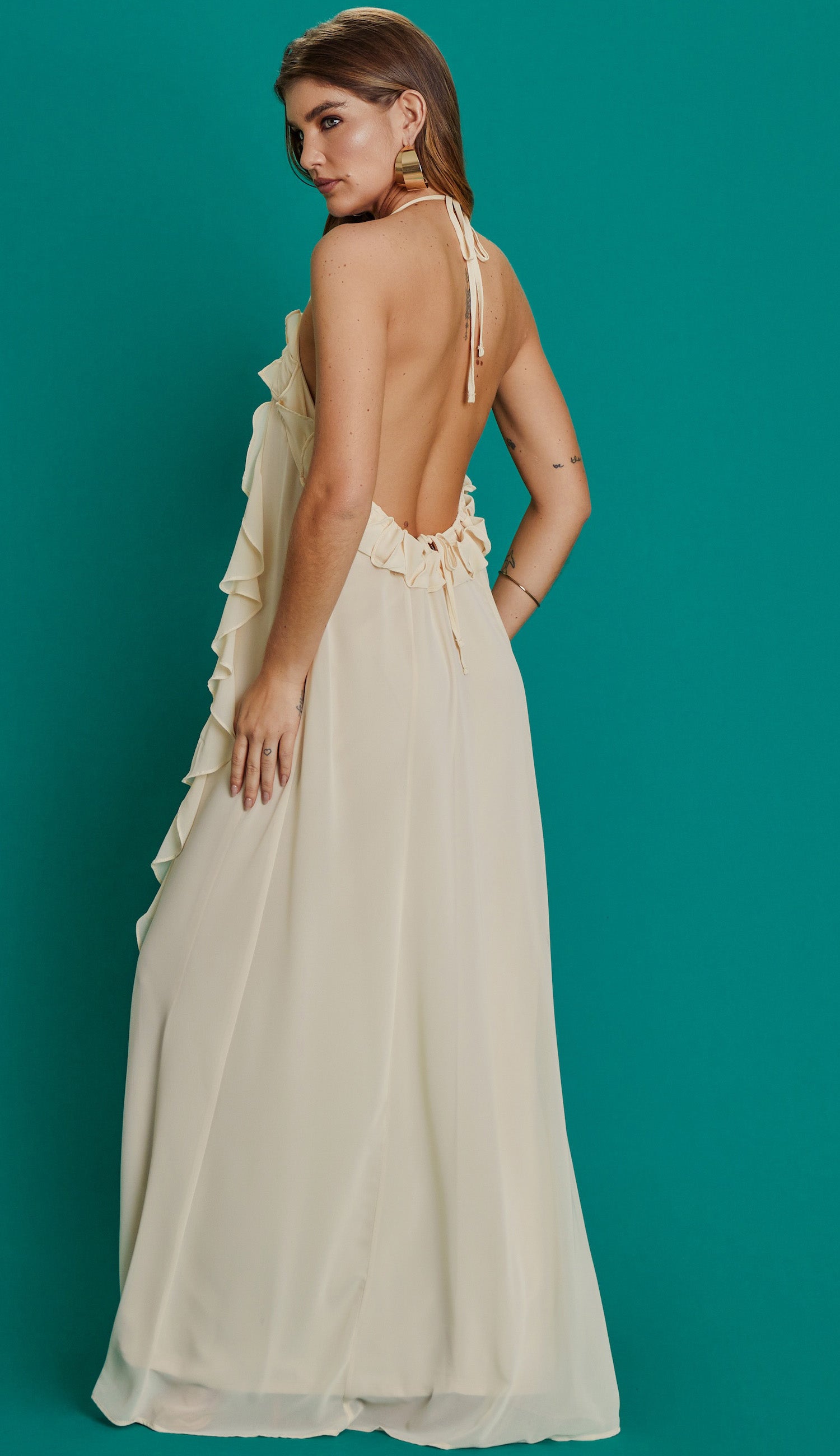 Vestido longo confeccionado em crepe com forro. Possui modelagem frente única, decote halter com babadinhos que vão até as costas, alcinhas para amarração no pescoço, babadinhos verticais também na parte da frente do comprimento da peça, saia bem solta e fluida e costas nuas com tirinha embutida para ajuste do decote e amarração.