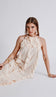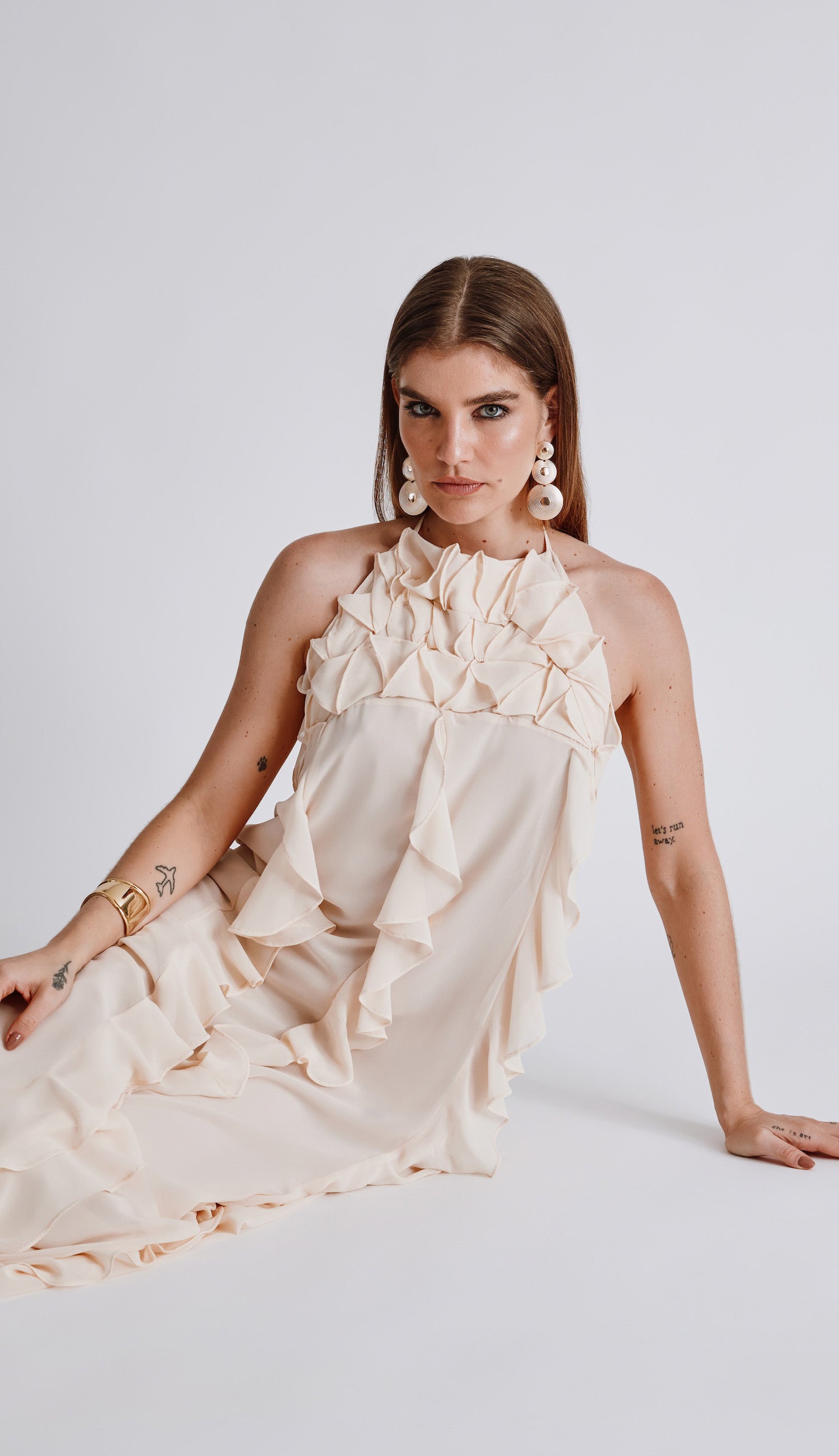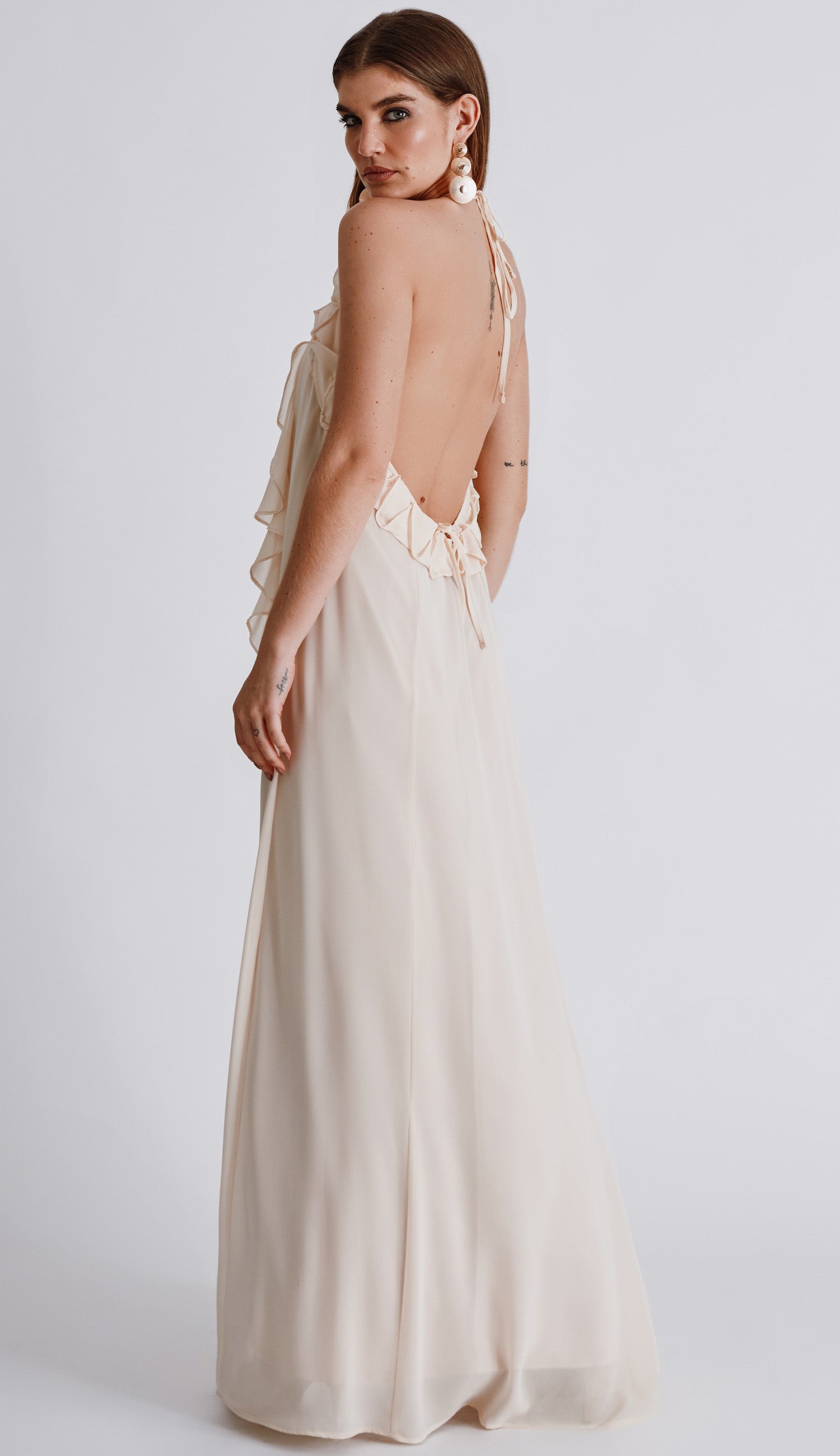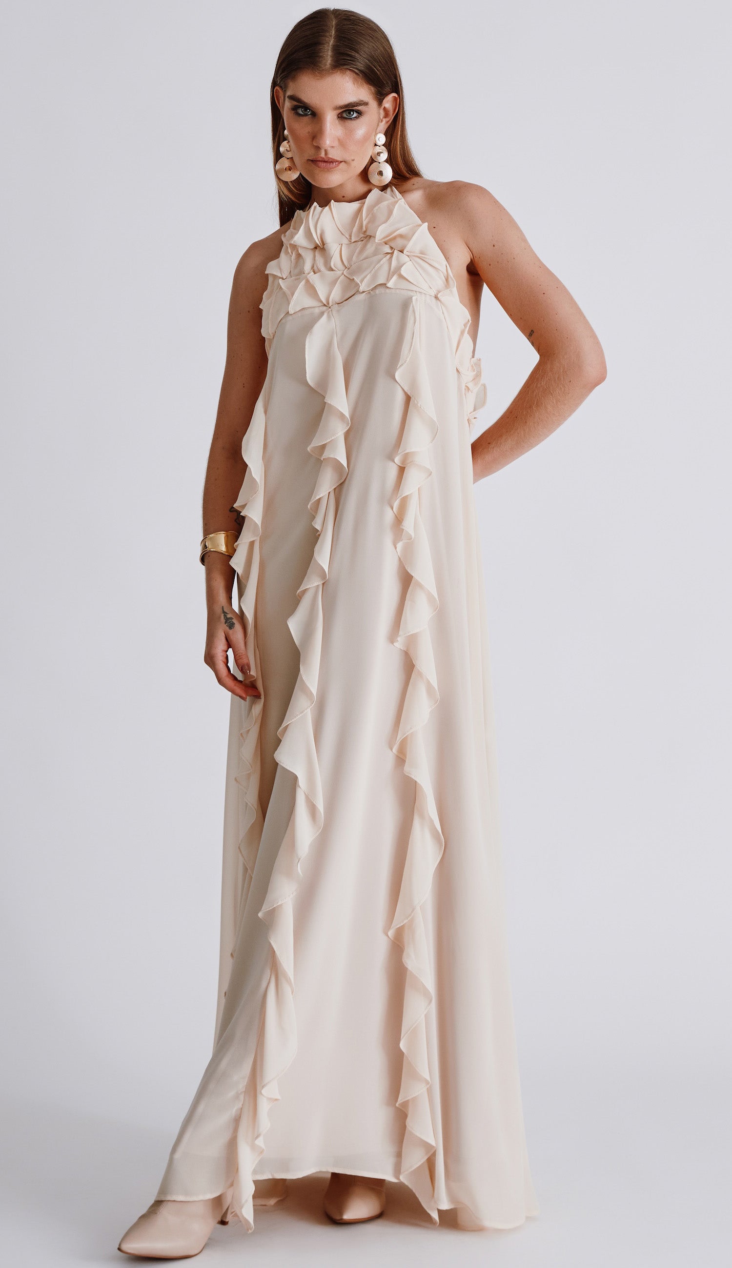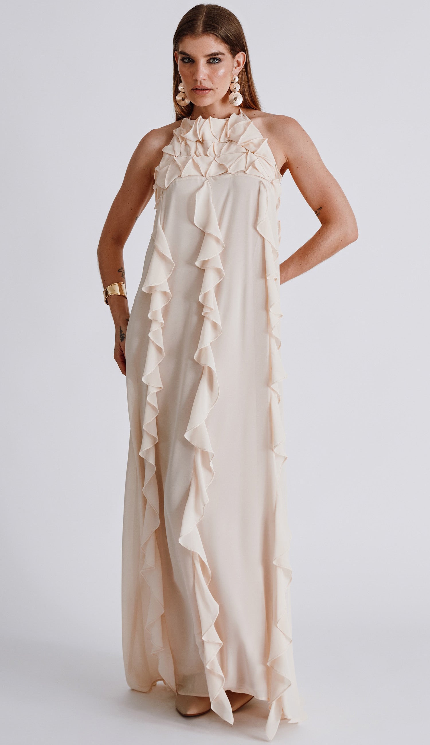 Vestido longo confeccionado em crepe com forro. Possui modelagem frente única, decote halter com babadinhos que vão até as costas, alcinhas para amarração no pescoço, babadinhos verticais também na parte da frente do comprimento da peça, saia bem solta e fluida e costas nuas com tirinha embutida para ajuste do decote e amarração.