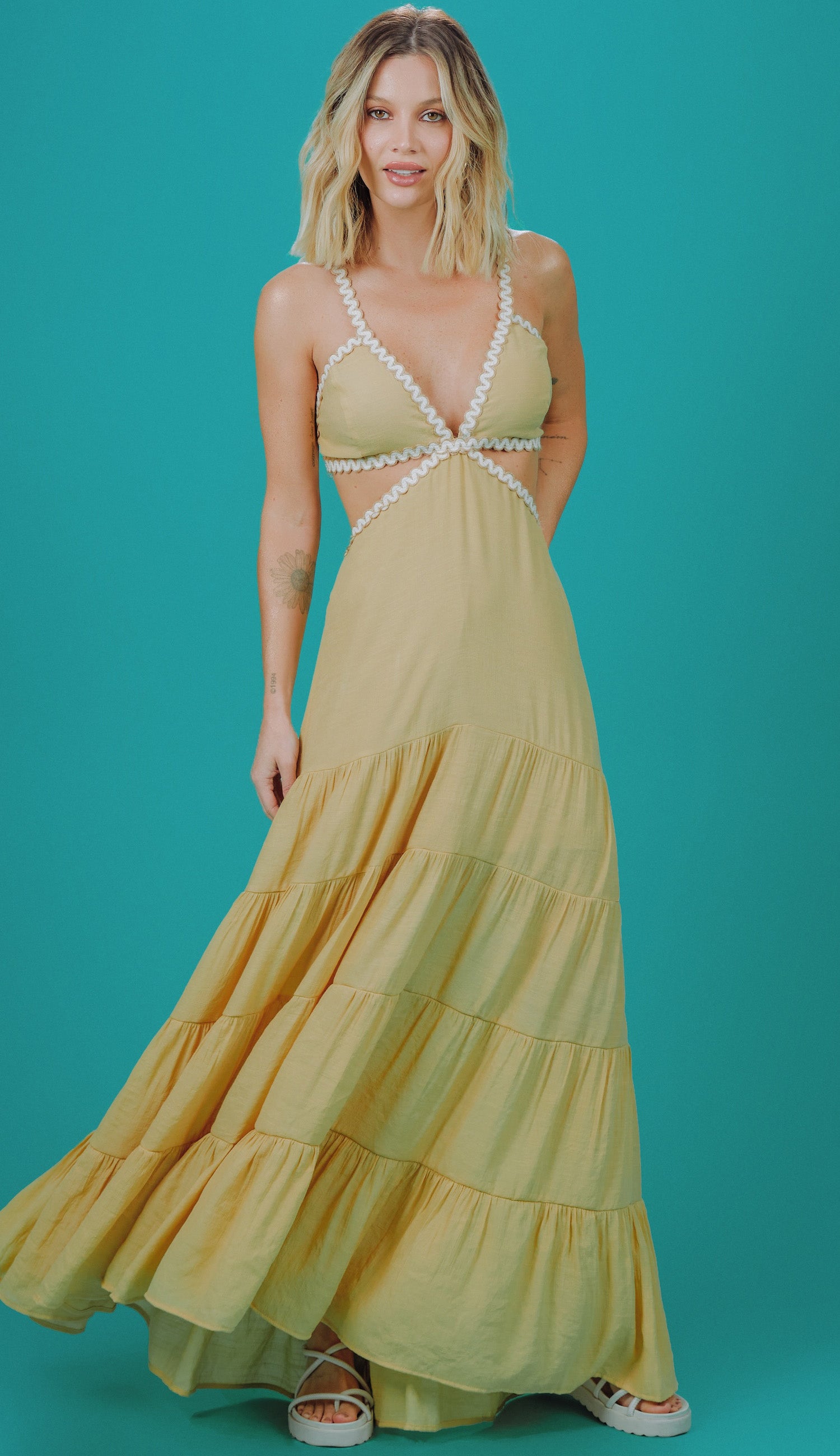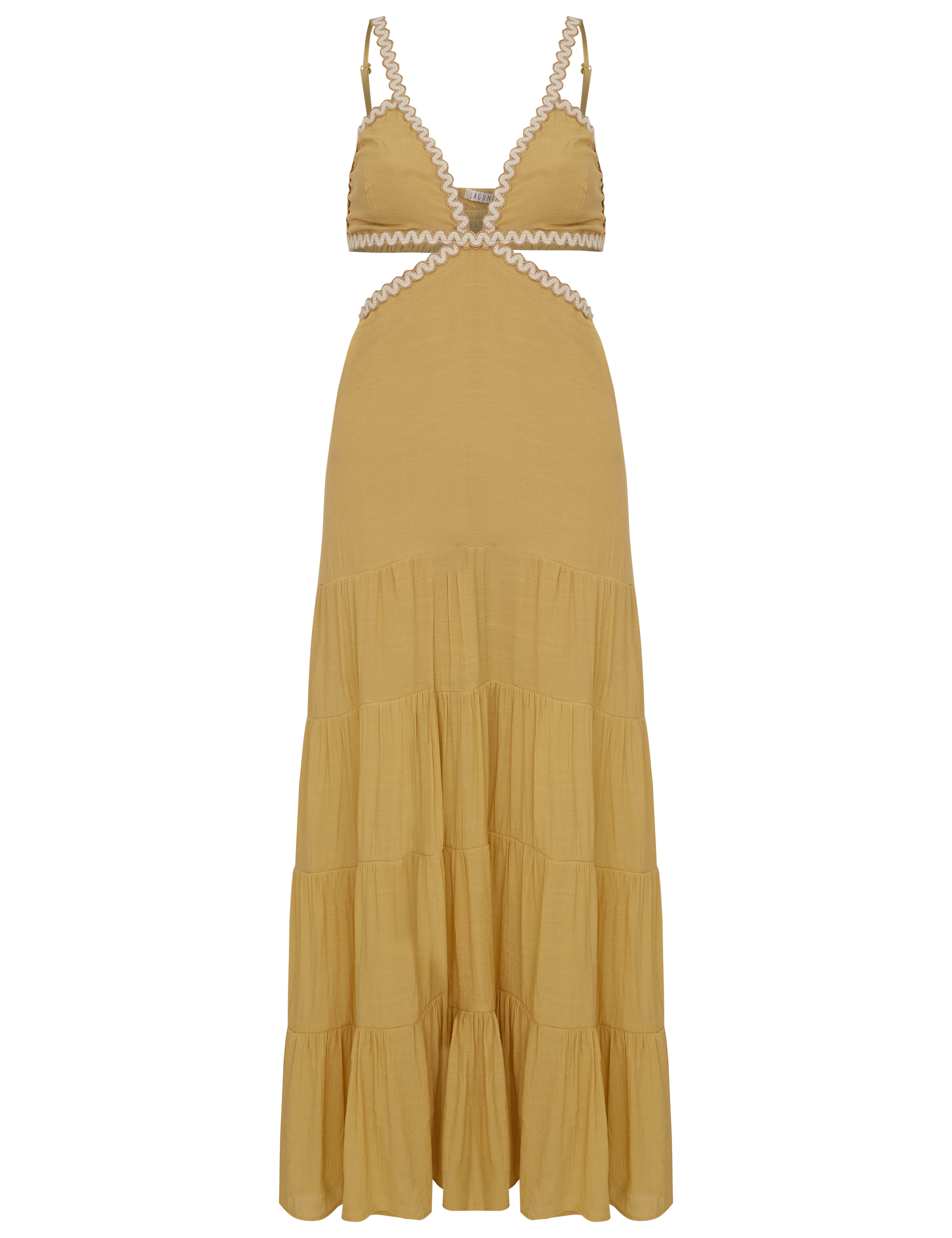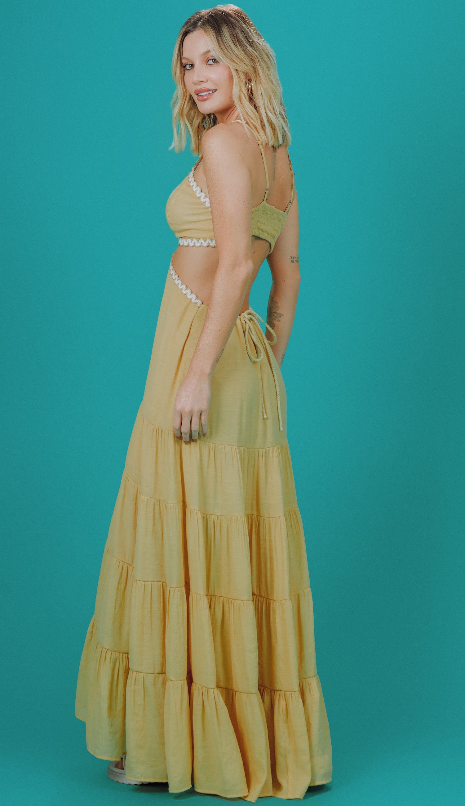Vestido longo com forro, confeccionado em poliviscose texturizado com aspecto de linho e efeito amassadinho. Possui decote profundo em V, lastex franzido nas costas e aplicação de rendas com sisal entrelaçados bicolor até as alças, que são finas e reguláveis, e também na cintura, aonde conta com um recorte que deixa a região á mostra. A saia conta com recortes em camadas e franzidos, cordão traseiro para ajuste e amarração.