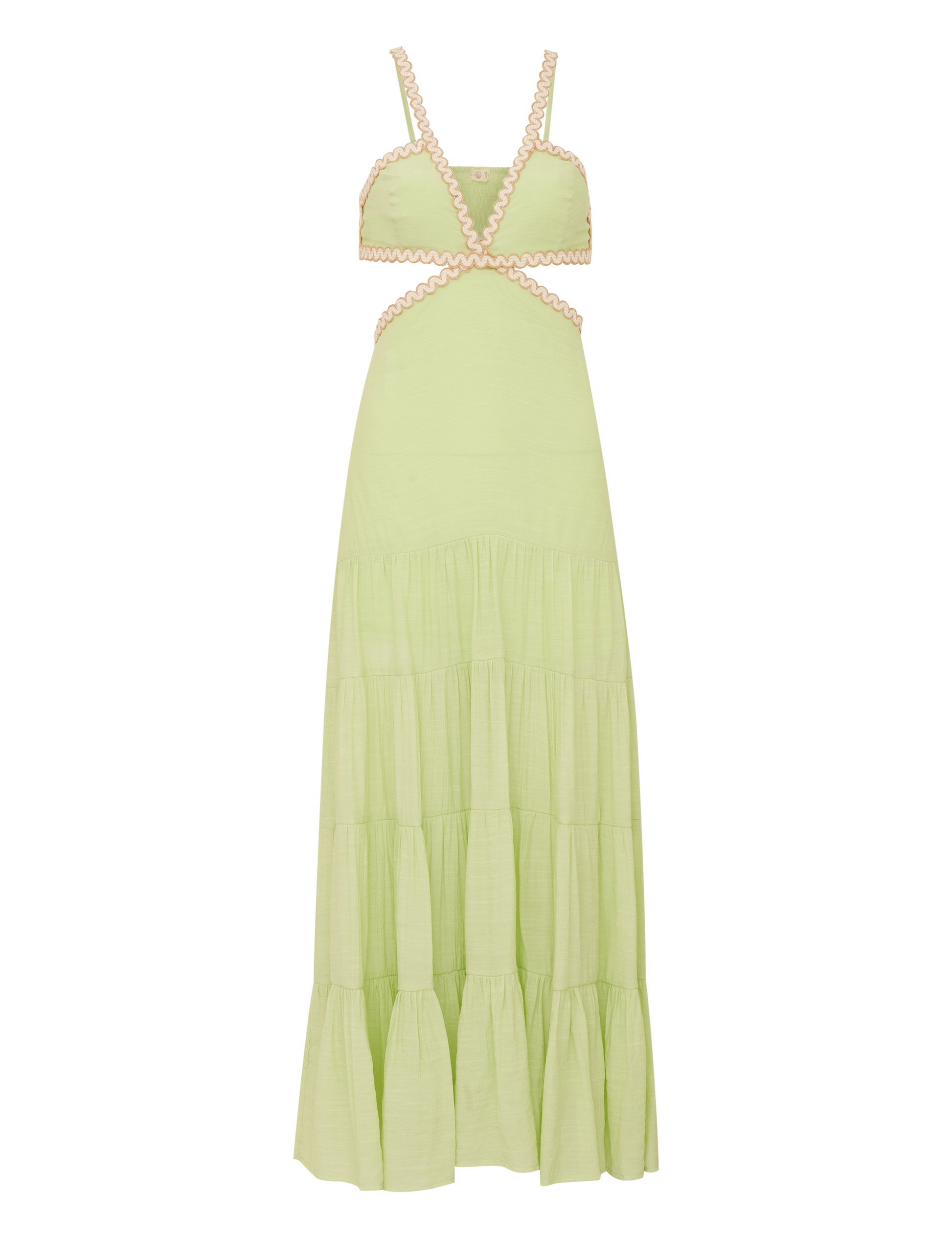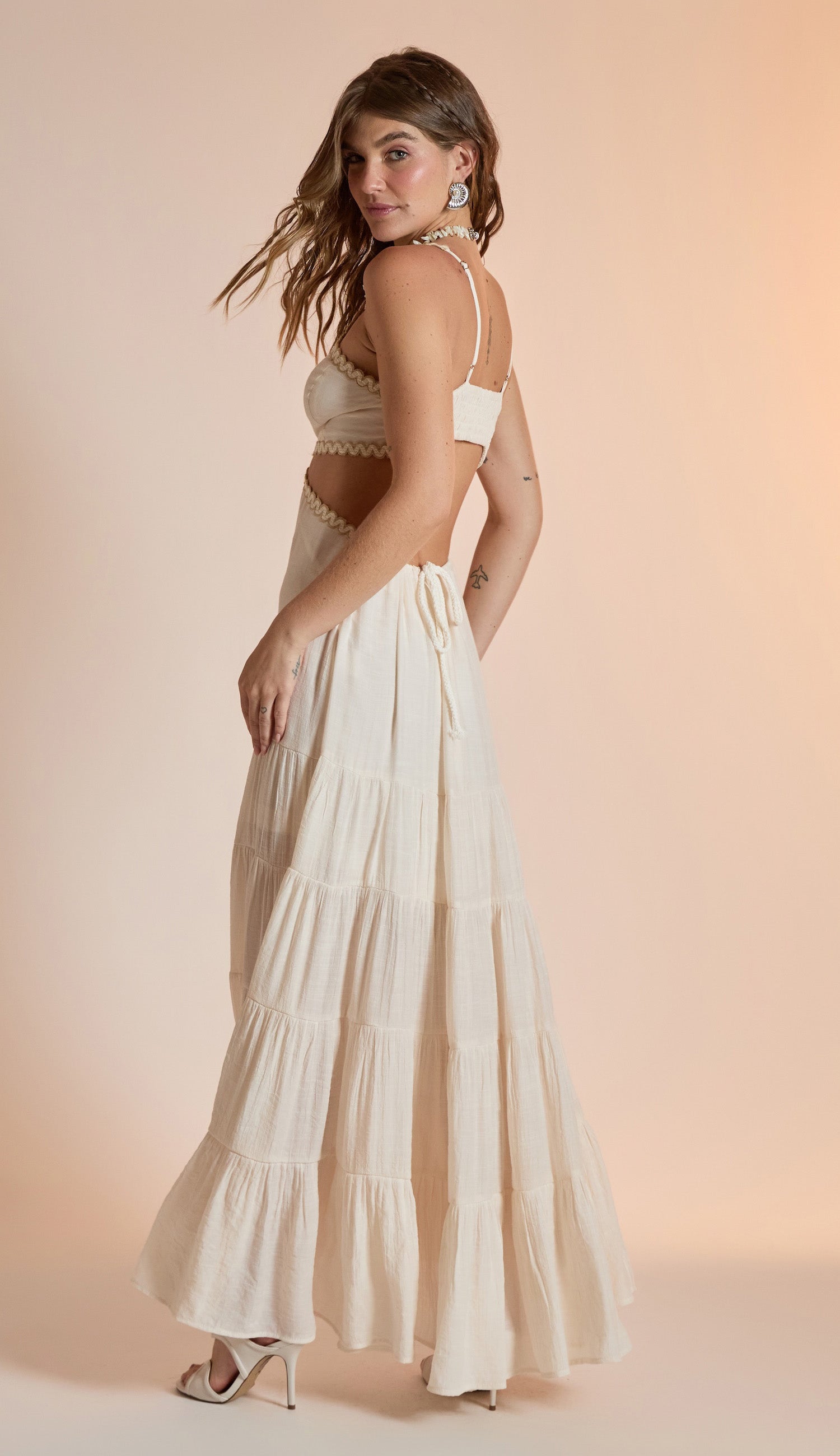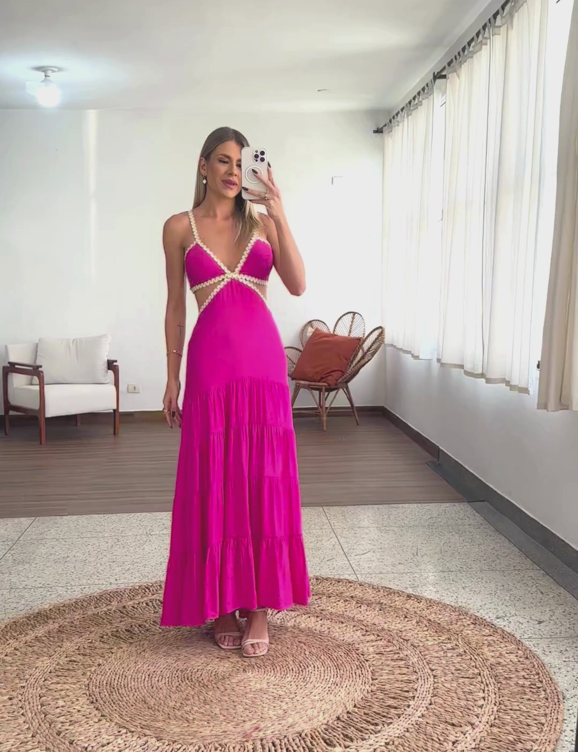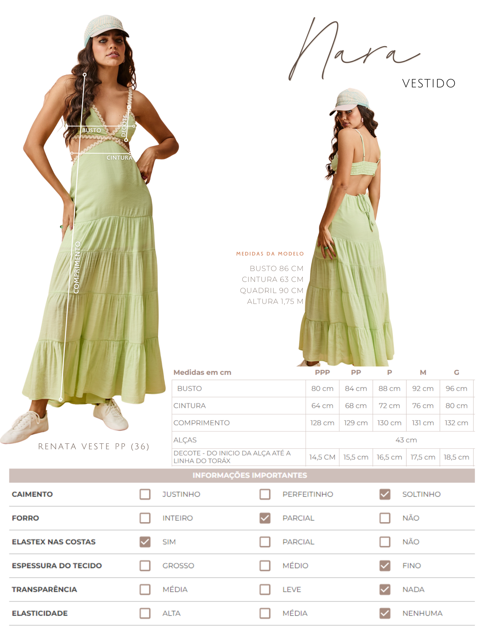 Vestido longo com forro, confeccionado em poliviscose texturizado com aspecto de linho e efeito amassadinho. Possui decote profundo em V, lastex franzido nas costas e aplicação de rendas com sisal entrelaçados bicolor até as alças, que são finas e reguláveis, e também na cintura, aonde conta com um recorte que deixa a região á mostra. A saia conta com recortes em camadas e franzidos, cordão traseiro para ajuste e amarração.