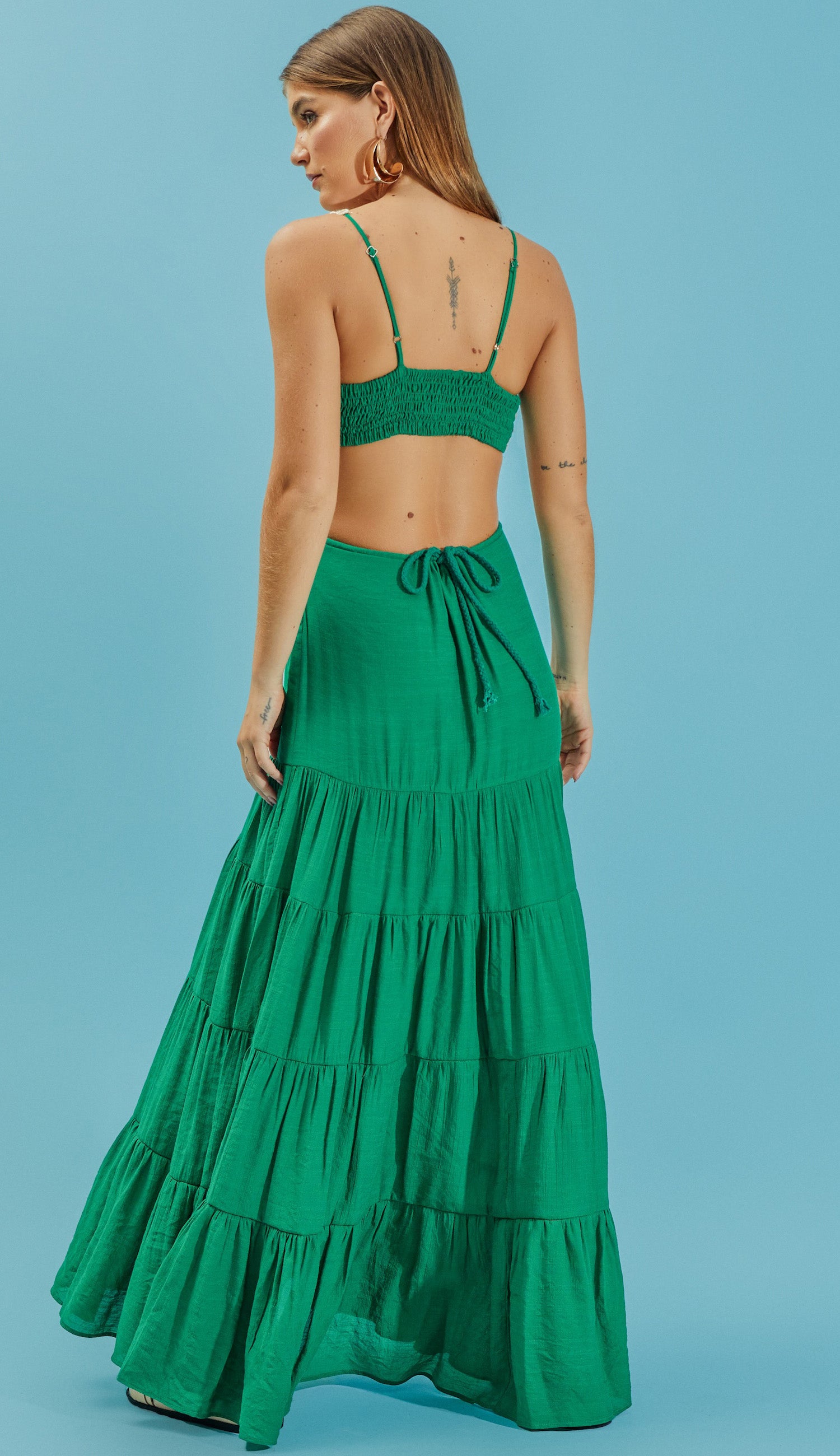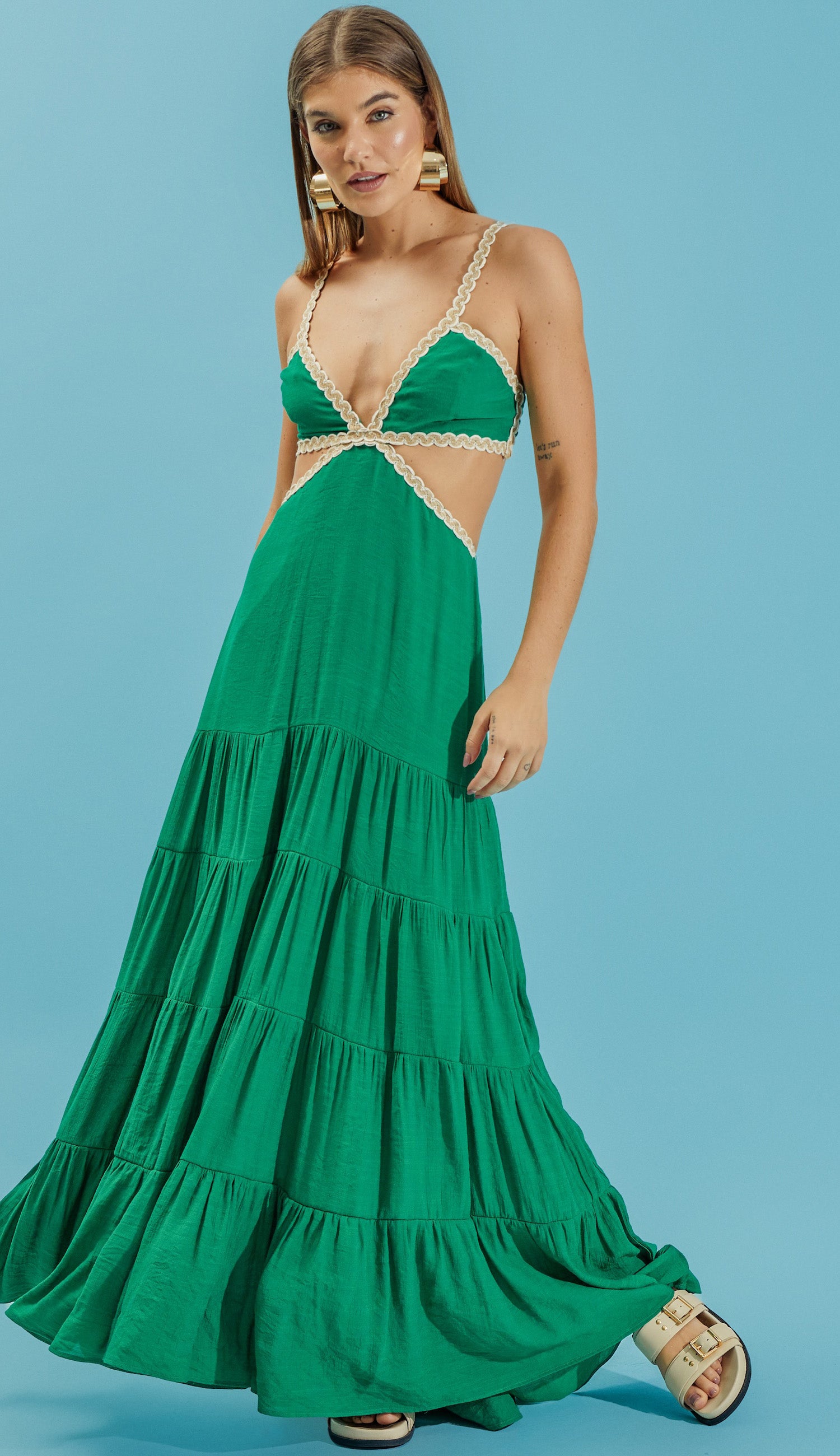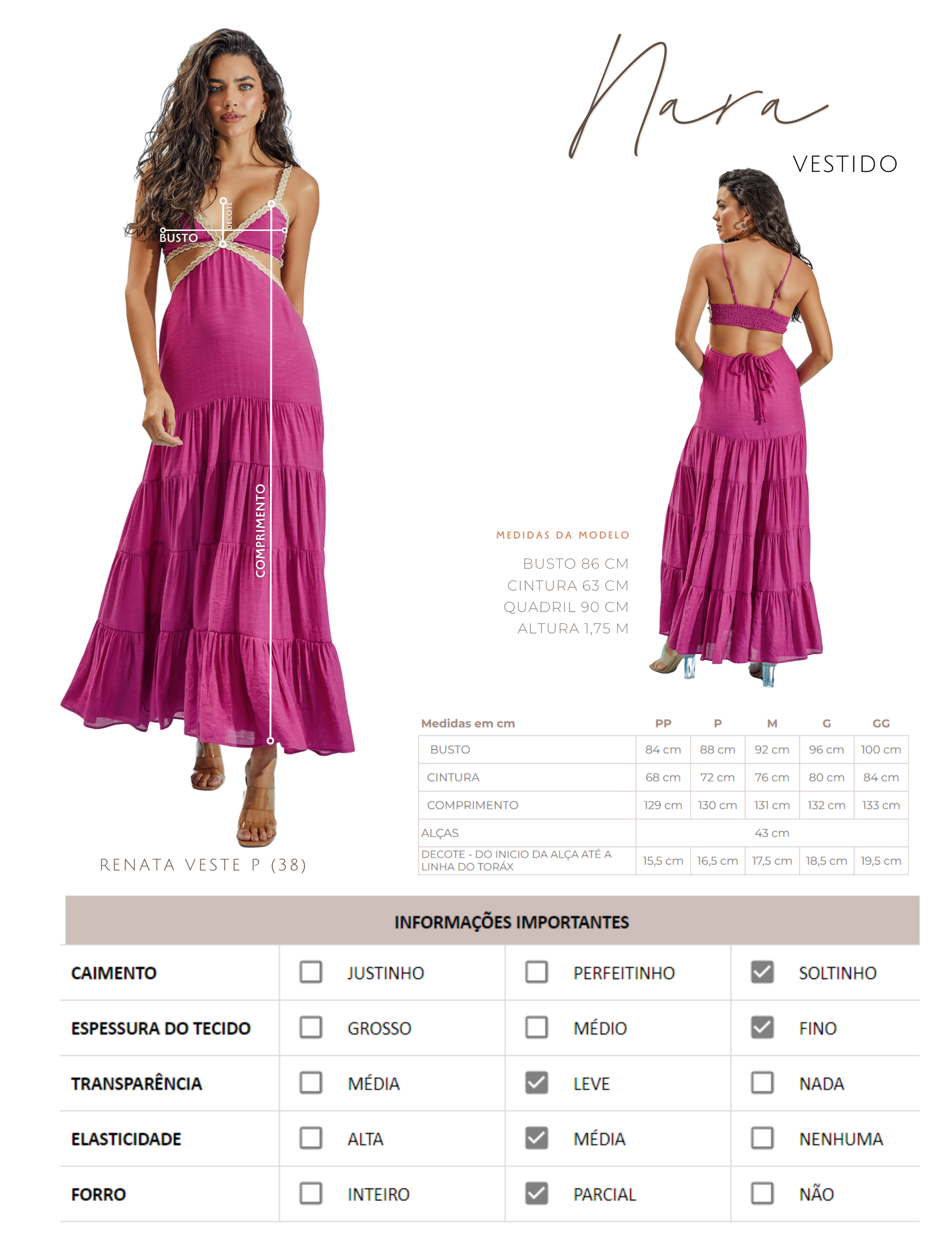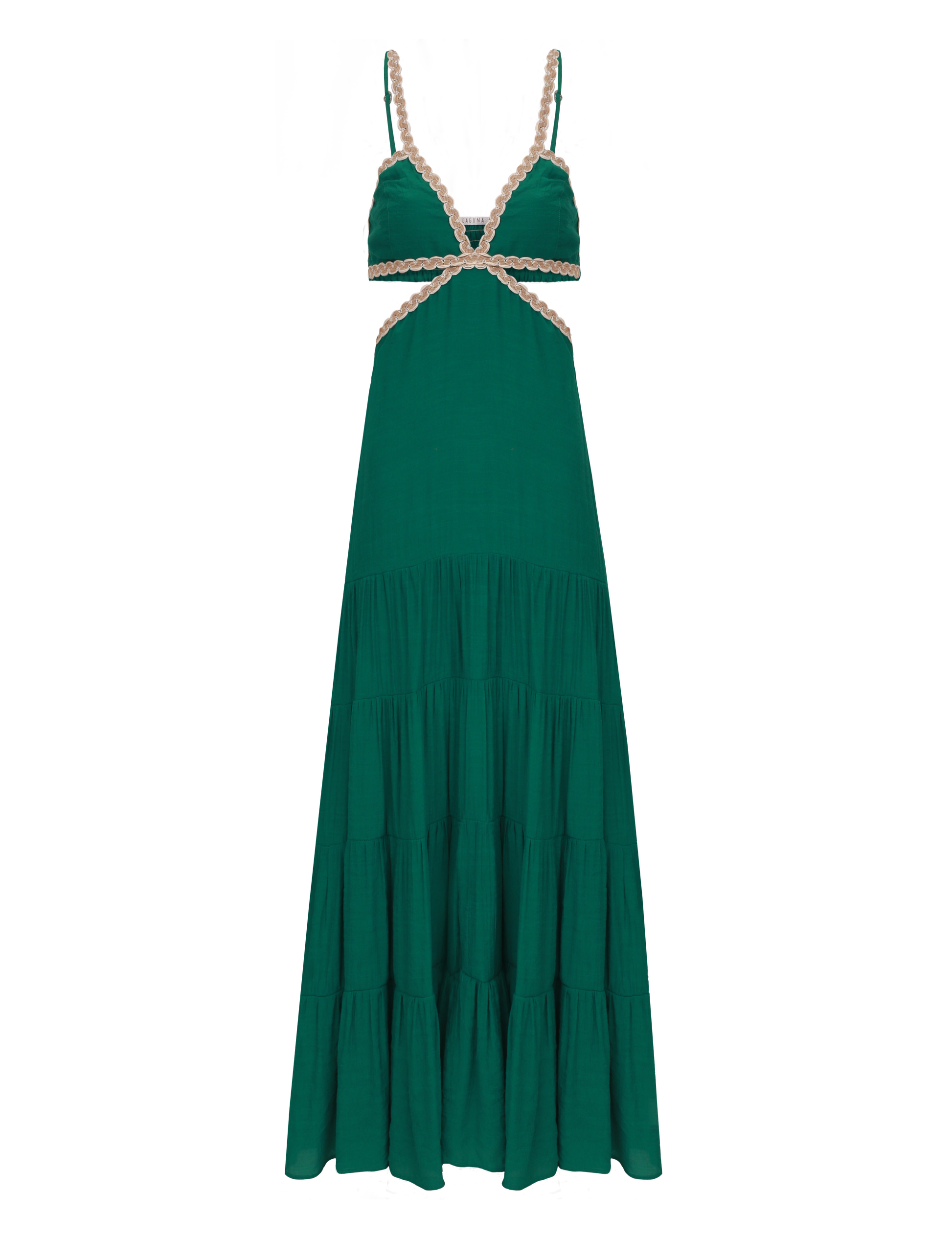 Vestido longo com forro, confeccionado em poliviscose texturizado com aspecto de linho e efeito amassadinho. Possui decote profundo em V, lastex franzido nas costas e aplicação de rendas com sisal entrelaçados bicolor até as alças, que são finas e reguláveis, e também na cintura, aonde conta com um recorte que deixa a região á mostra. A saia conta com recortes em camadas e franzidos, cordão traseiro para ajuste e amarração.