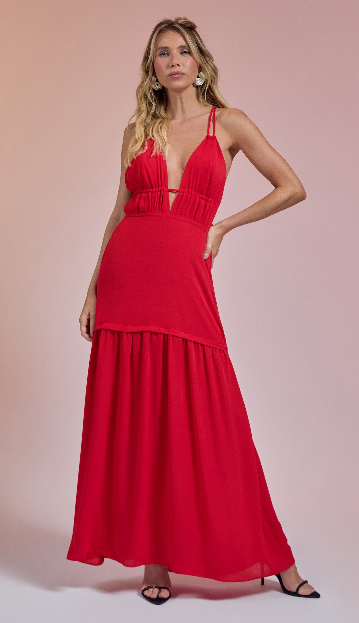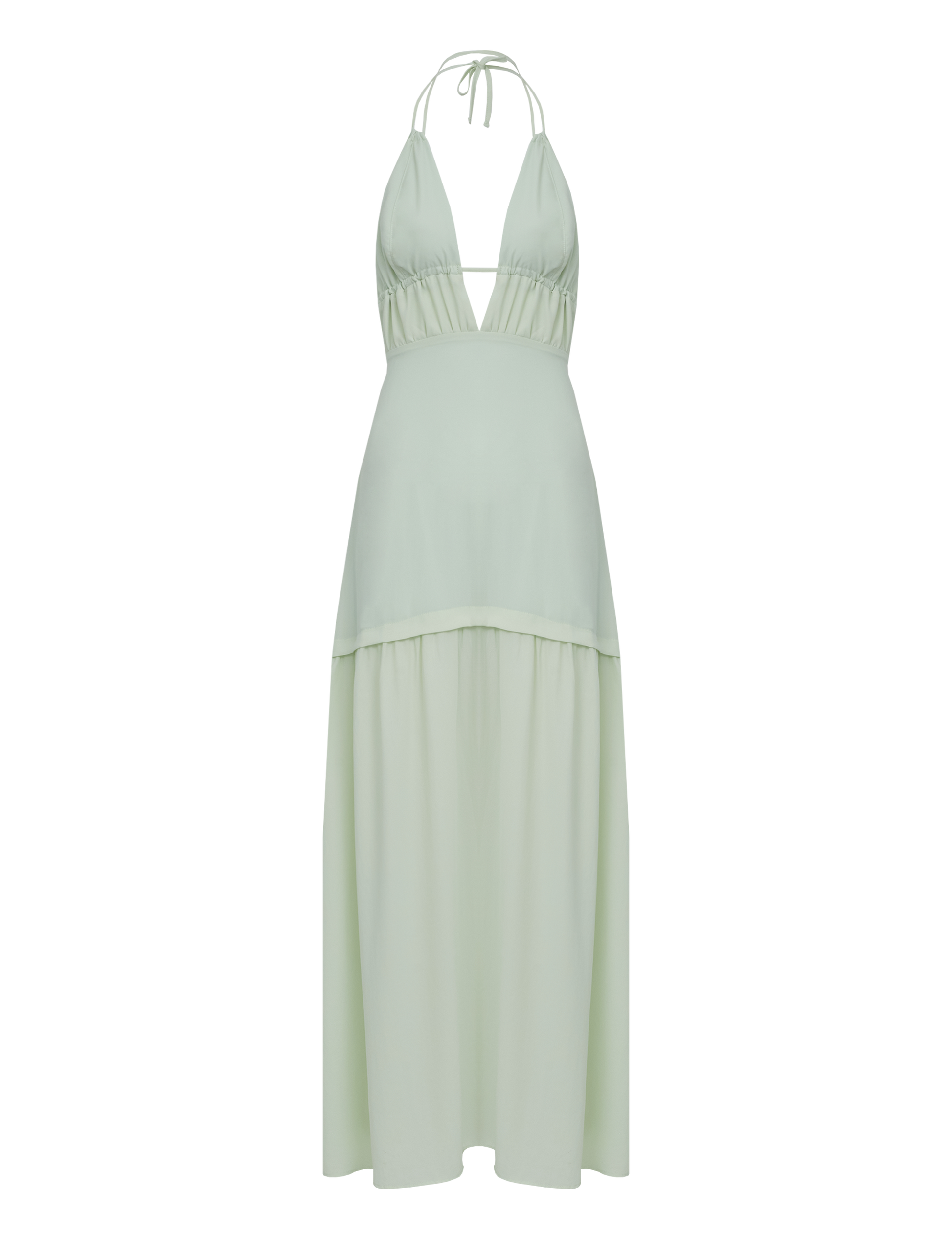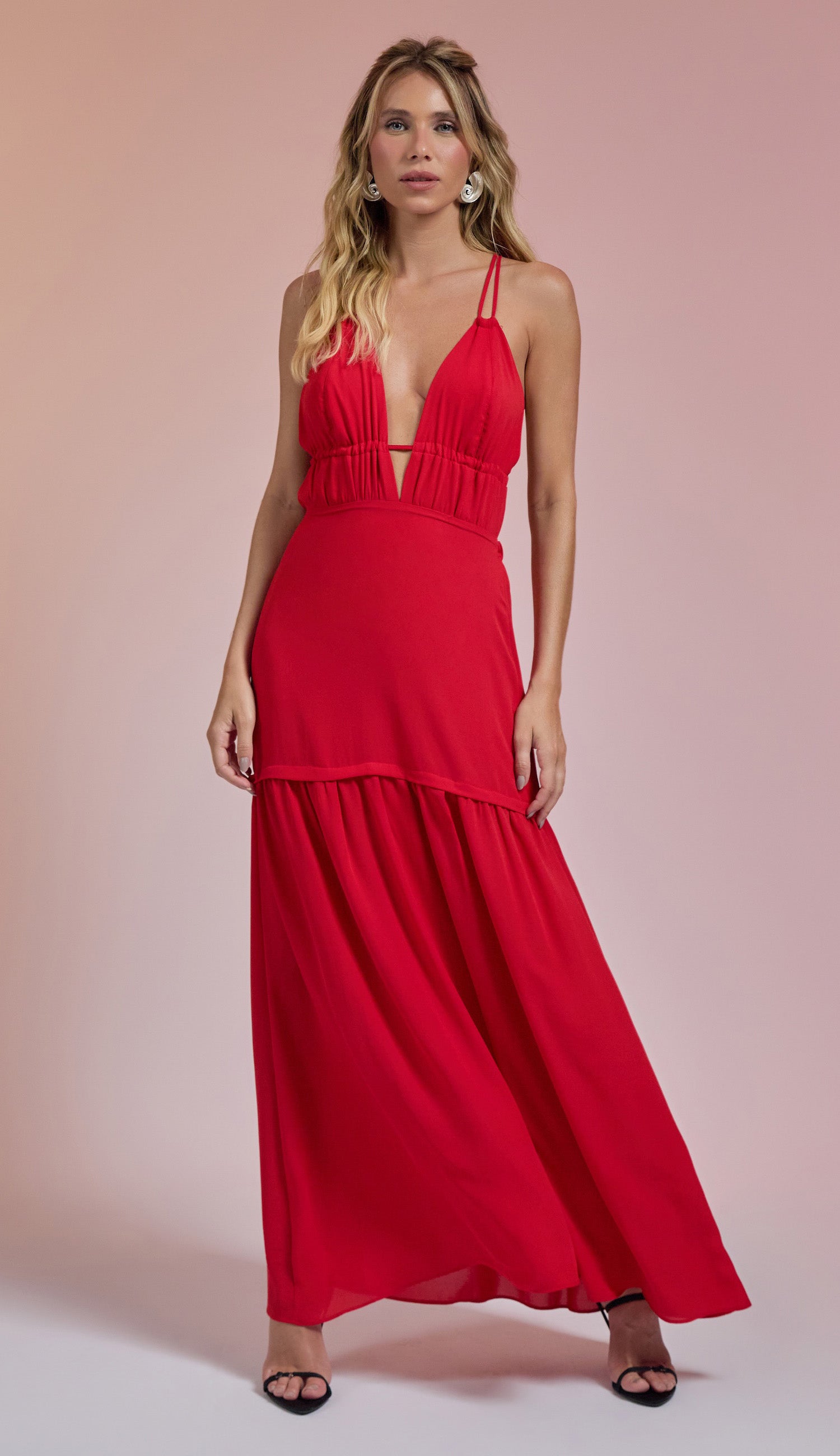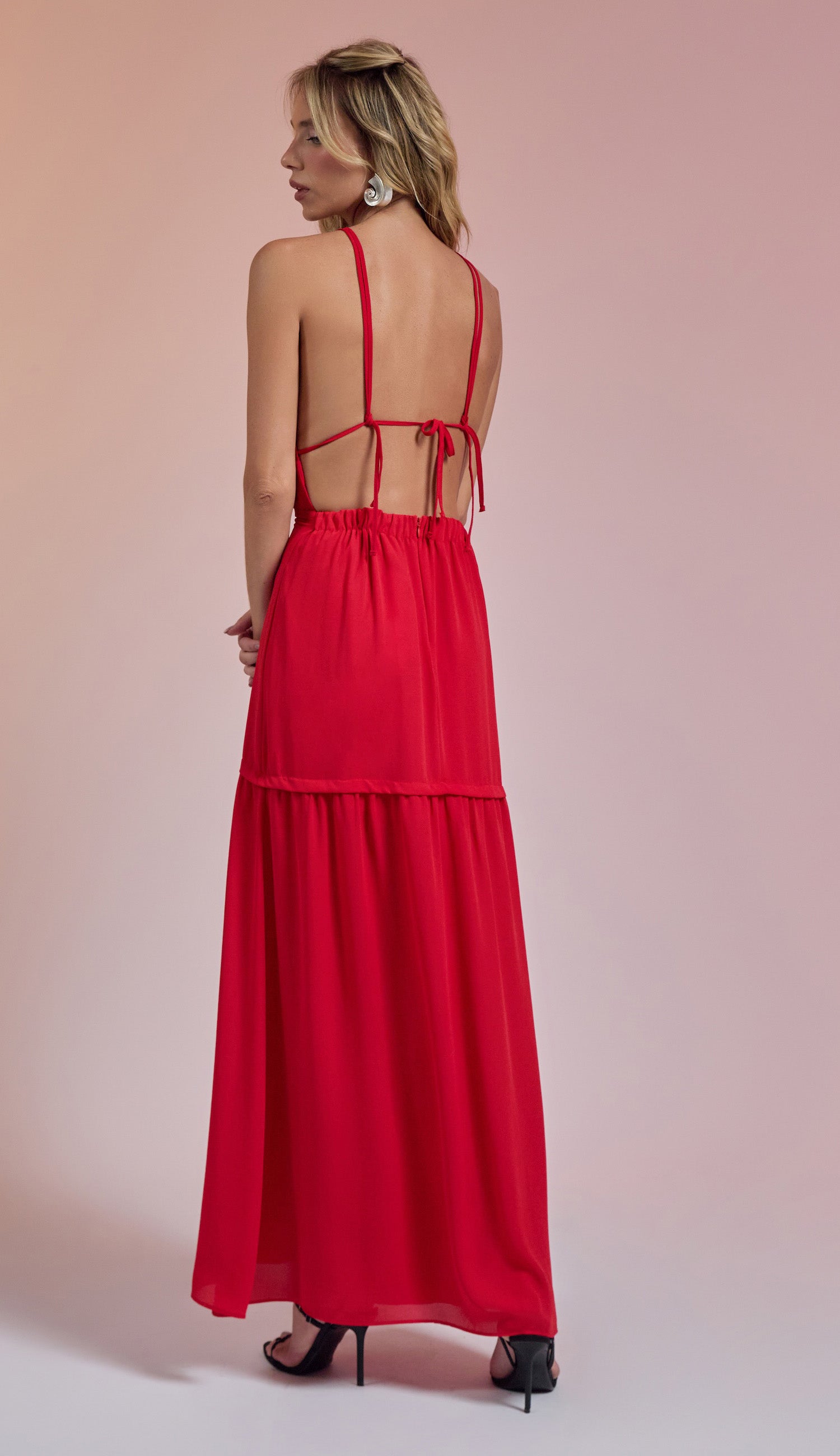 Vestido longo frente única confeccionado em crepe com forro. Possui decote em V profundo, tirinhas para amarrar no pescoço e tirinhas embutidas logo abaixo do busto para amarração nas costas, seguido de recorte com franzidinhos; na saia conta com elástico nas costas, fechamento traseiro por zíper invisível e recorte com franzidinhos.