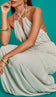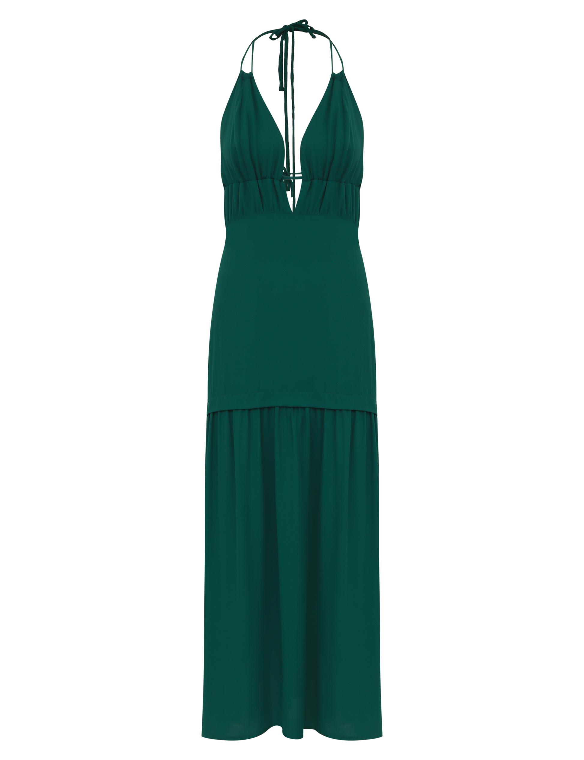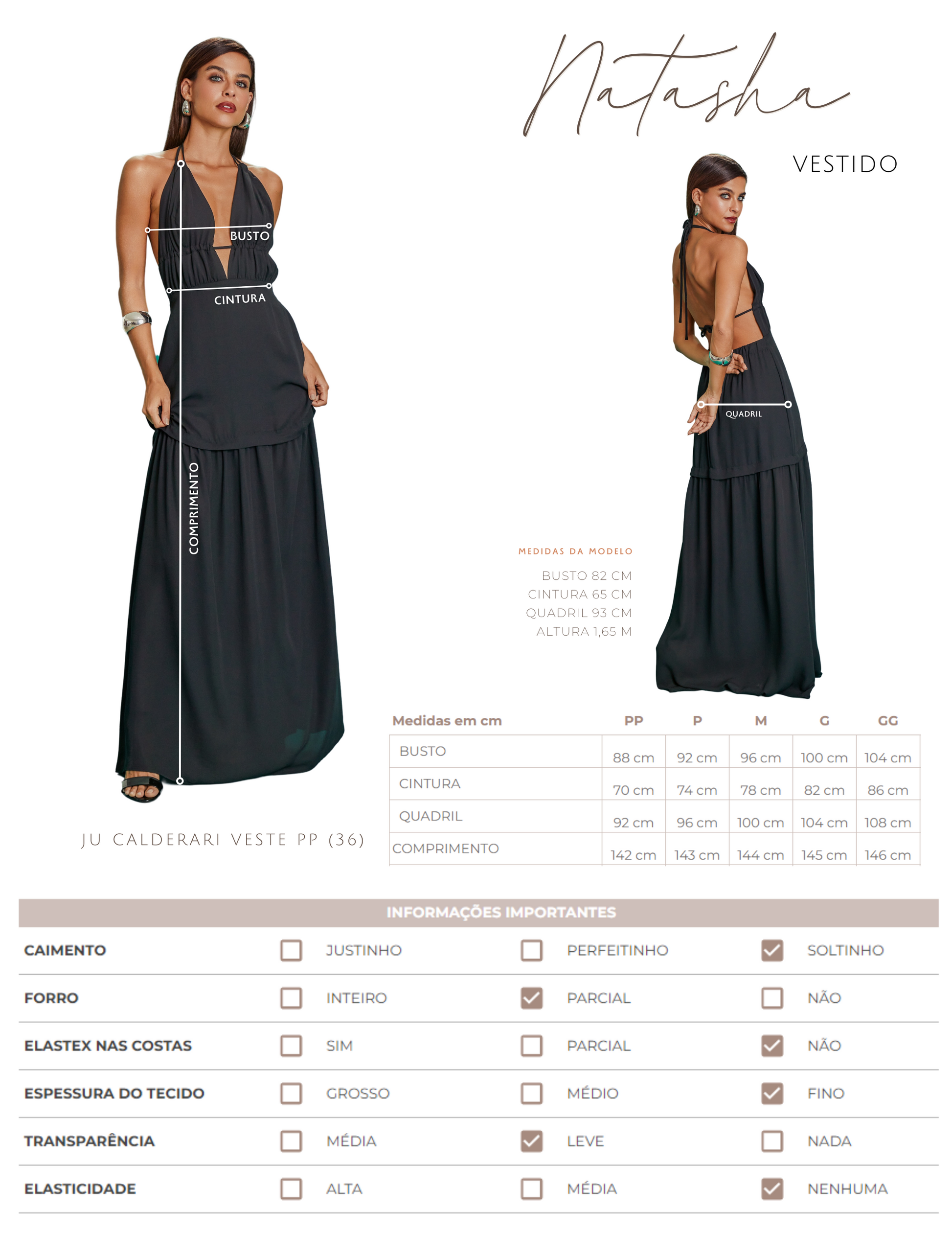 Vestido longo frente única confeccionado em crepe com forro. Possui decote em V profundo, tirinhas para amarrar no pescoço e tirinhas embutidas logo abaixo do busto para amarração nas costas, seguido de recorte com franzidinhos; na saia conta com elástico nas costas, fechamento traseiro por zíper invisível e recorte com franzidinhos.