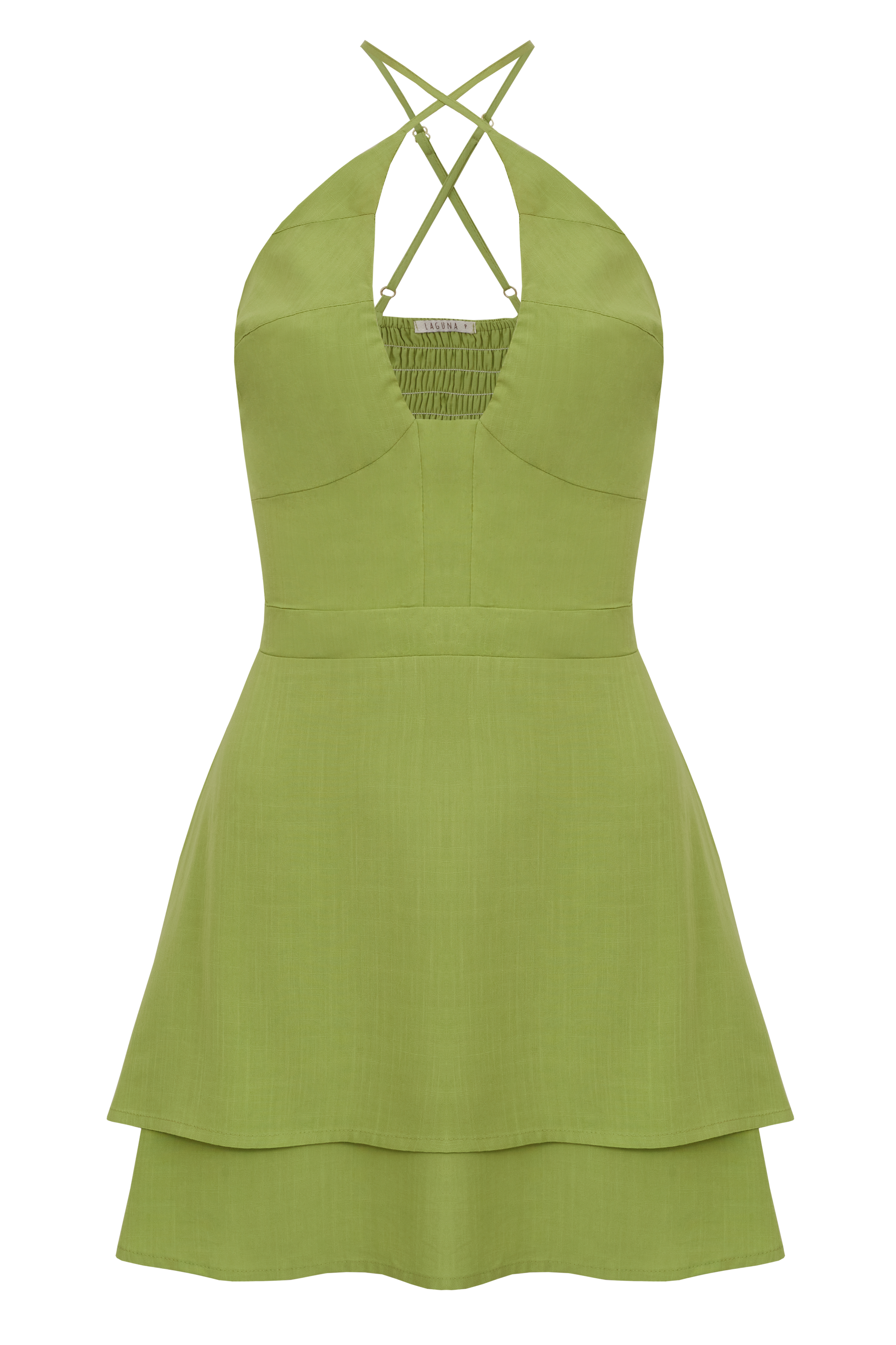 Vestido curto confeccionado em viscose com toque e aspecto de linho. Possui decote em U profundo com elástico interno para melhor ajuste, recortes geométricos no busto e na cintura que modelam a peça, alcinhas reguláveis, saia evasê com duas camadas sobrepostas e lastex franzido nas costas.
