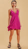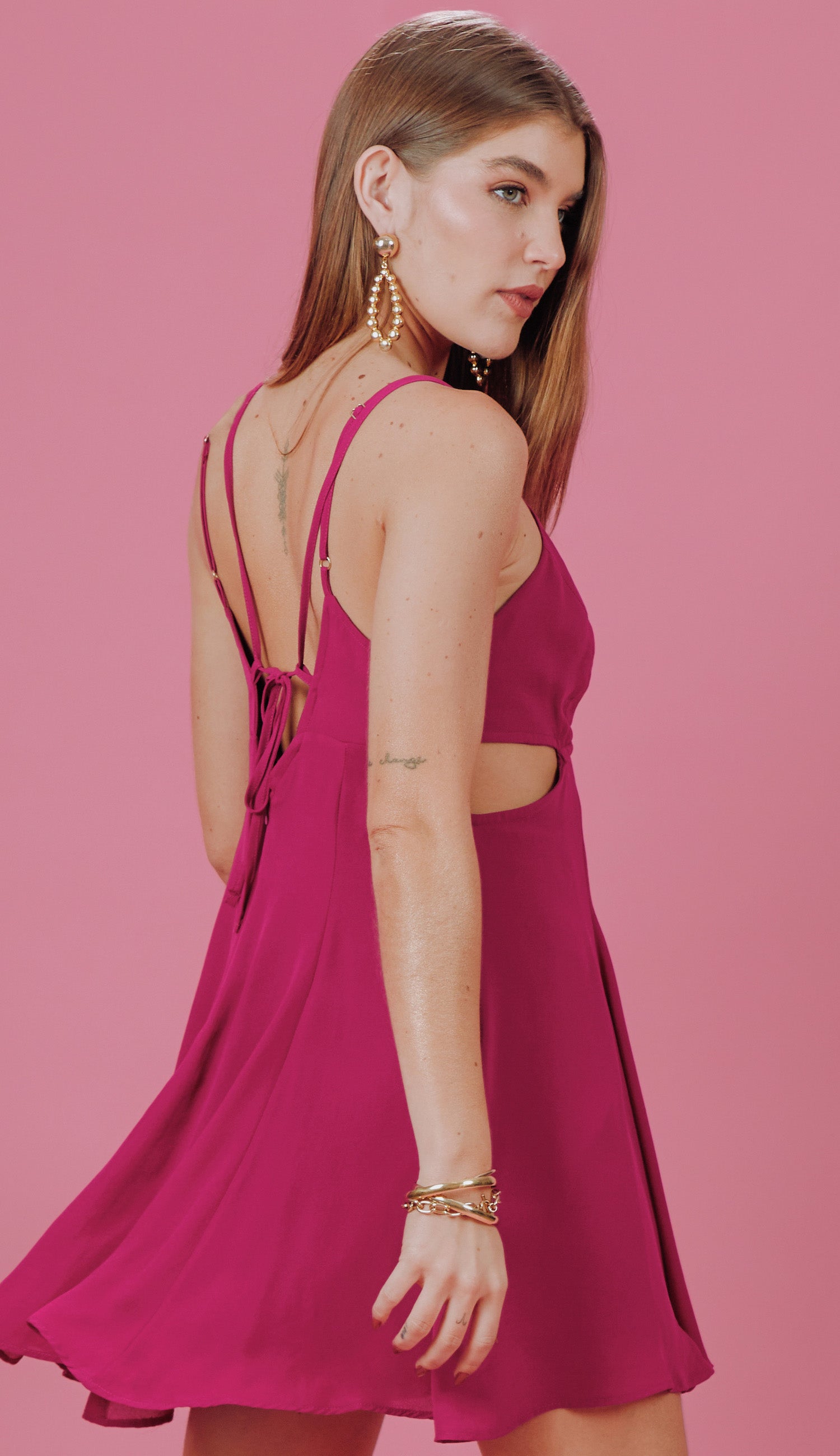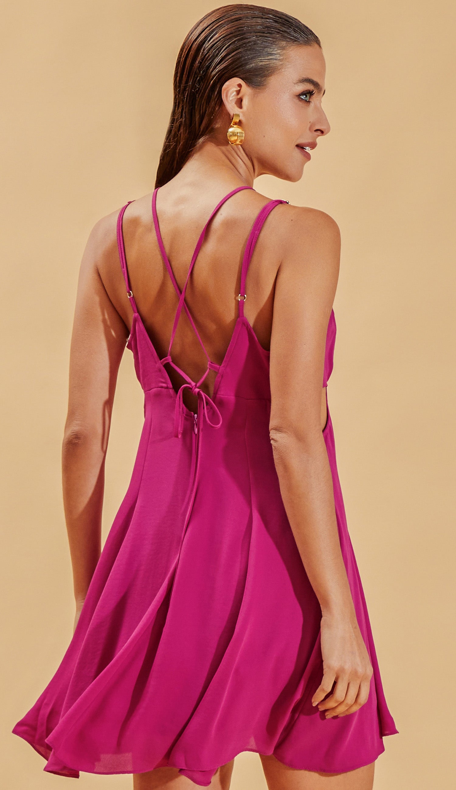 Vestido curto confeccionado em crepe com forro. Possui decote em V com tirinhas compridas embutidas logo abaixo do busto para ajuste e amarração, aberturas laterais na região da cintura, decote mais profundo nas costas com as tirinhas cruzadas, a saia é nesgada e o fechamento traseiro é por zíper invisível.