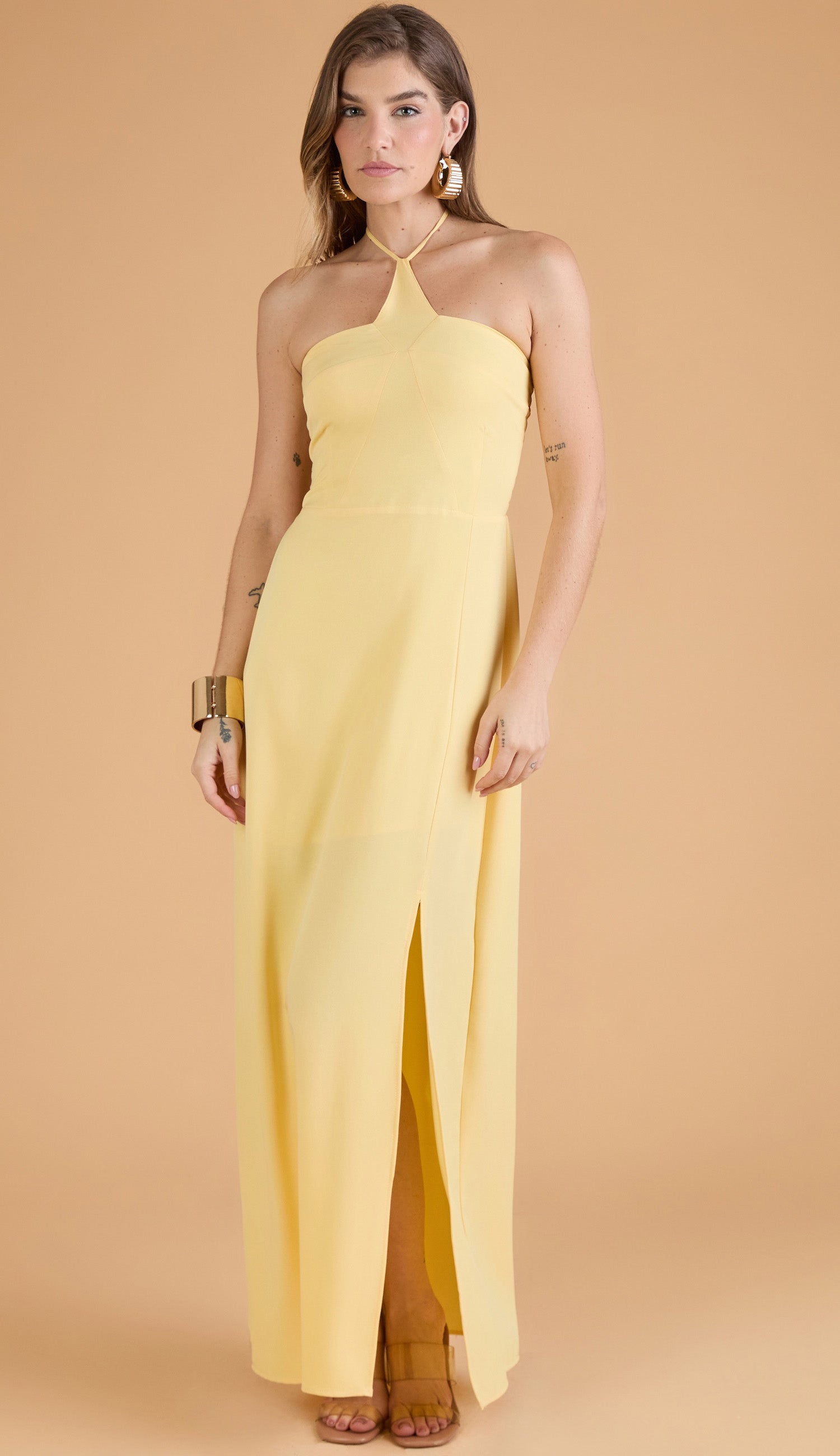 Vestido longo confeccionado em crepe de alfaiataria com forro. Possui modelagem ajustada, decote halter com recortes geométricos no busto, tirinha para amarrar no pescoço, fenda lateral na saia e lastex franzido nas costas para melhor ajuste.