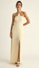 Vestido longo confeccionado em crepe de alfaiataria com forro. Possui modelagem ajustada, decote halter com recortes geométricos no busto, tirinha para amarrar no pescoço, fenda lateral na saia e lastex franzido nas costas para melhor ajuste.