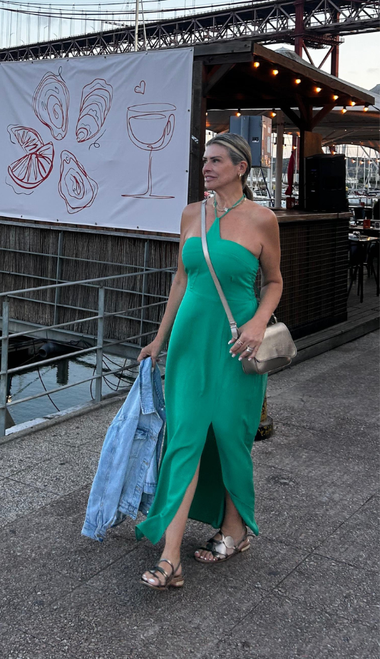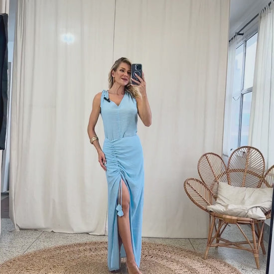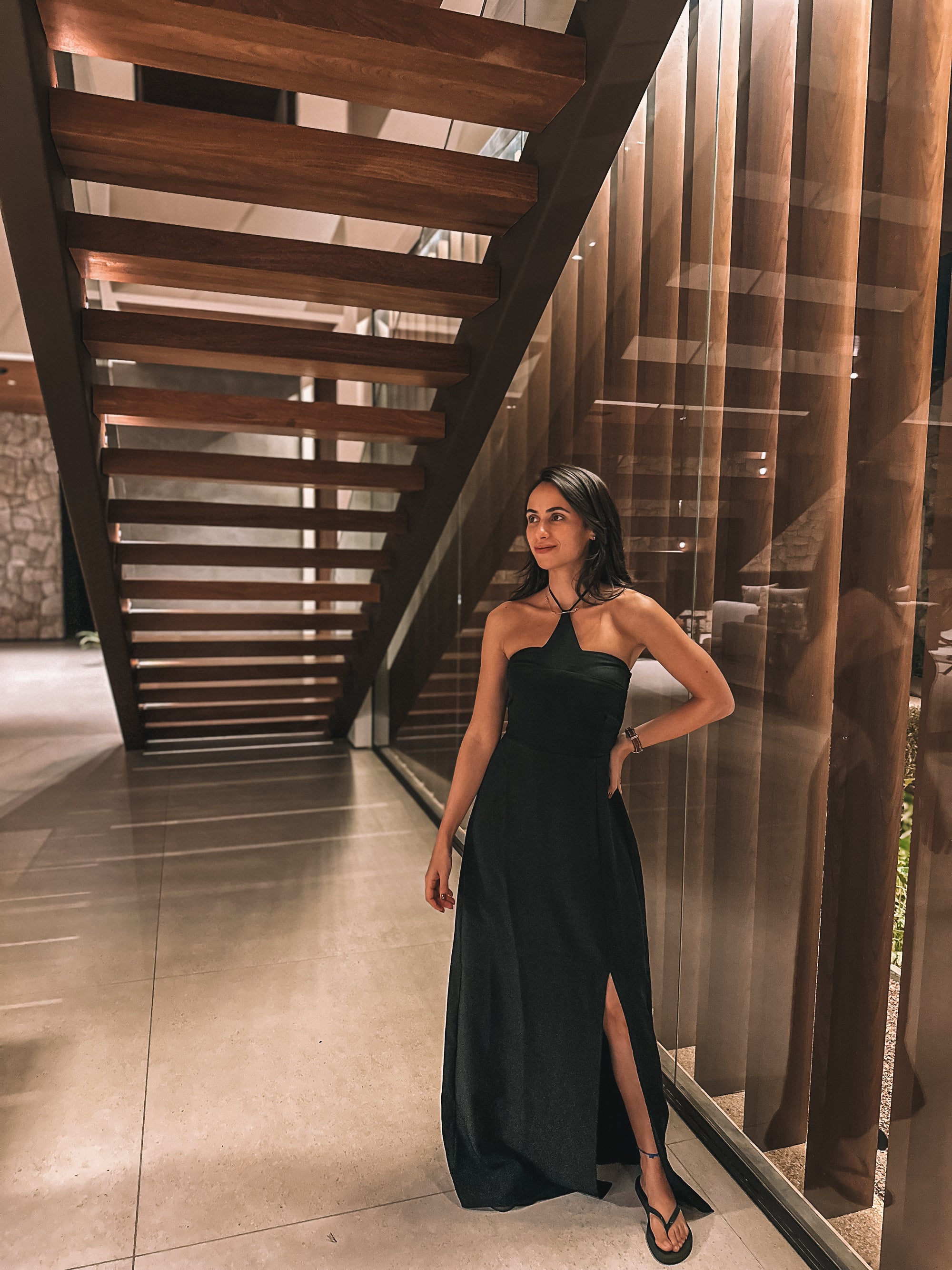 Vestido longo confeccionado em crepe de alfaiataria com forro. Possui modelagem ajustada, decote halter com recortes geométricos no busto, tirinha para amarrar no pescoço, fenda lateral na saia e lastex franzido nas costas para melhor ajuste.