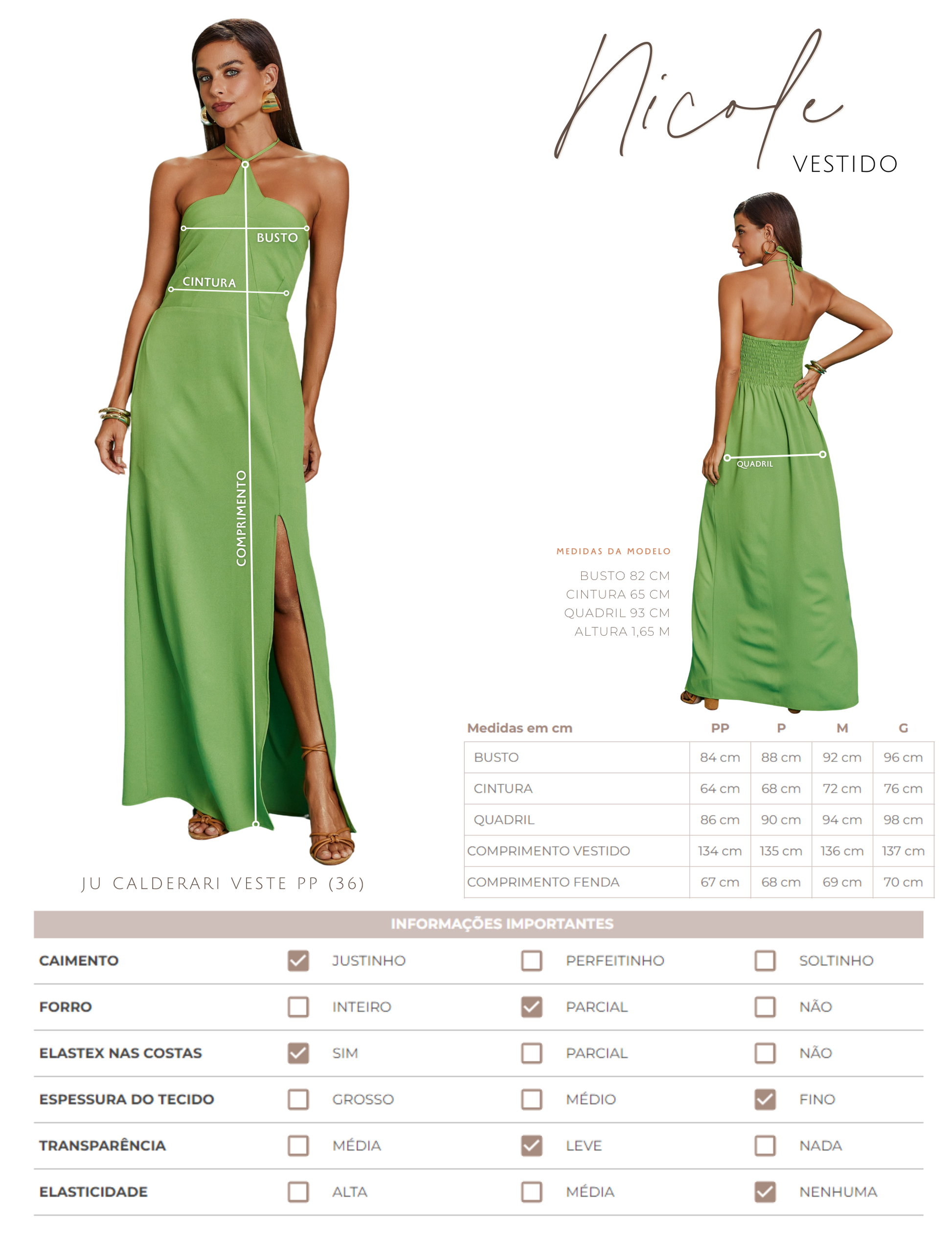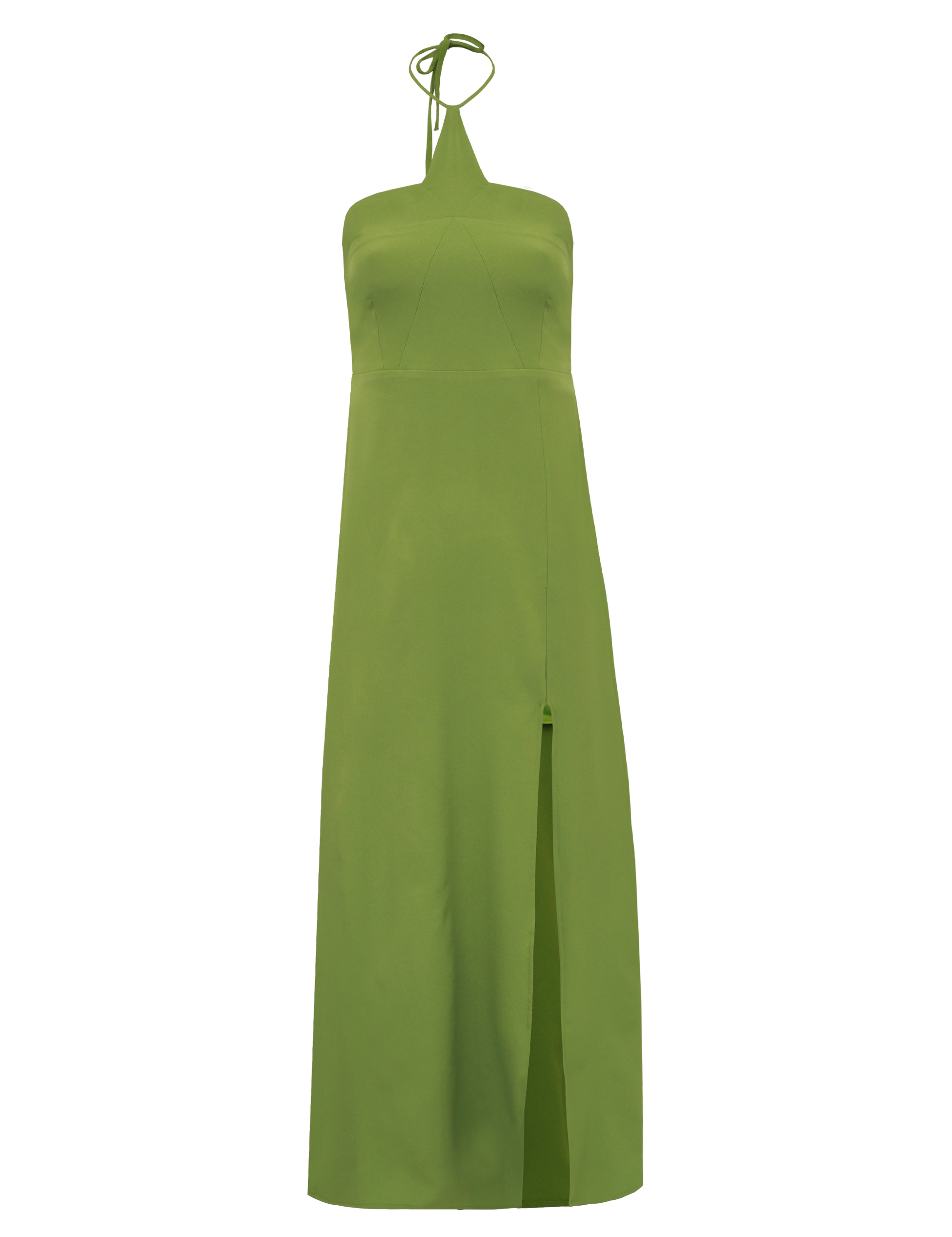 Vestido longo confeccionado em crepe de alfaiataria com forro. Possui modelagem ajustada, decote halter com recortes geométricos no busto, tirinha para amarrar no pescoço, fenda lateral na saia e lastex franzido nas costas para melhor ajuste.