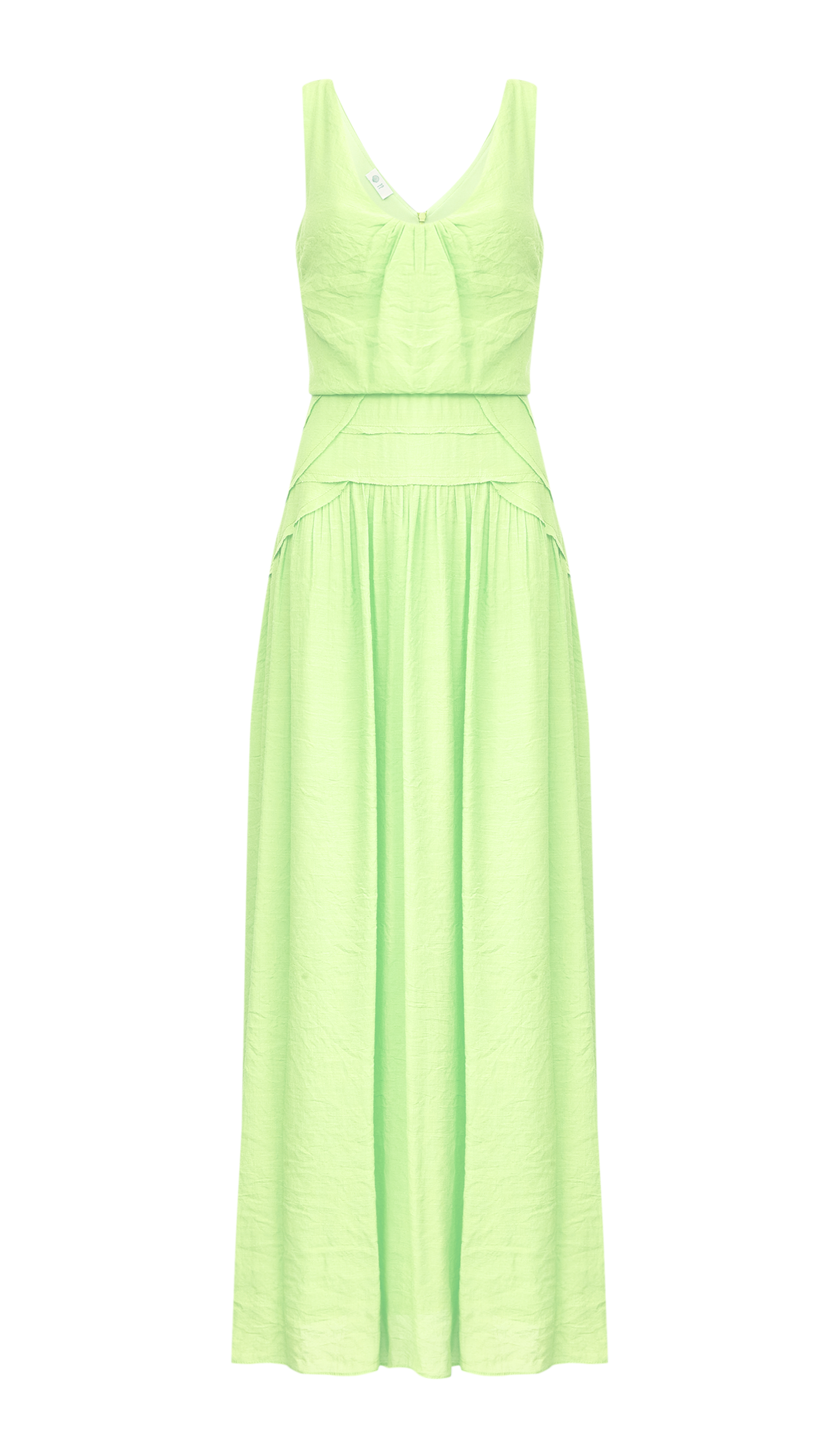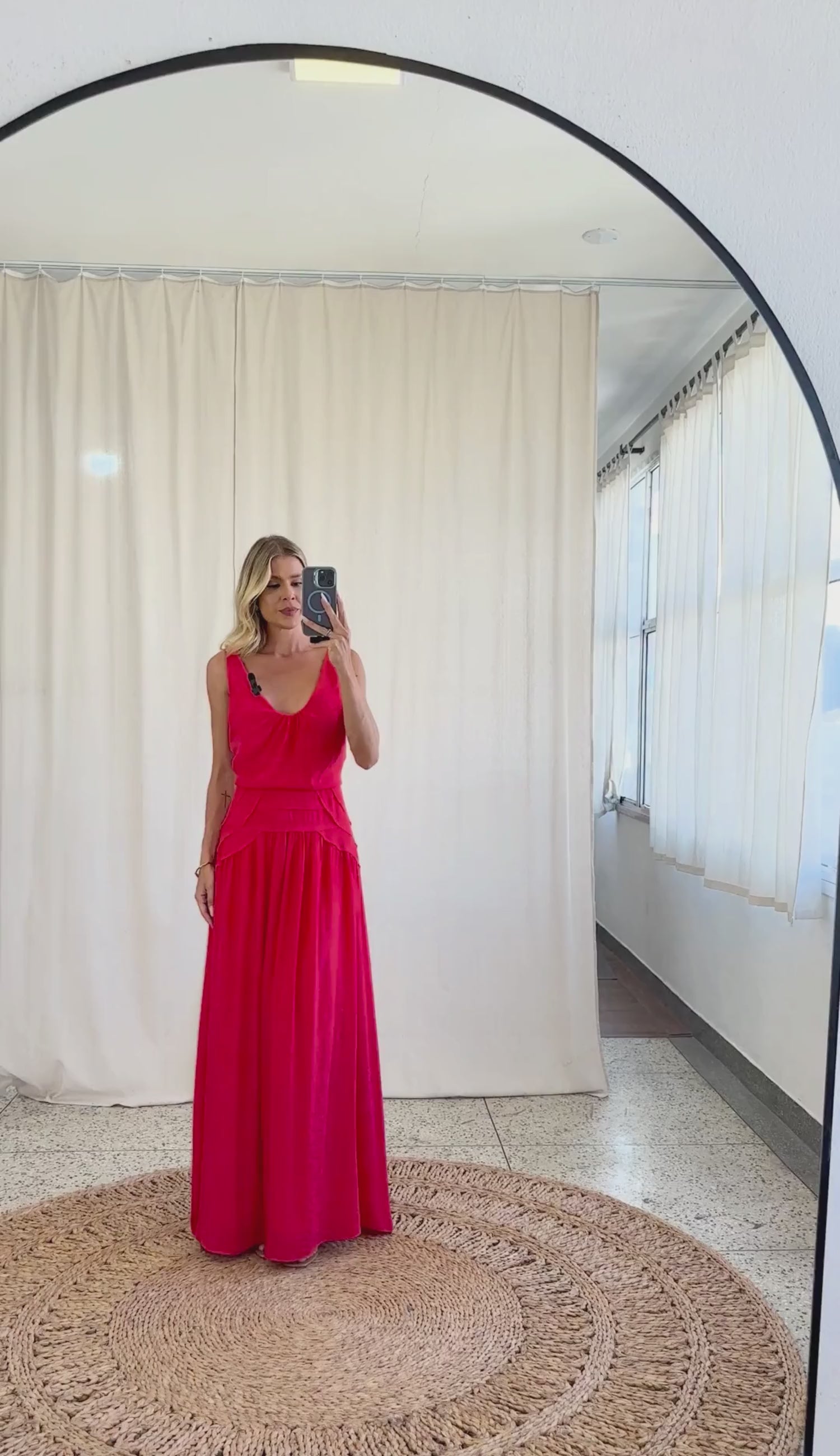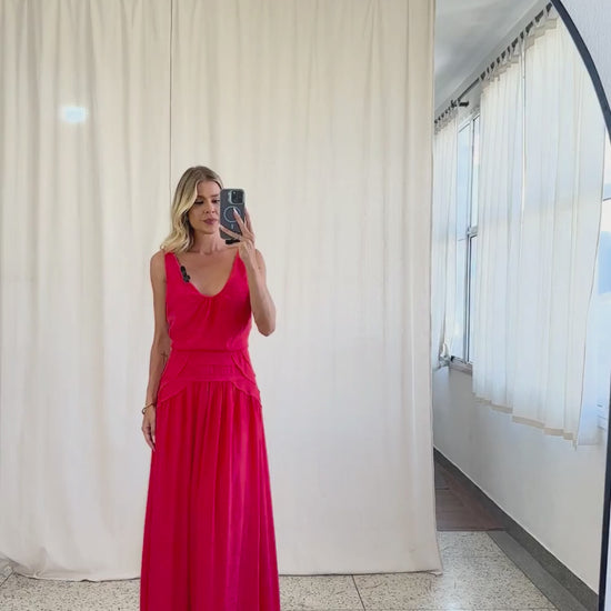 Vestido longo regata com forro, confeccionado em poliviscose texturizada com aspecto de linho e efeito amassadinho. Possui decote em U com franzidinhos no busto, alças mais largas, decote em V nas costas, marcação na cintura com parte da blusa levemente bufante tipo blusê, recorte na altura do quadril estilo drop waist com detalhes a fio e pespontados dando um efeito super charmoso, franzidinhos na saia soltinha e fechamento traseiro por zíper invisível.