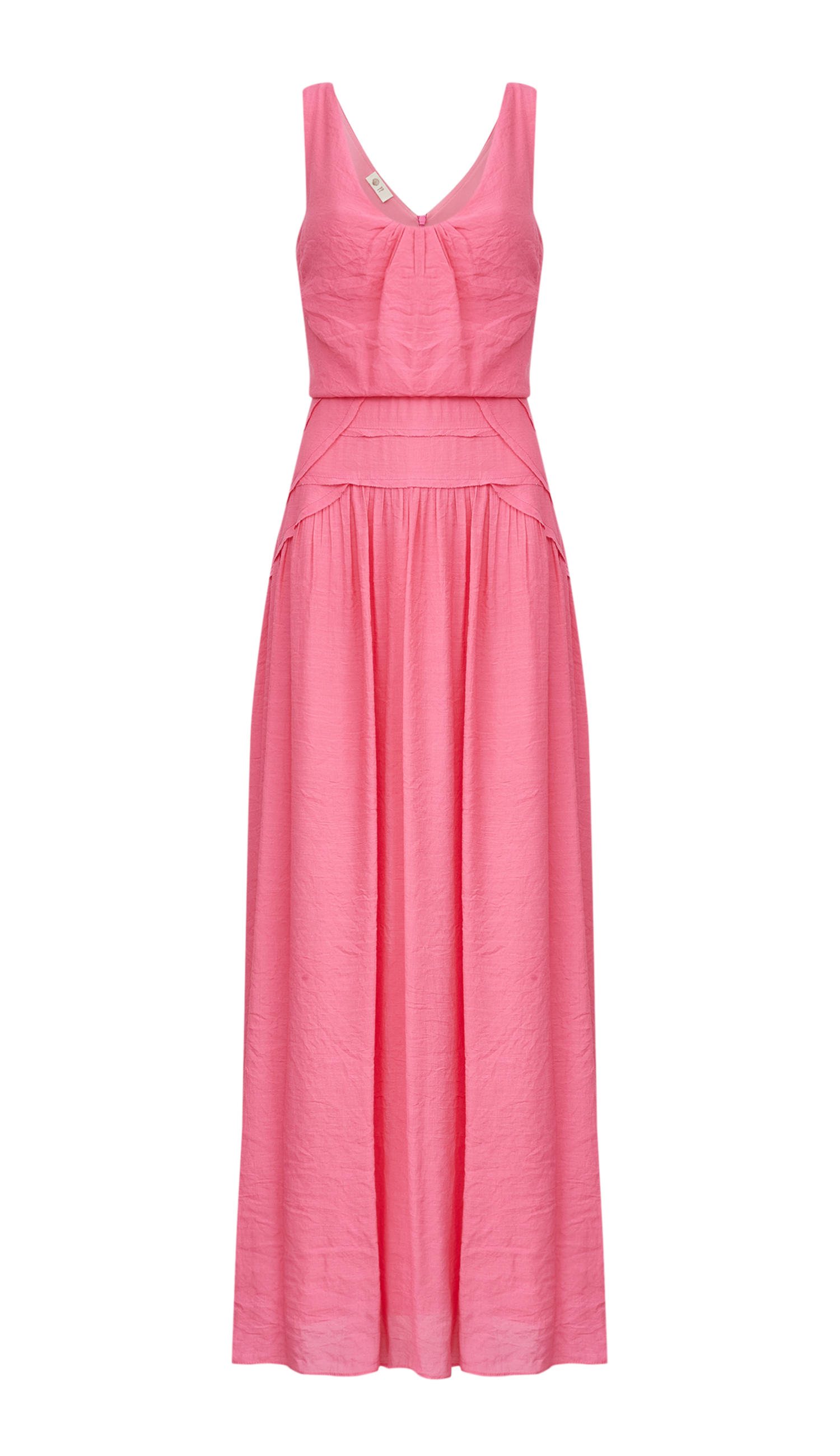 Vestido longo regata com forro, confeccionado em poliviscose texturizada com aspecto de linho e efeito amassadinho. Possui decote em U com franzidinhos no busto, alças mais largas, decote em V nas costas, marcação na cintura com parte da blusa levemente bufante tipo blusê, recorte na altura do quadril estilo drop waist com detalhes a fio e pespontados dando um efeito super charmoso, franzidinhos na saia soltinha e fechamento traseiro por zíper invisível.