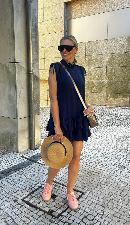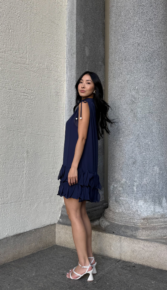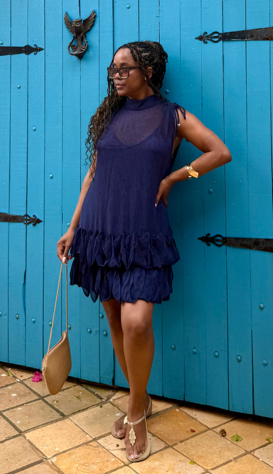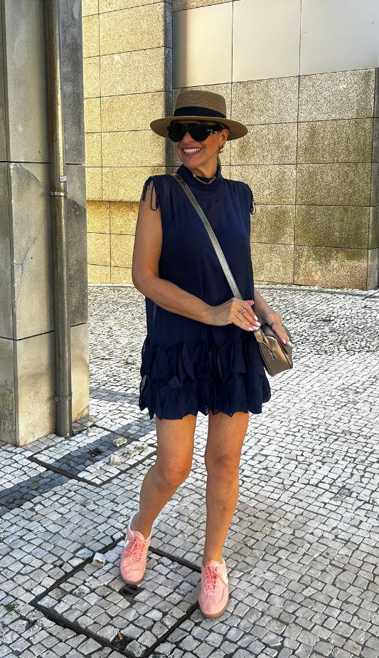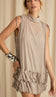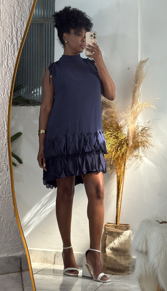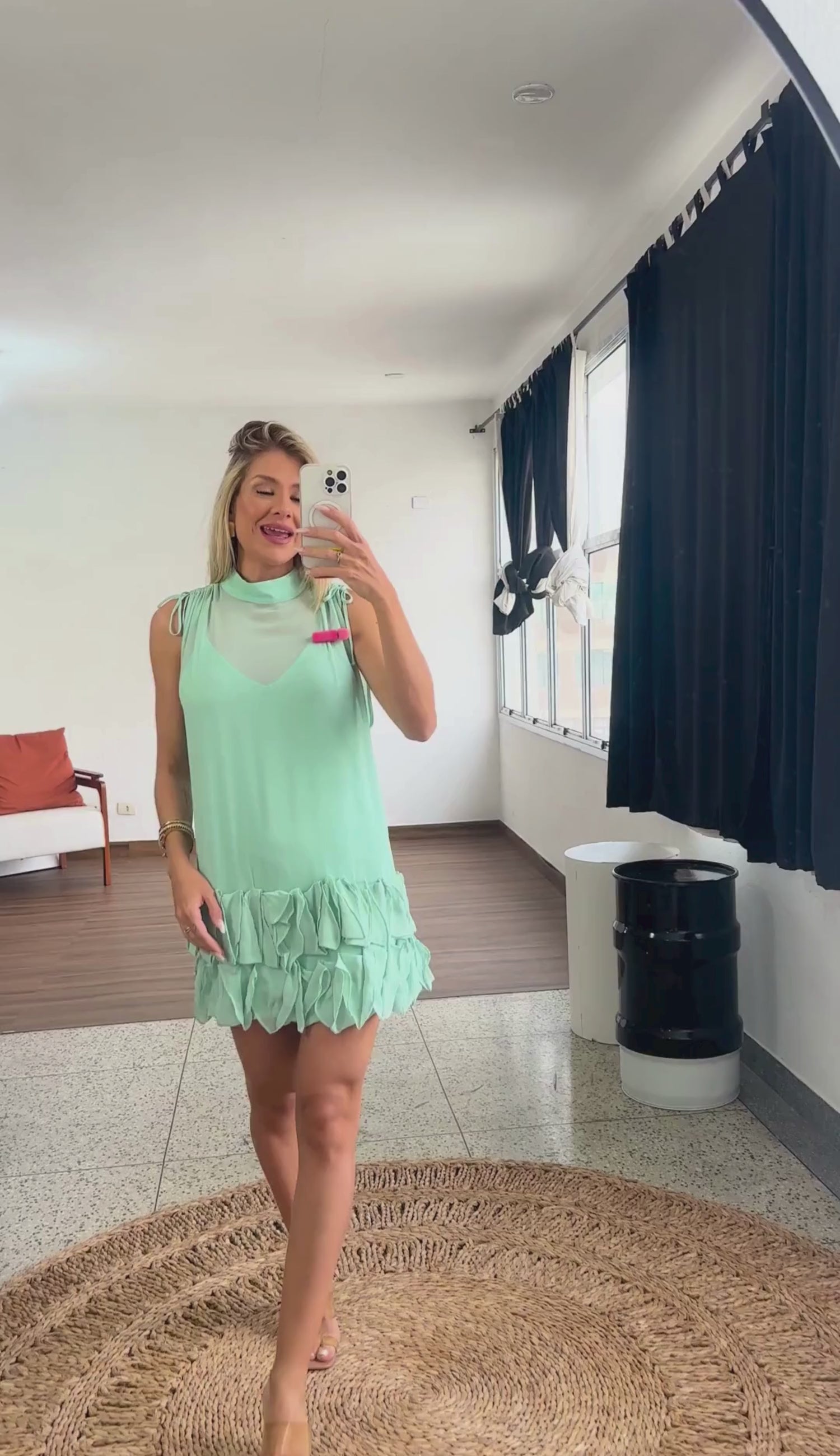 Vestido curto regata confeccionado em crepe com vestido de forro por baixo. Possui modelagem solta e reta, gola alta com fechamento na nuca por botões esmaltados, tirinhas embutidas nos ombros para franzir e detalhe na barra com aplicação de babadinhos volumosos. O vestido de forro que vai por baixo é ajustado ao corpo, possui decote em V e alcinhas reguláveis.