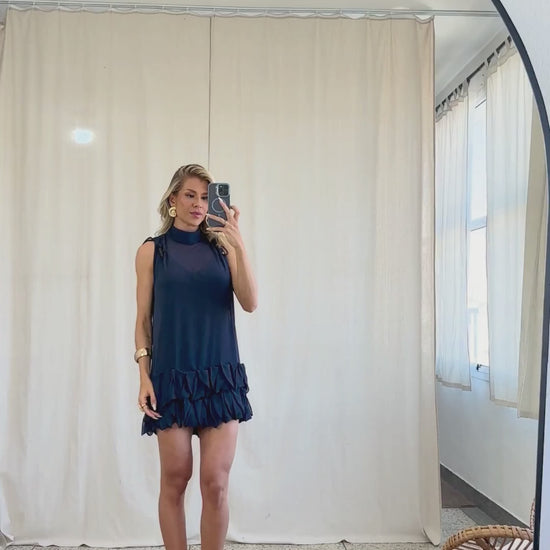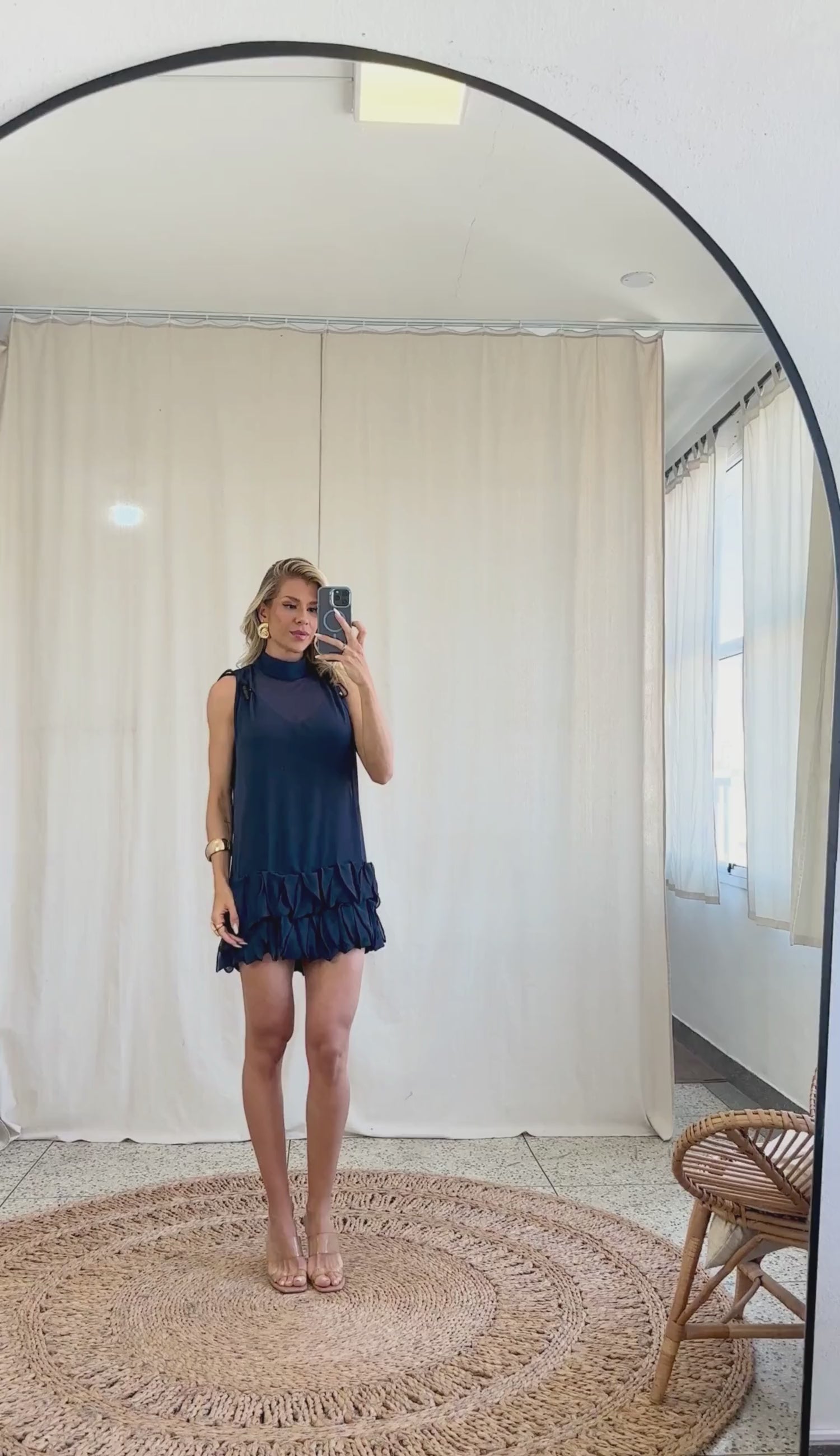 Vestido curto regata confeccionado em crepe com vestido de forro por baixo. Possui modelagem solta e reta, gola alta com fechamento na nuca por botões esmaltados, tirinhas embutidas nos ombros para franzir e detalhe na barra com aplicação de babadinhos volumosos. O vestido de forro que vai por baixo é ajustado ao corpo, possui decote em V e alcinhas reguláveis.