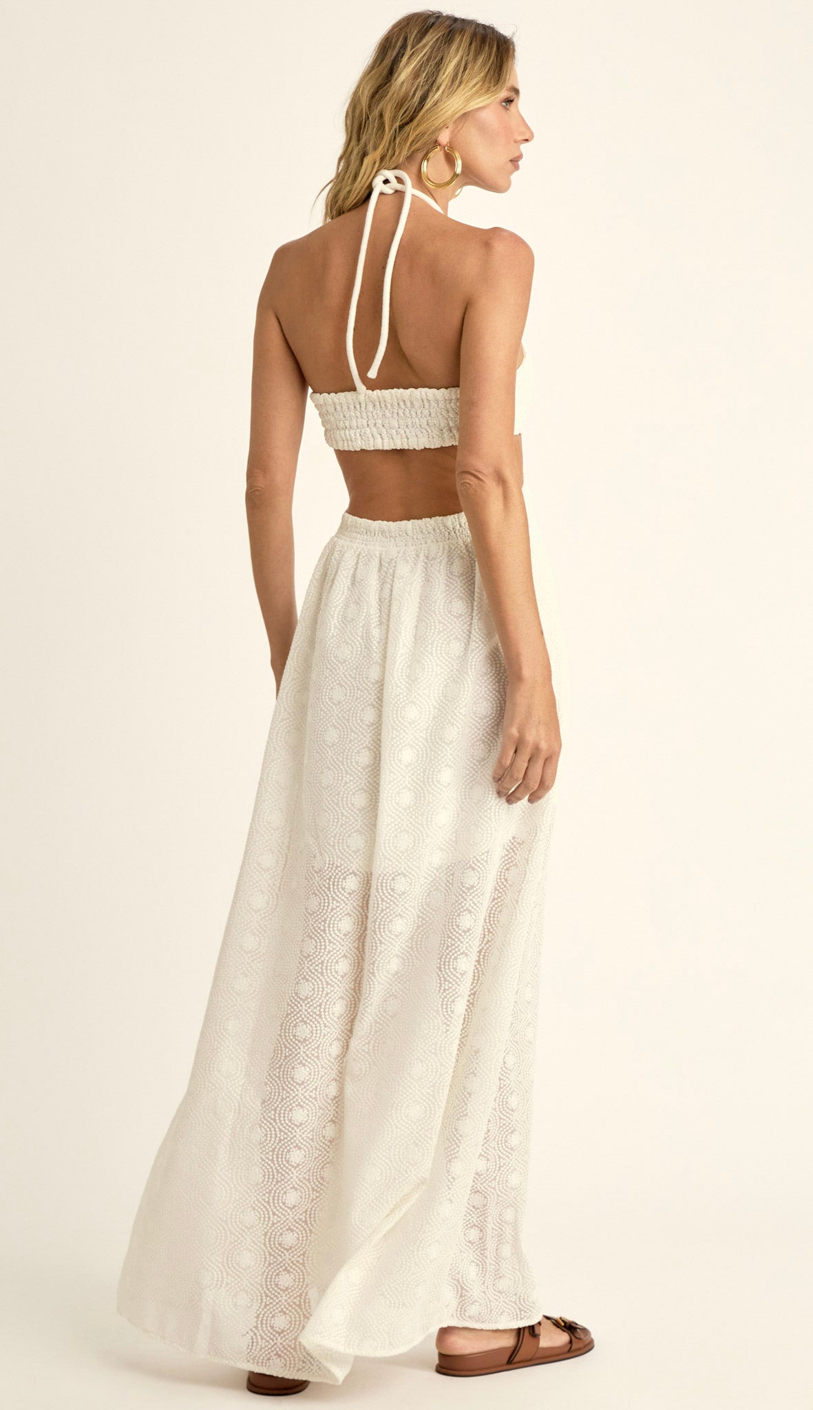 Vestido longo com forro, confeccionado em organza bordada com padronagem geométrica. Possui busto fixo à saia apenas por recorte frontal, deixando toda a região da cintura a mostra; decote coração com cordão embutido no centro do busto para franzir o decote e amarrar no pescoço; lastex franzido nas costas do top e da saia, para melhor ajuste ao corpo e fenda frontal na saia com aplicação de babadinhos que dá um charme especial à peça.