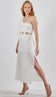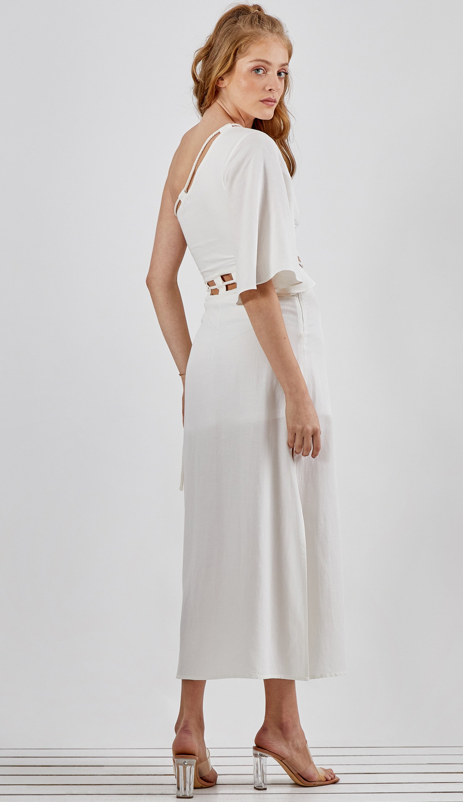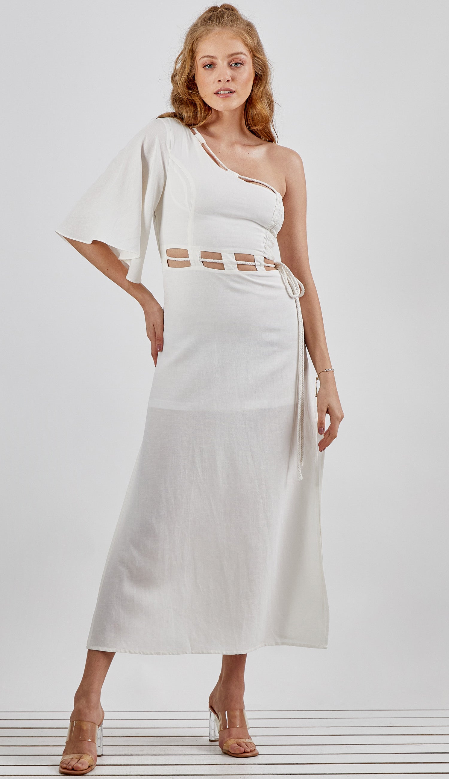 Vestido longo com forro, confeccionado em viscolinho com algodão. Possui decote ombro único com detalhe de cordão, manga sino 3/4, recorte vazado na cintura com passantes e cordão para amarrar, lastex franzido na lateral do busto, fechamento lateral por zíper invisível e fendas laterais.
