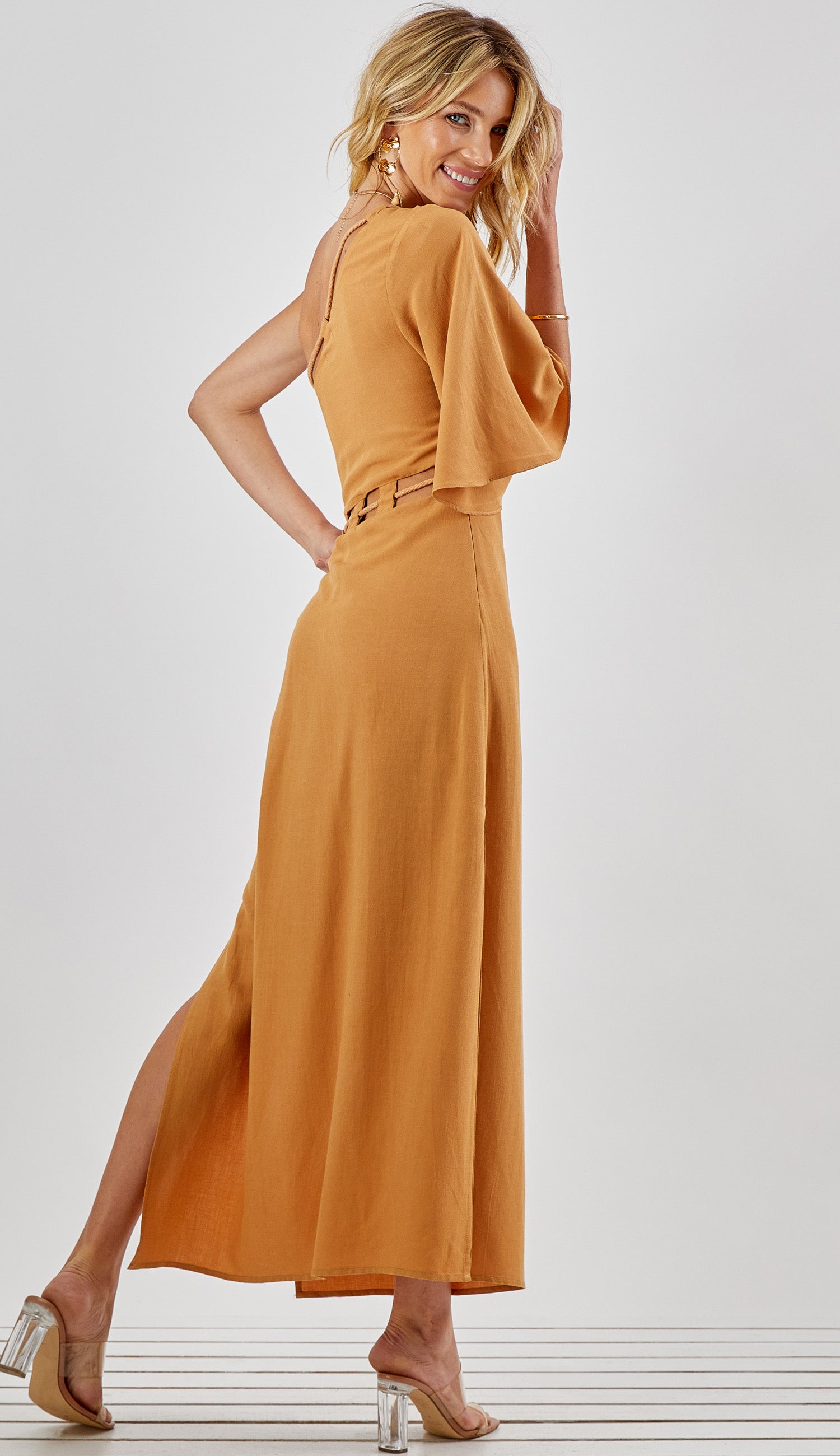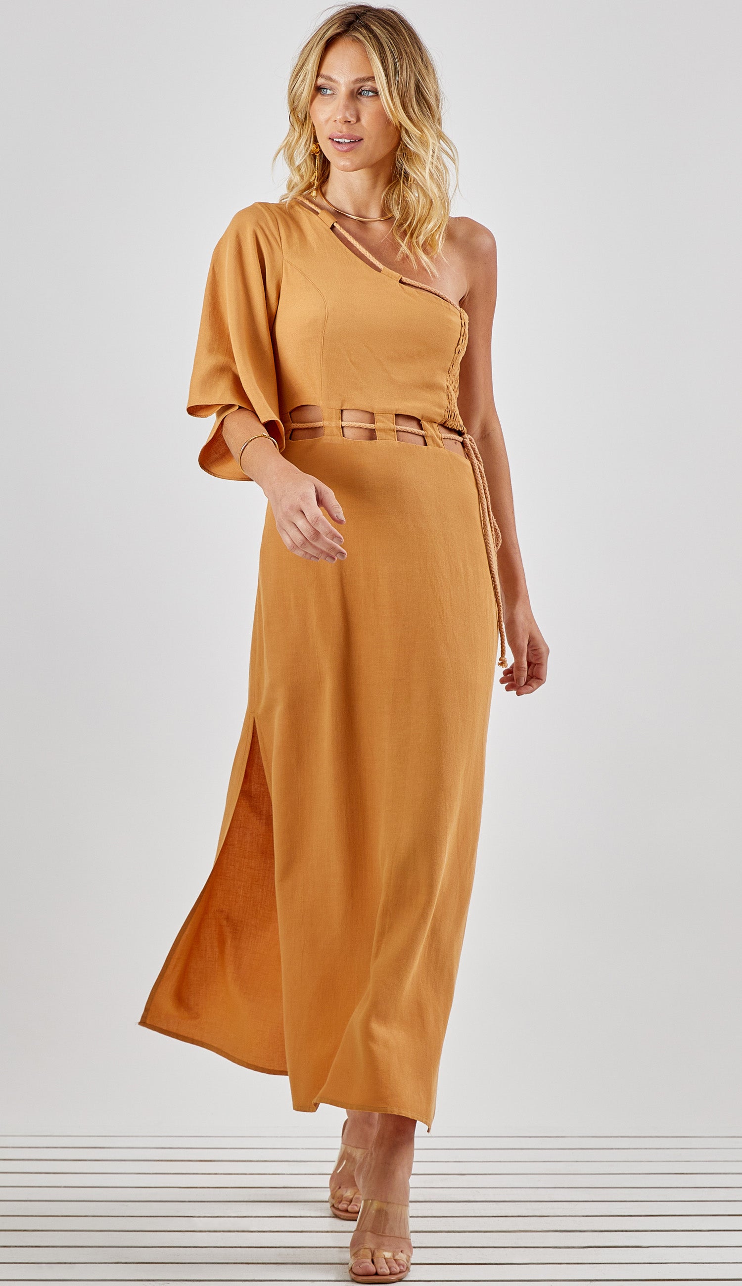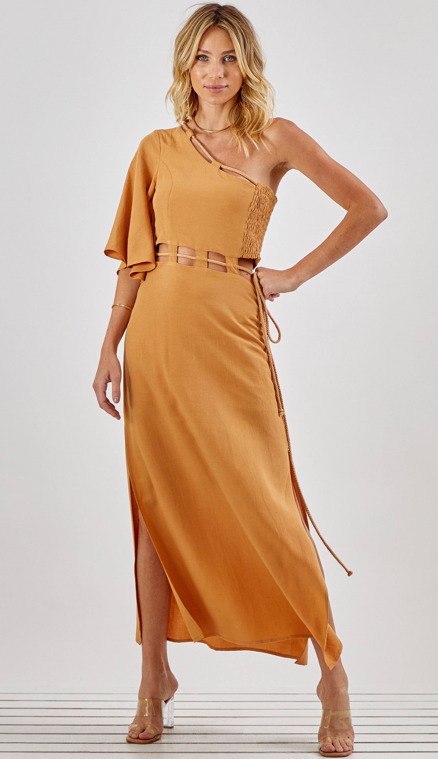 Vestido longo com forro, confeccionado em viscolinho com algodão. Possui decote ombro único com detalhe de cordão, manga sino 3/4, recorte vazado na cintura com passantes e cordão para amarrar, lastex franzido na lateral do busto, fechamento lateral por zíper invisível e fendas laterais.