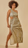 Vestido longo confeccionado em malha de lurex com forro. Possui decote ombro único com detalhe franzidinho, fenda lateral na saia e abertura em toda a região da cintura com parte fixa apenas na lateral com detalhe de cordão fixo embutido com franzido. Para melhor ajuste da peça ao corpo, conta com lastex na lateral do busto e elástico fino interno na cintura e no decote.