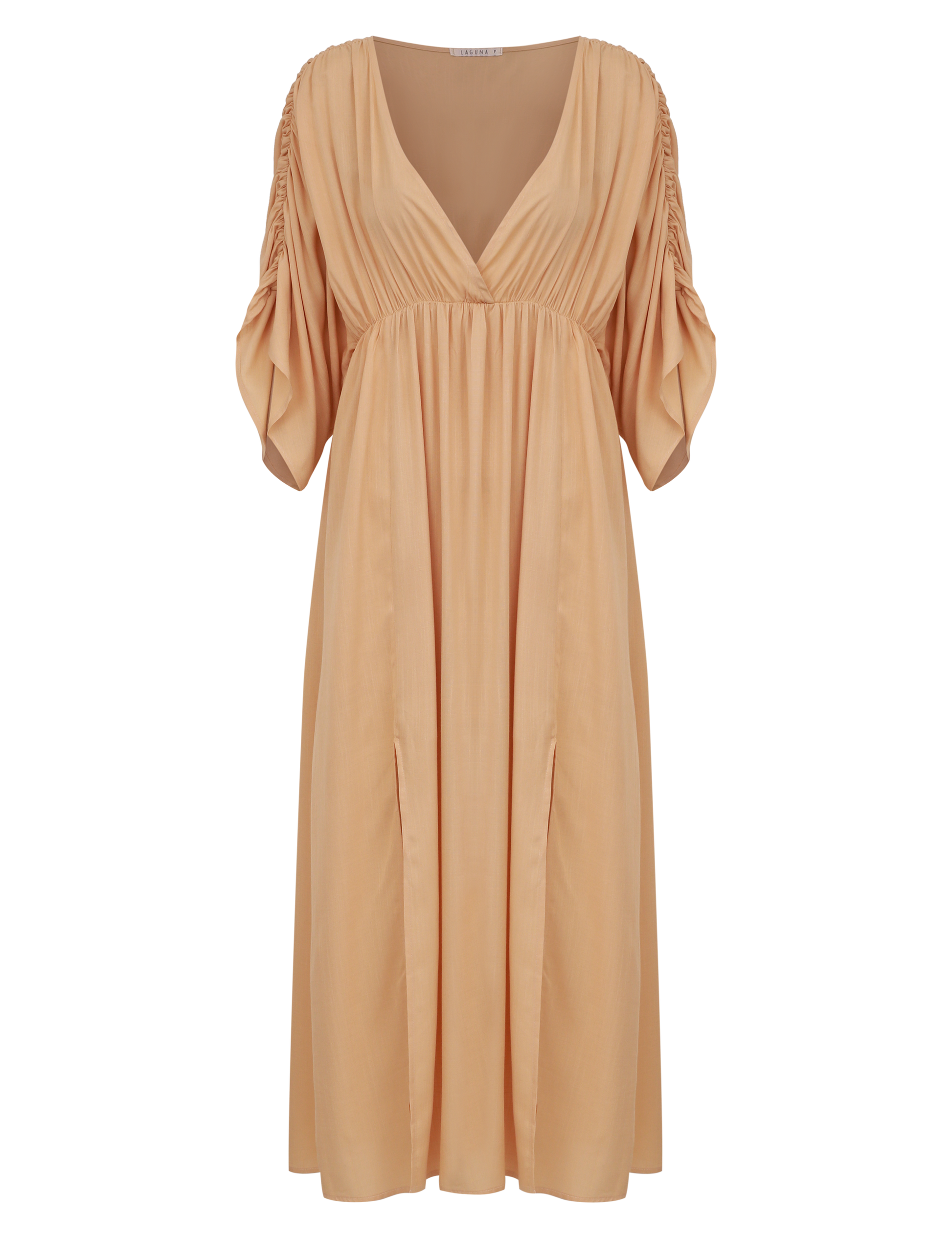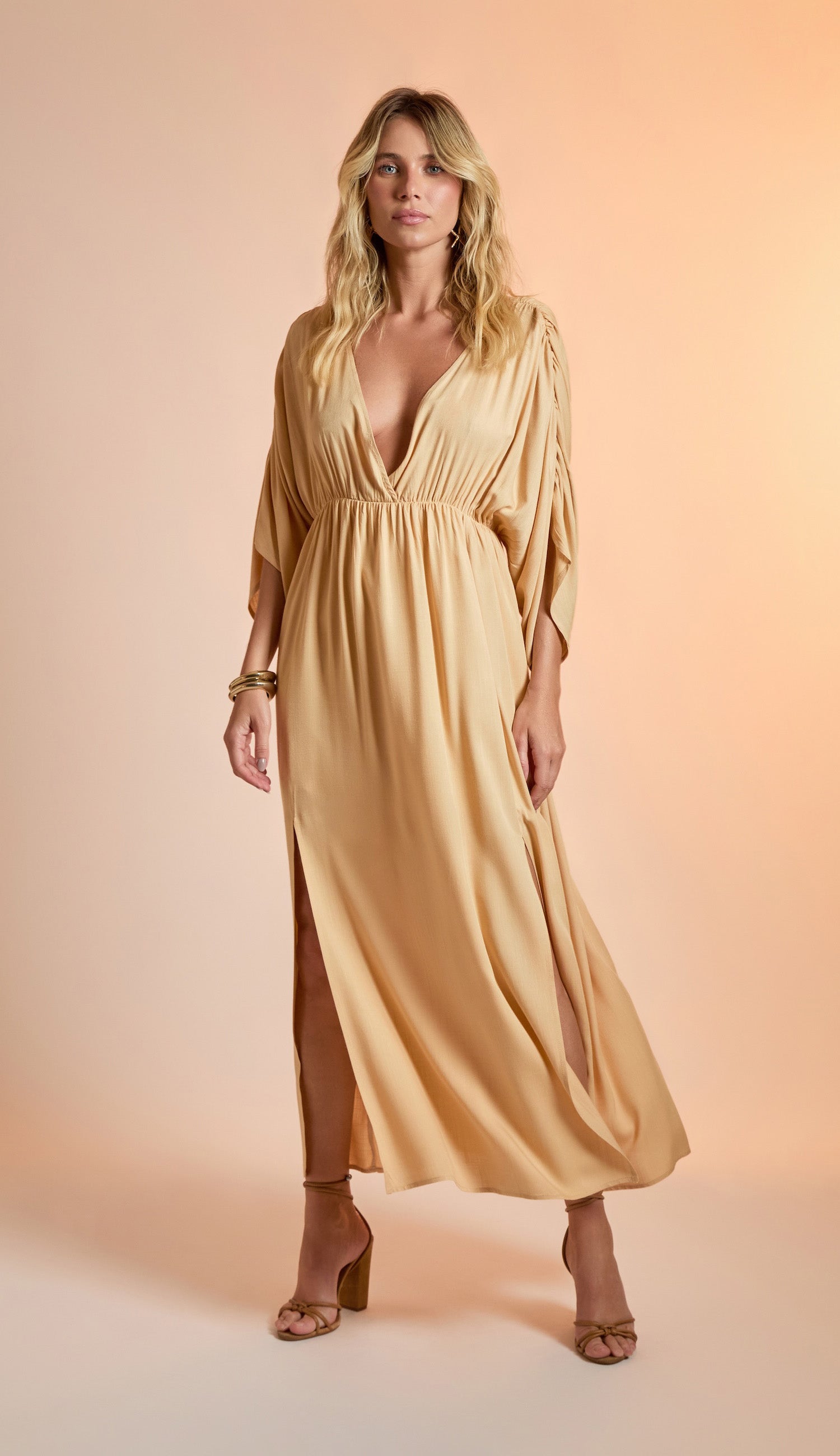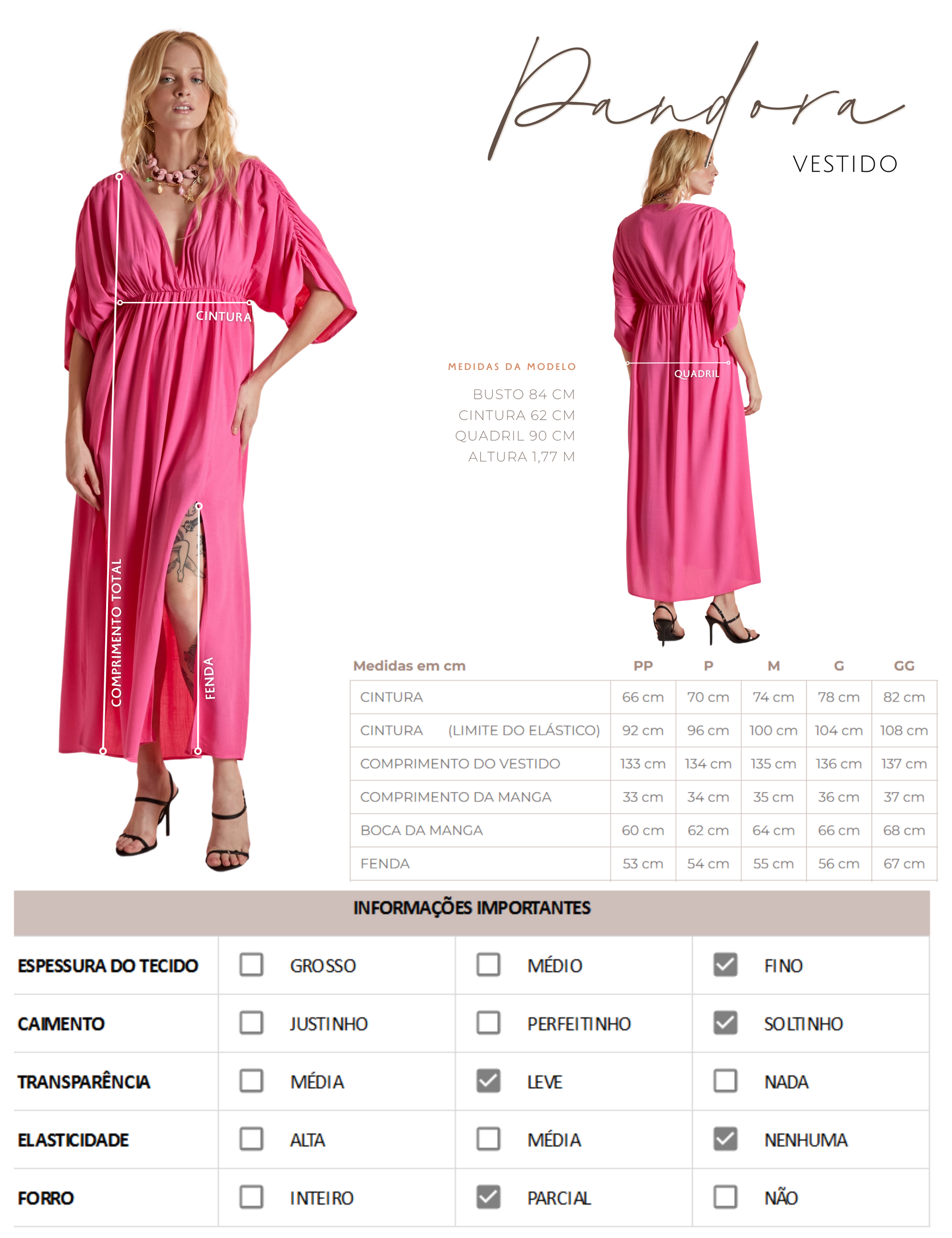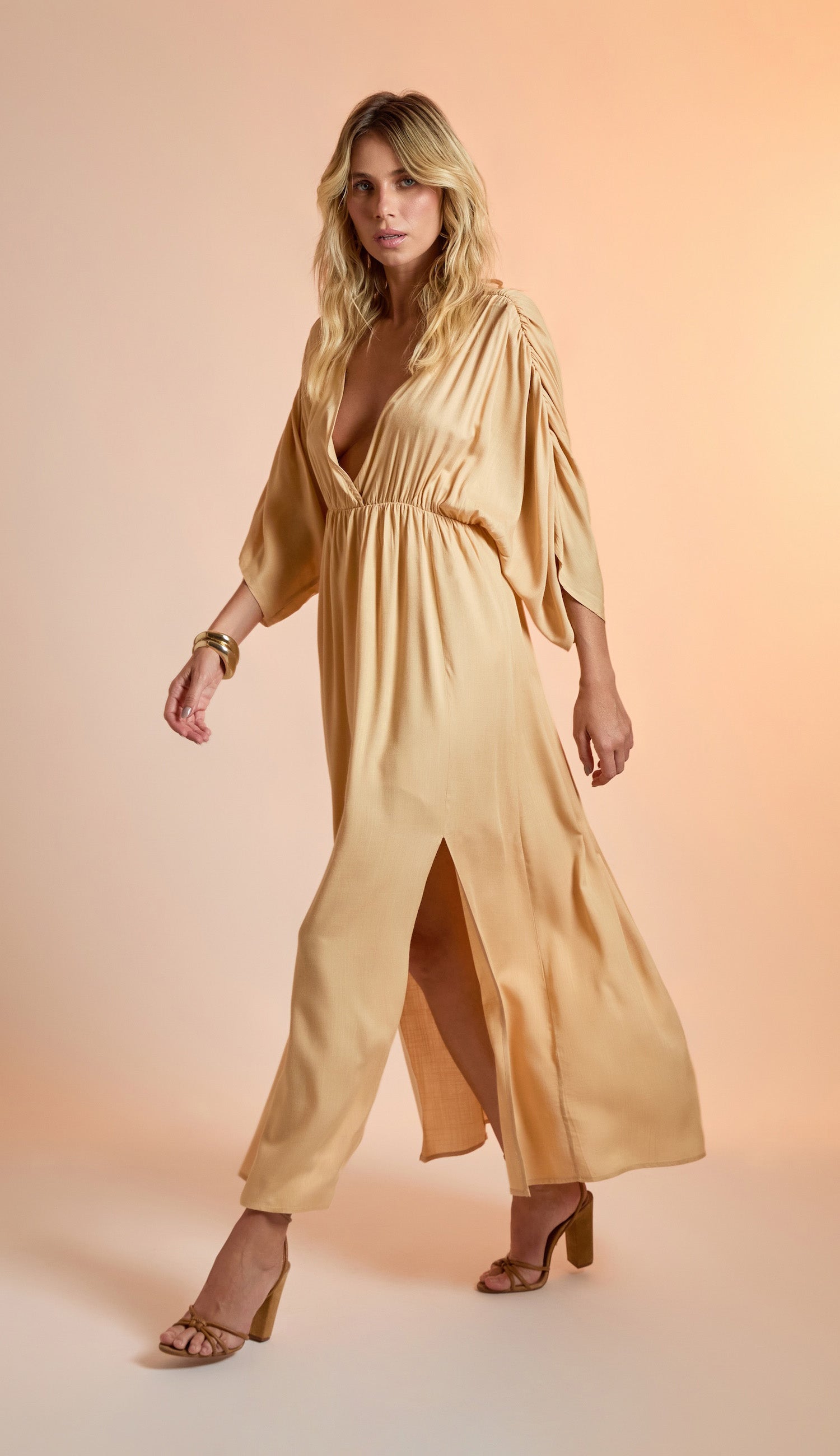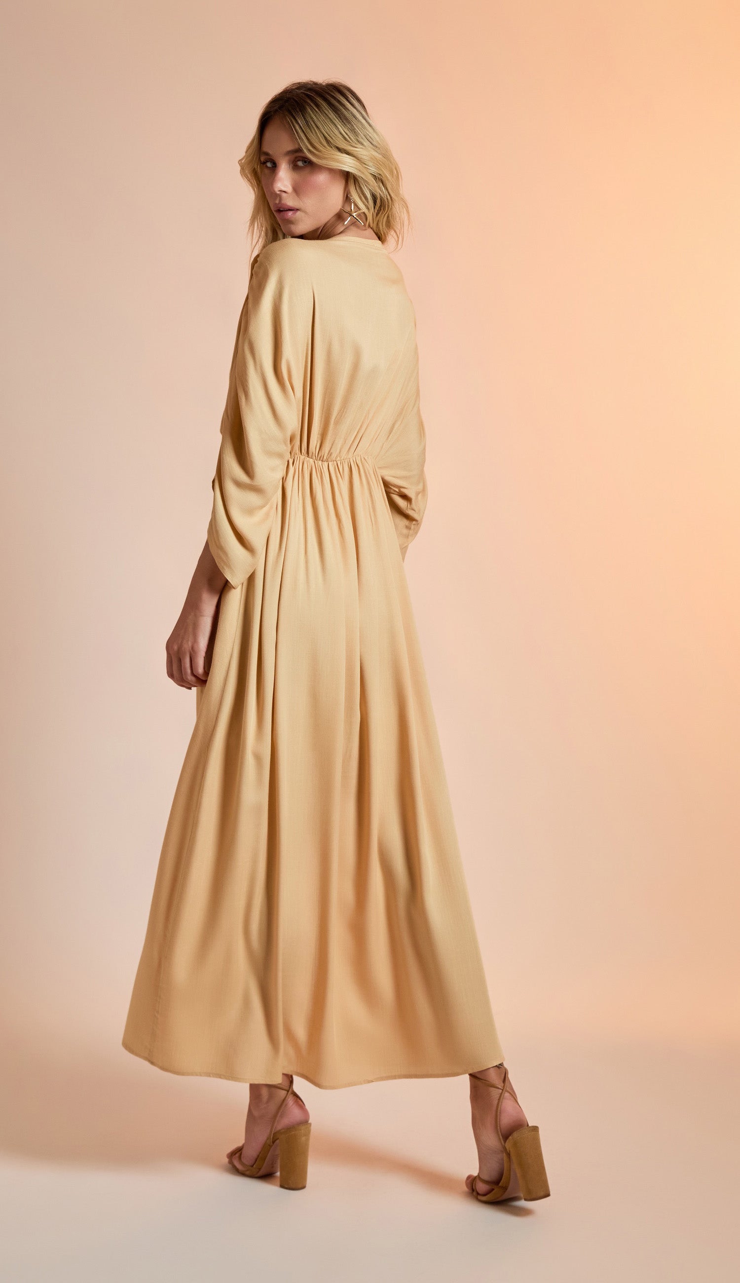 Vestido midi com forro, confeccionado em viscose com toque e aspecto de linho. Possui decote "V" transpassado, modelagem soltinha, fendas frontais, mangas morcego 3/4 e elástico franzido na cintura e nas laterais das mangas, dando um detalhe levemente bufante. É um modelo mais elegante mas sem perder a leveza que a gente ama!