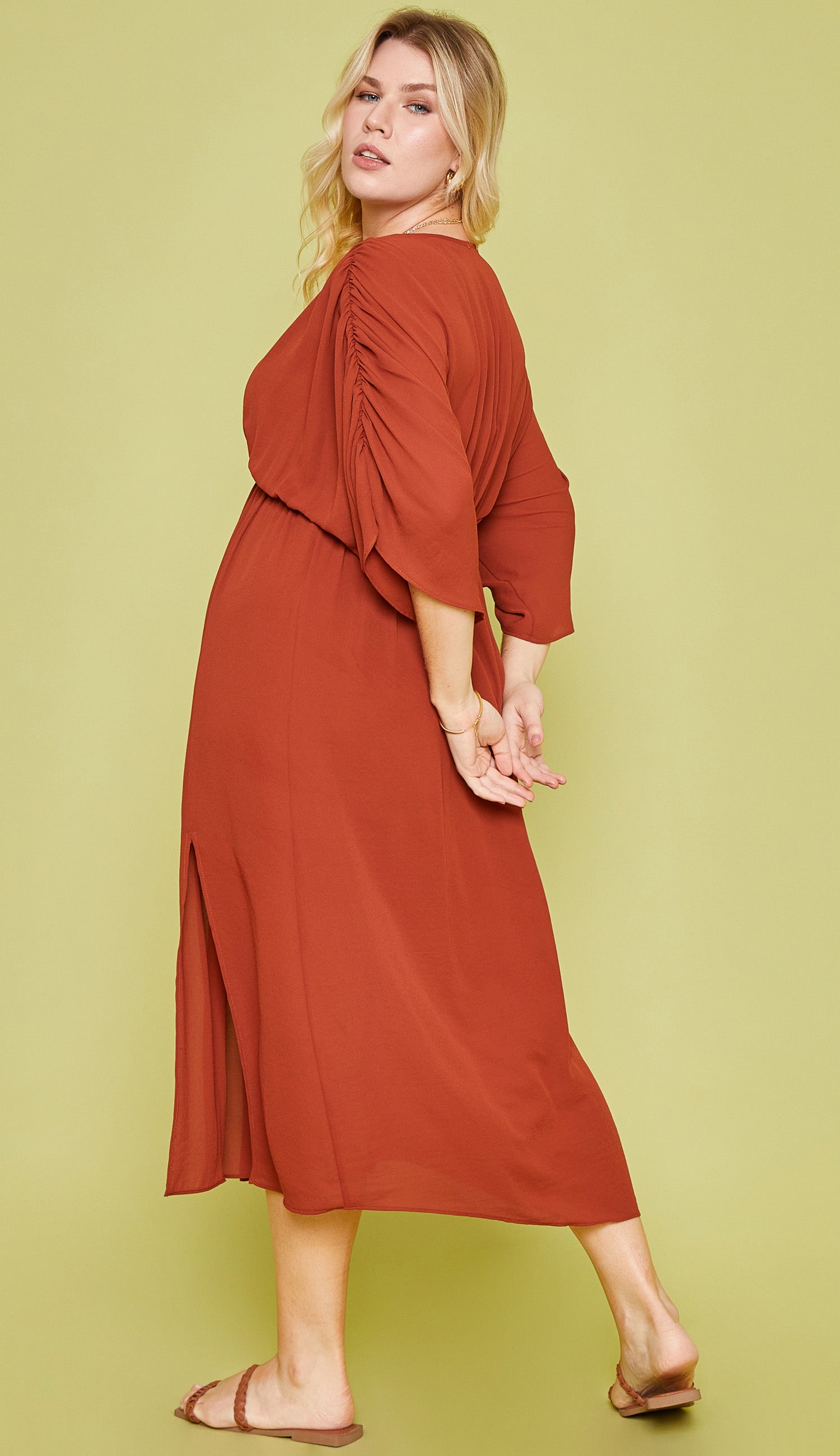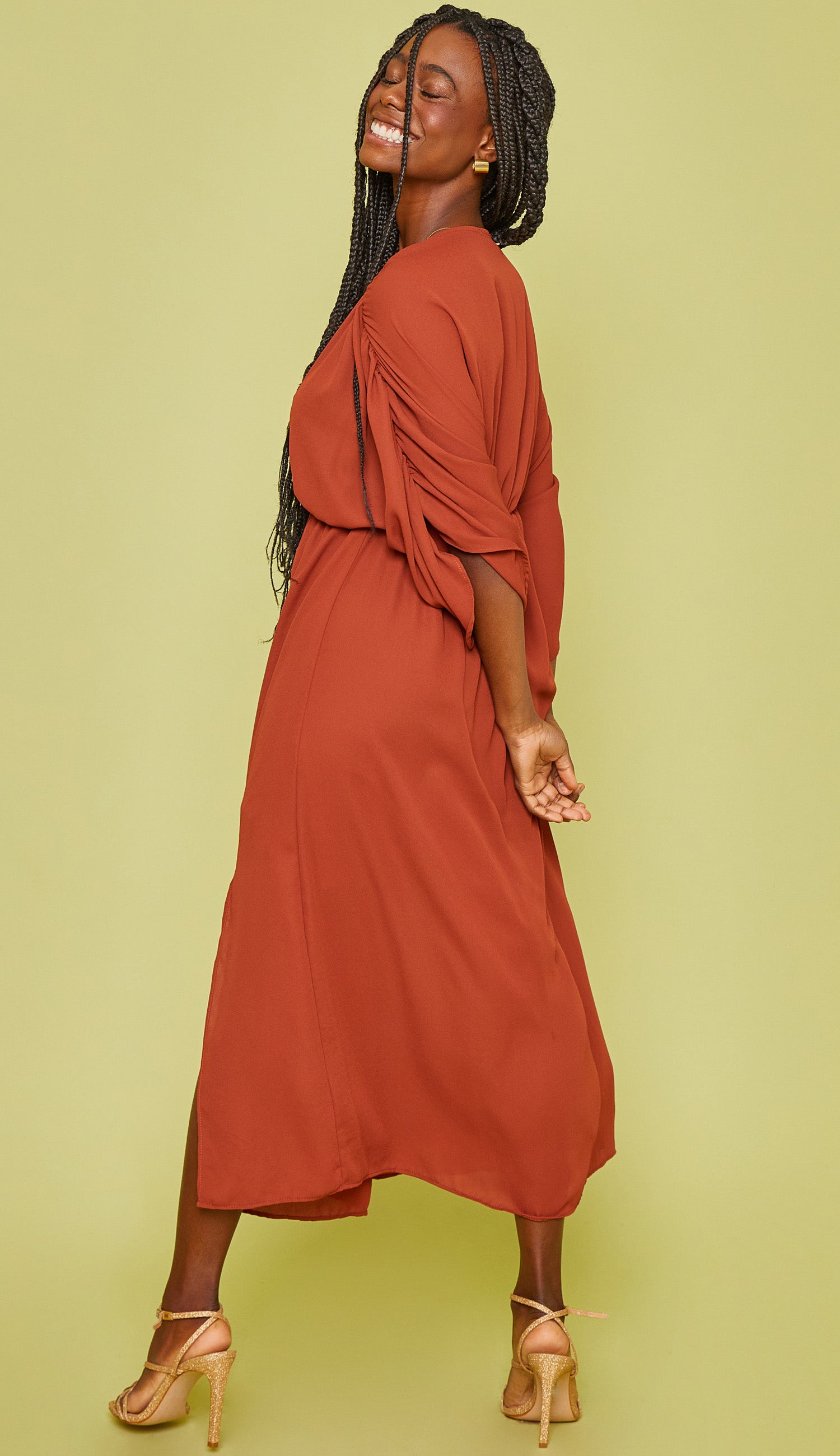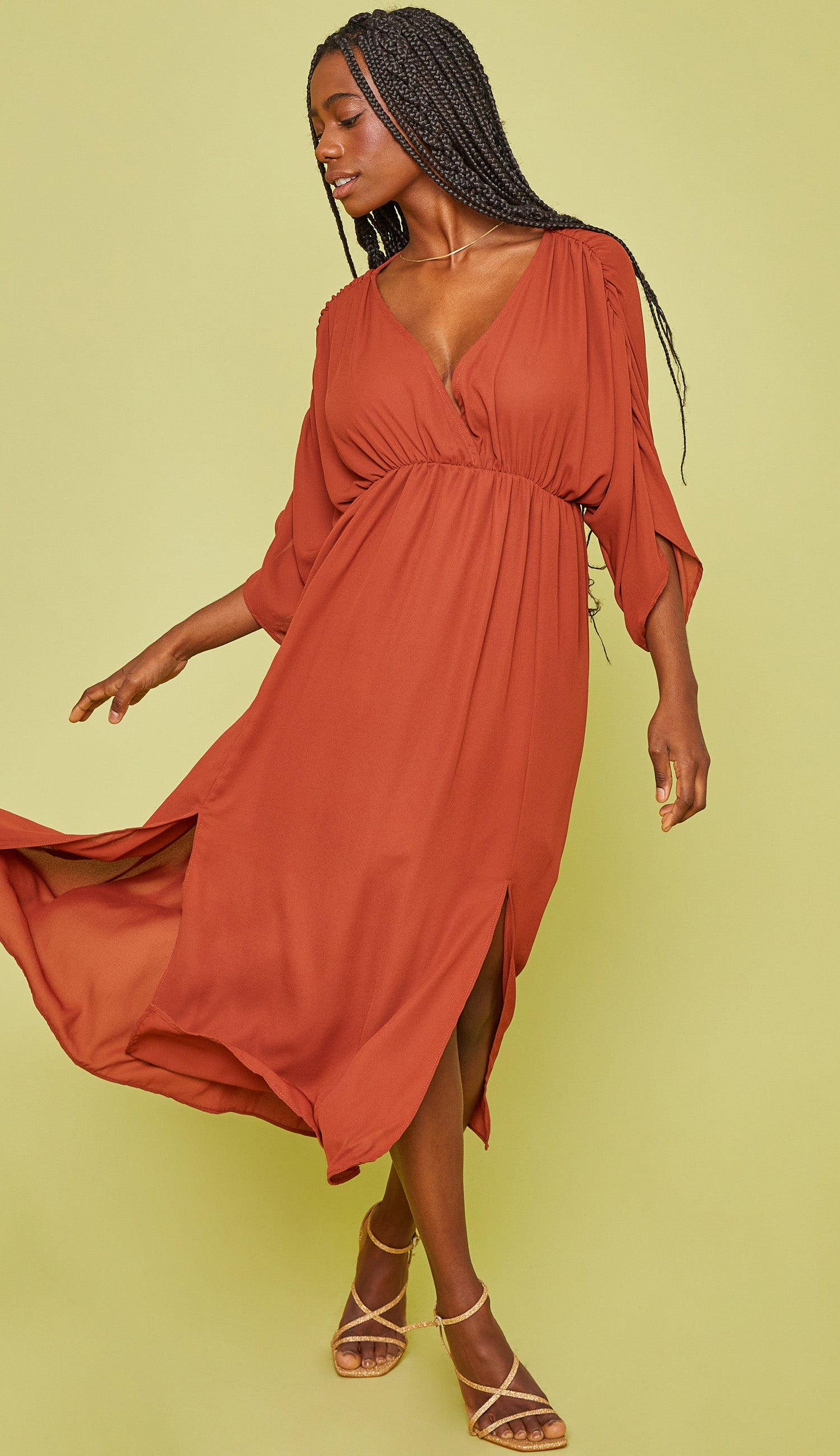 Vestido midi confeccionado em crepe com forro. Possui decote "V" levemente transpassado. Elástico na cintura e elástico franzido nas mangas. Fendas frontais. É um modelo mais elegante mas sem perder a leveza que a gente ama!