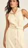 Vestido chemise longo regata, confeccionado em alfaiataria de algodão maquinetado com aparência levemente acetinada. Possui modelagem evasê, gola de camisa, fechamento frontal por botões madreperola no mesmo tom da peça, bolsos laterais e faixa fixa larga na parte traseira para amarrar na cintura, ajustando a silhueta.