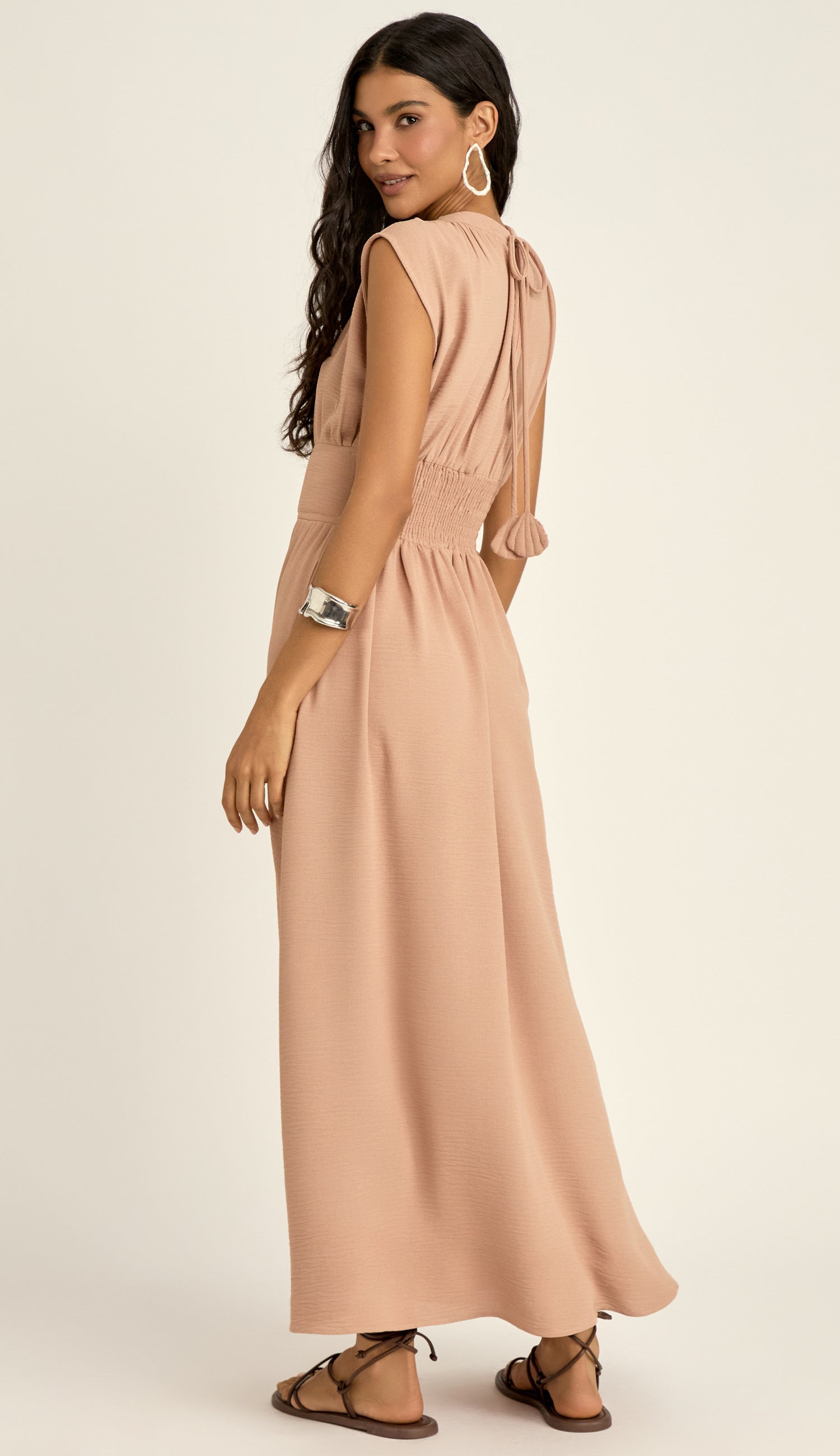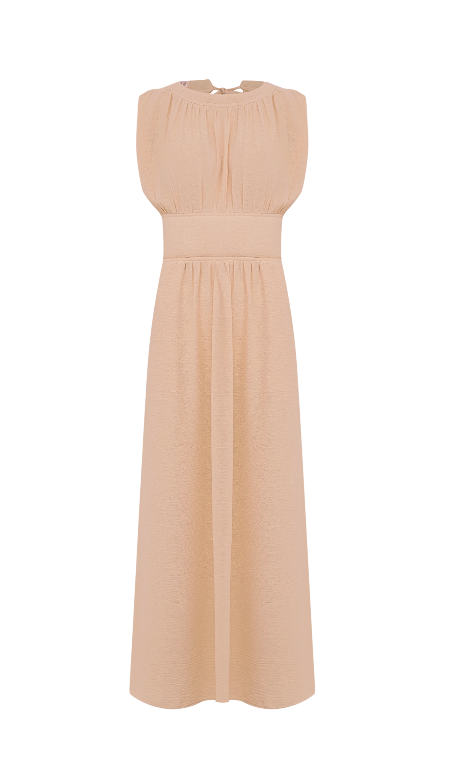 Vestido longo regata, confeccionado em crepe texturizado com aspecto de gaze e aparência amassadinha. Possui decote redondo, detalhe de manta acolchoadinha revestida na gola e na cintura, deixando um aspecto "estruturado" bem charmoso; conta ainda com franzidinhos na cintura, fechamento traseiro por tiras compridas para amarração na nuca com detalhe de aplicação da mesma manta revestida nas pontas em formato de conchas pespontadas e lastex na parte traseira da cintura para maior conforto.