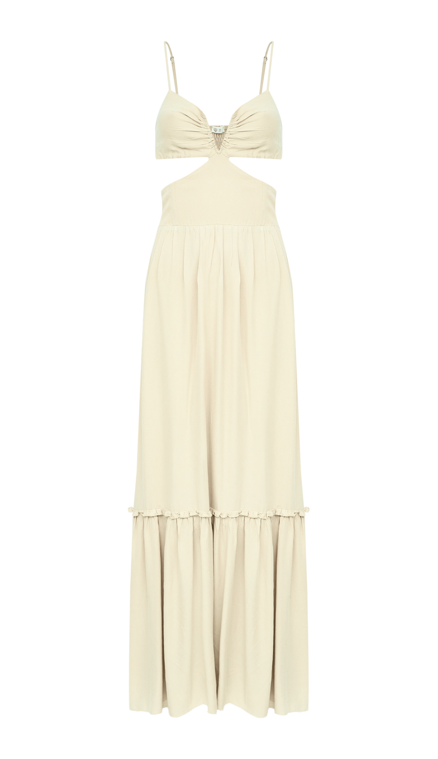Vestido longo confeccionado em viscose twill, com forro na saia. Possui decote estilo princesa, com abertura frontal em V estruturado com franzidinhos no centro e tecido duplo no busto para evitar transparência, além de alcinhas reguláveis. O busto é fixo à saia apenas na parte frontal, deixando a região da cintura à mostra. Conta ainda com elástico franzido nas costas do busto e da saia, pala estruturada com barbatanas na cintura e saia com franzidinhos e recorte com babadinhos na barra.