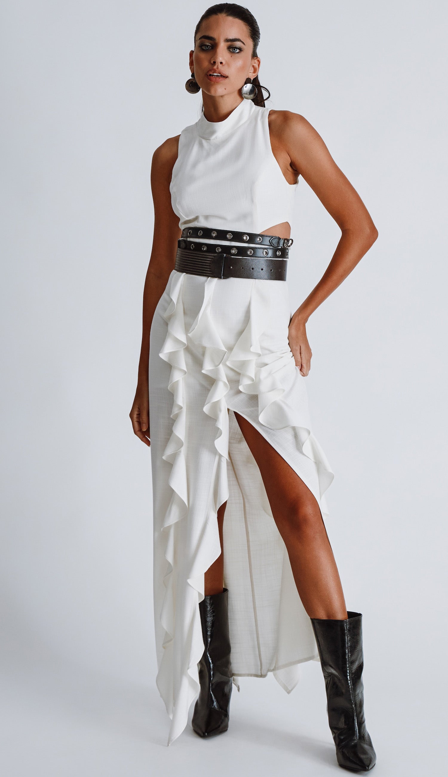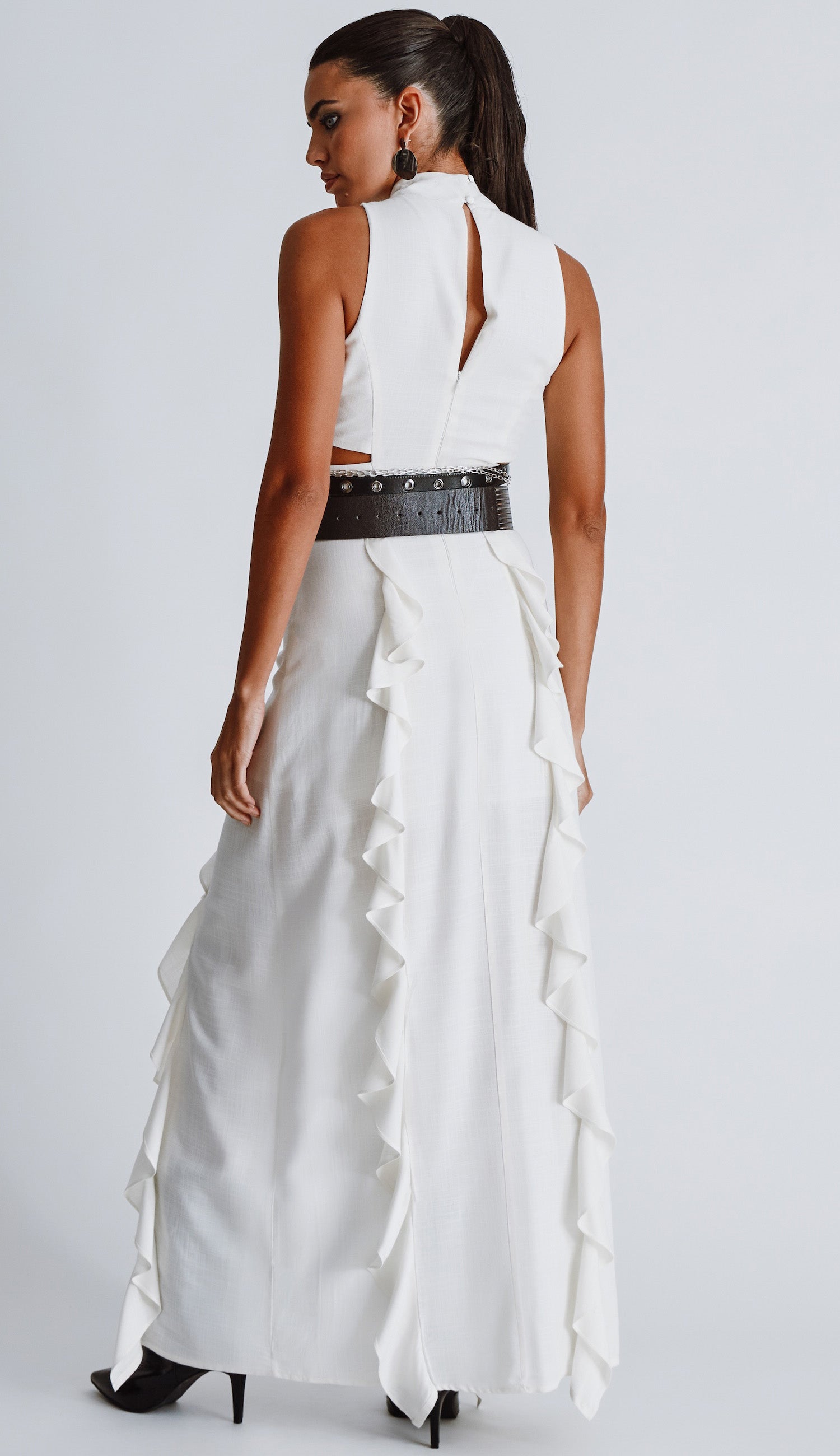 Vestido longo regata com forro, confeccionado em viscose com toque e aspecto de linho. Possui gola alta, fechamento traseiro por botões esmaltados na nuca e zíper invisível nas costas, pala na cintura com recortes vazados nas laterais, babadinhos no comprimento da saia e fenda frontal.