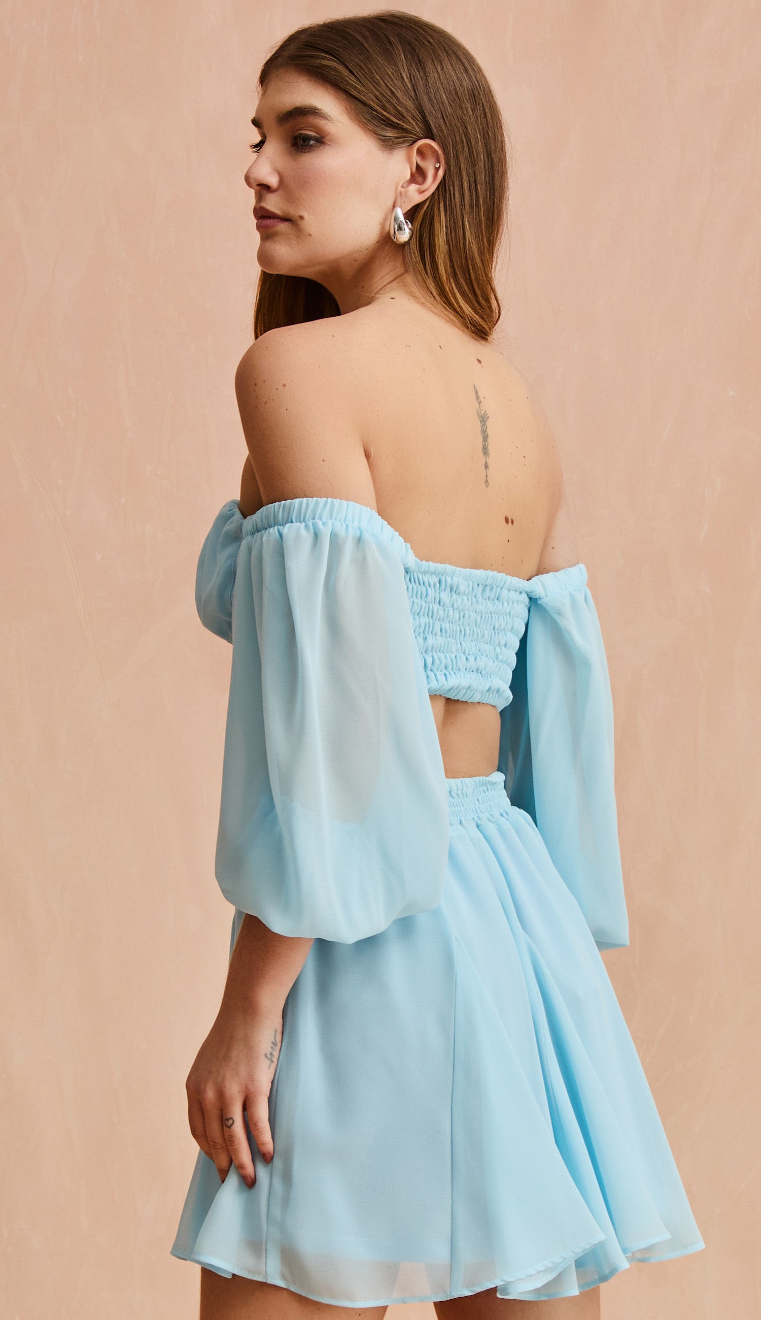 Vestido curto confeccionado em crepe com forro. Possui decote princesa com recortes franzidos que modelam o busto, pala na cintura, mangas bufantes com lastex no punho, elástico nos ombros que permite que o decote seja usado no lugar ou como ciganinha, saia evasê com nesgas, recorte vazado nas costas e lastex franzido nas costas da saia e da blusa, para melhor ajuste ao corpo.
