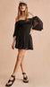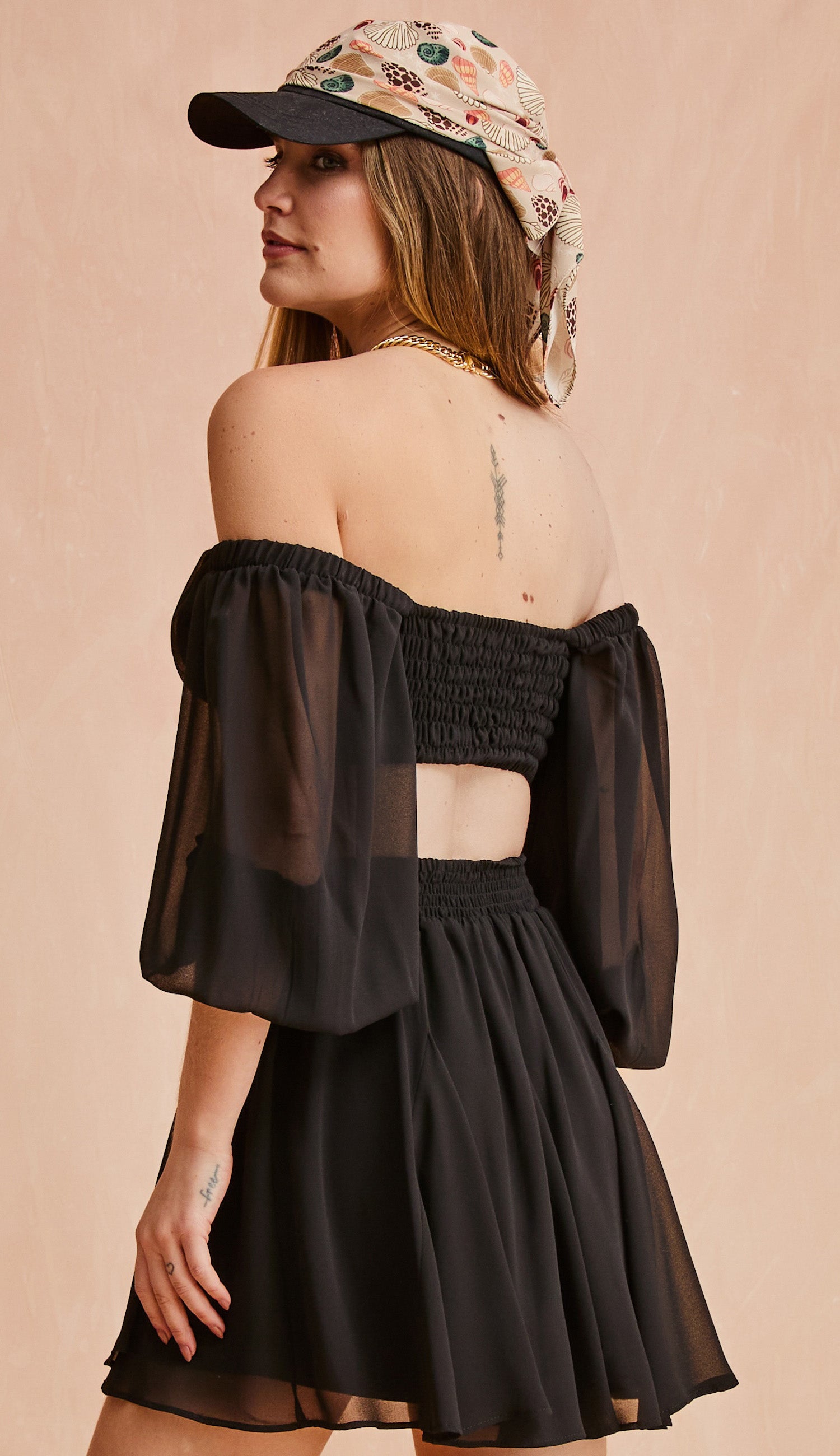 Vestido curto confeccionado em crepe com forro. Possui decote princesa com recortes franzidos que modelam o busto, pala na cintura, mangas bufantes com lastex no punho, elástico nos ombros que permite que o decote seja usado no lugar ou como ciganinha, saia evasê com nesgas, recorte vazado nas costas e lastex franzido nas costas da saia e da blusa, para melhor ajuste ao corpo.