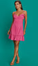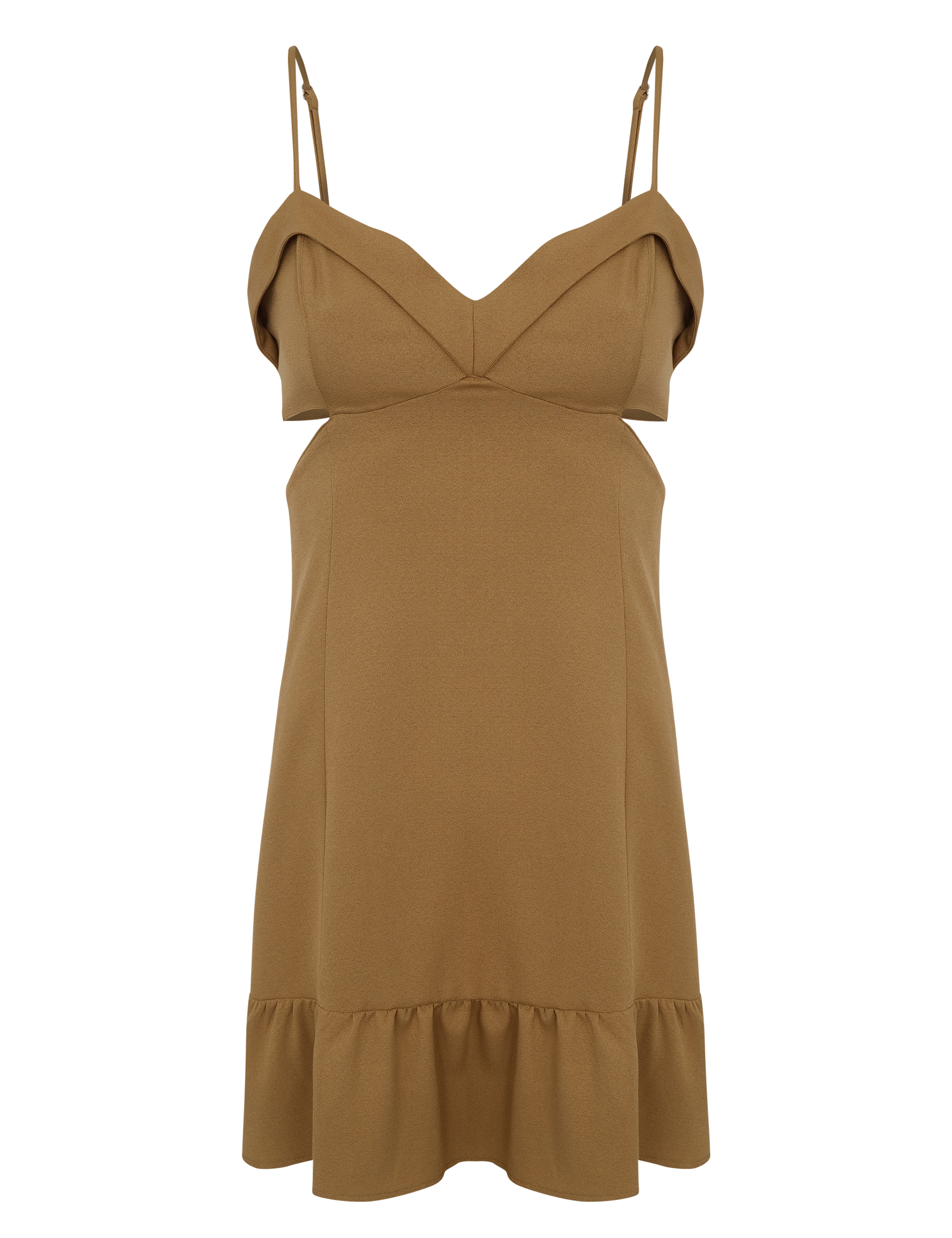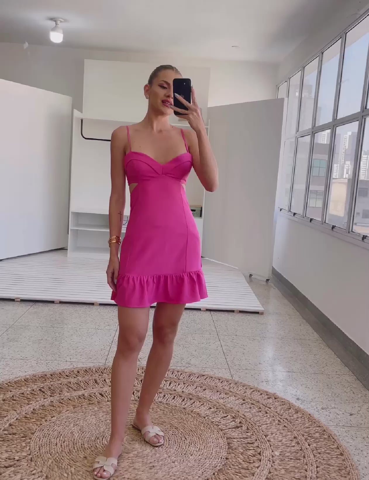 Vestido curto com forro, confeccionado em crepe de alfaiataria. Possui decote coração com pala dobrada e recortes que modelam o busto, alcinhas reguláveis, lastex nas costas para maior conforto, fechamento traseiro por zíper invisível, recortes vazados laterais na região da cintura e recorte com babado e franzidos na barra.
