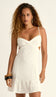 Vestido curto com forro, confeccionado em viscose com toque e aspecto de linho e leve elasticidade. Possui decote coração com pala dobrada e recortes que modelam o busto, alcinhas reguláveis, lastex nas costas para maior conforto, fechamento traseiro por zíper invisível, recortes vazados laterais na região da cintura e sutil babadinho franzido na barra.