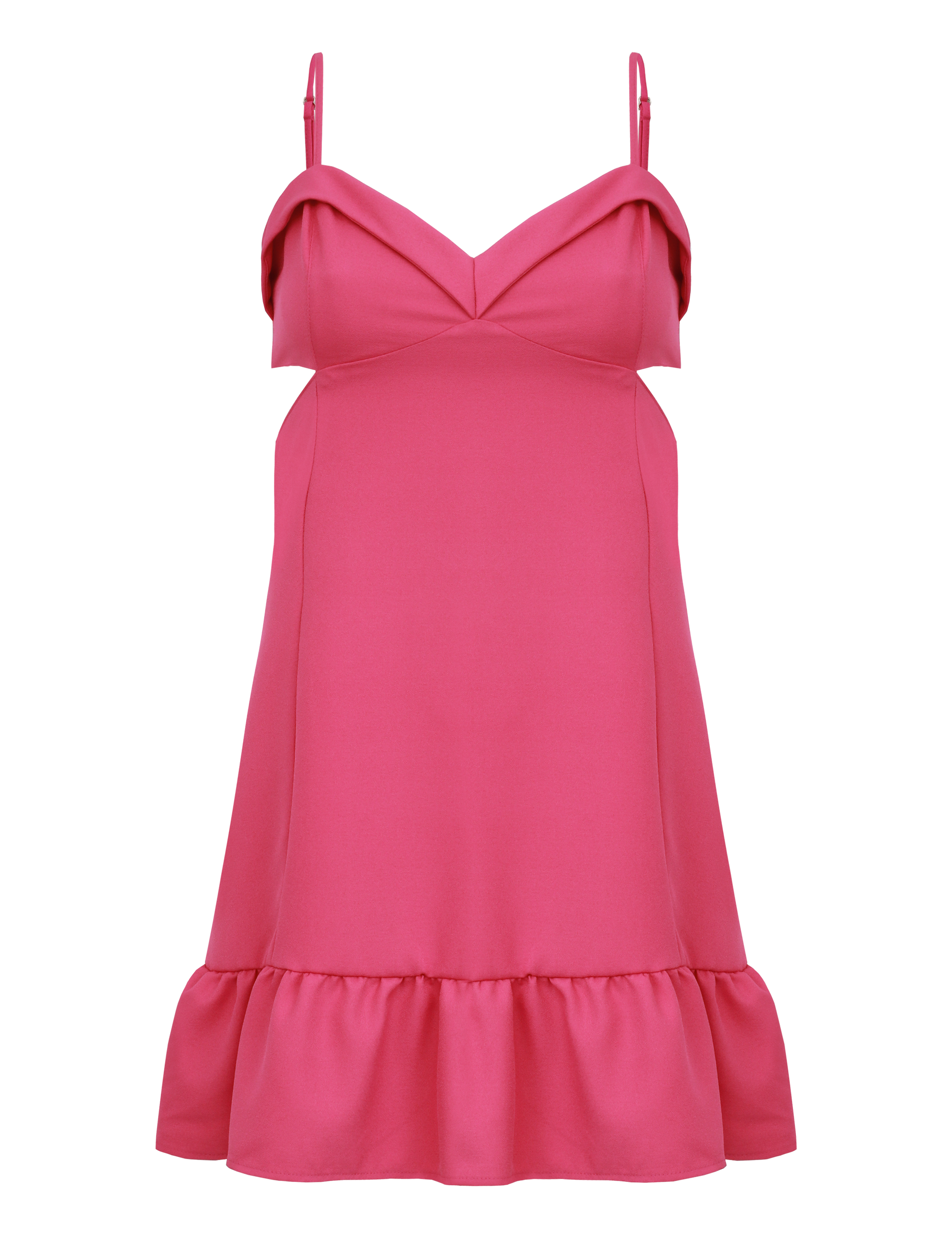 Vestido curto com forro, confeccionado em crepe de alfaiataria. Possui decote coração com pala dobrada e recortes que modelam o busto, alcinhas reguláveis, lastex nas costas para maior conforto, fechamento traseiro por zíper invisível, recortes vazados laterais na região da cintura e recorte com babado e franzidos na barra.
