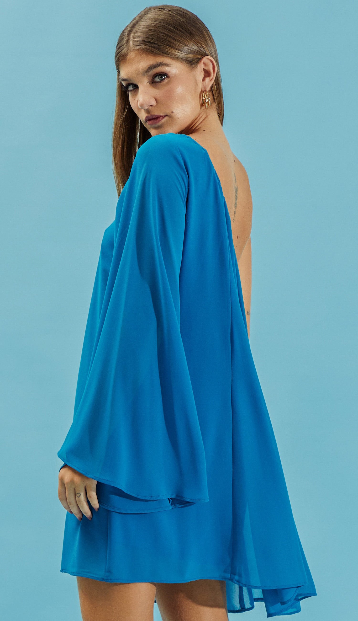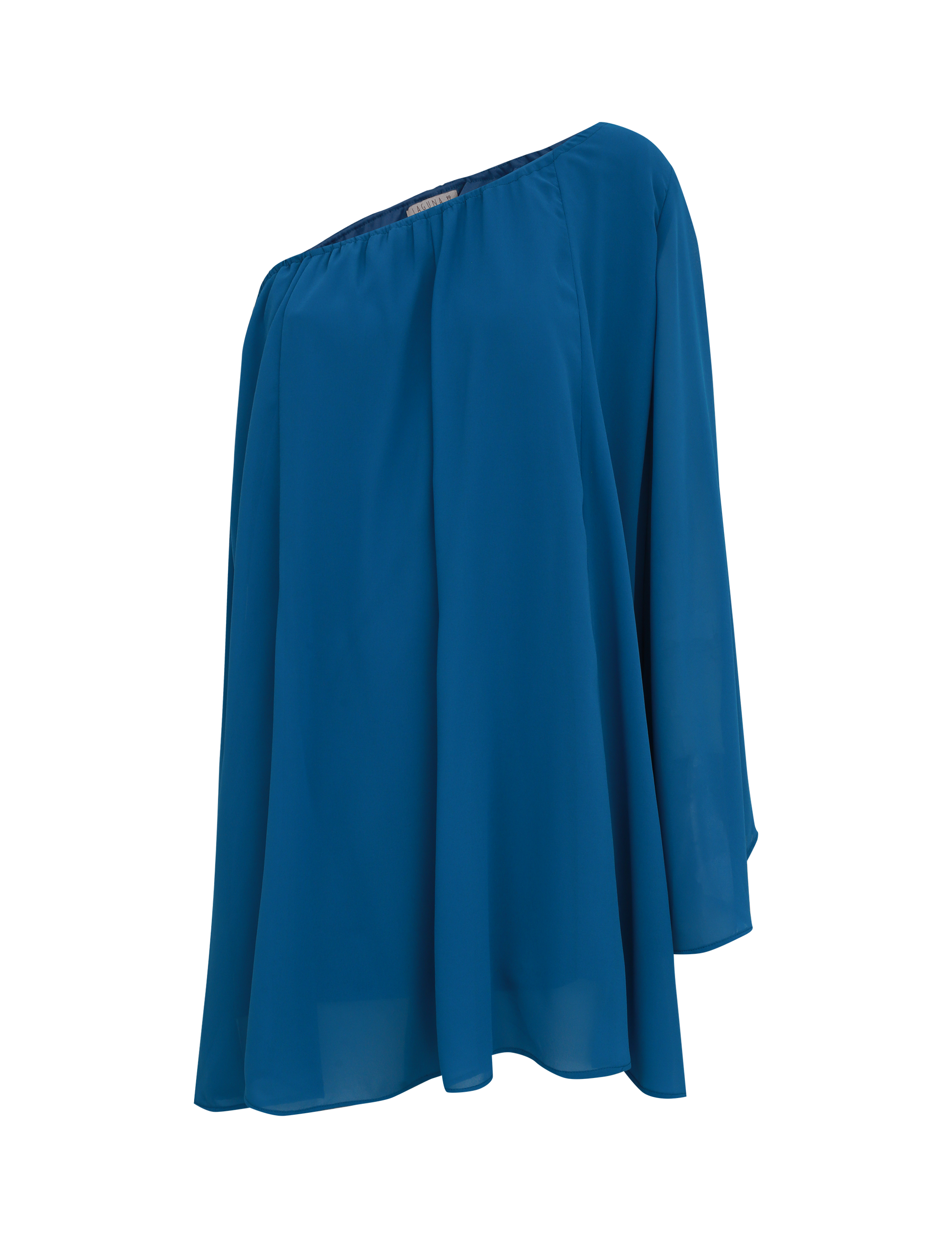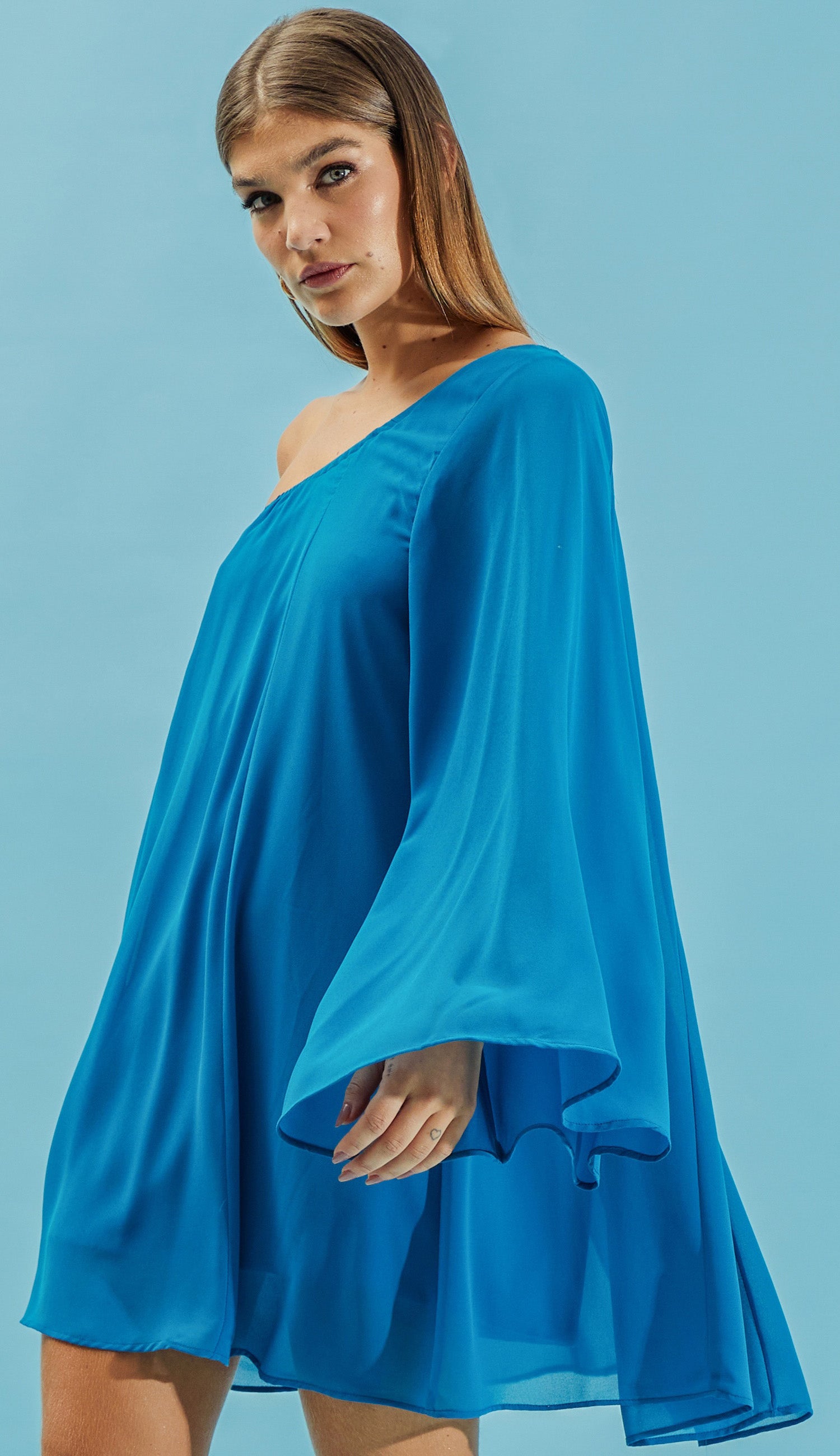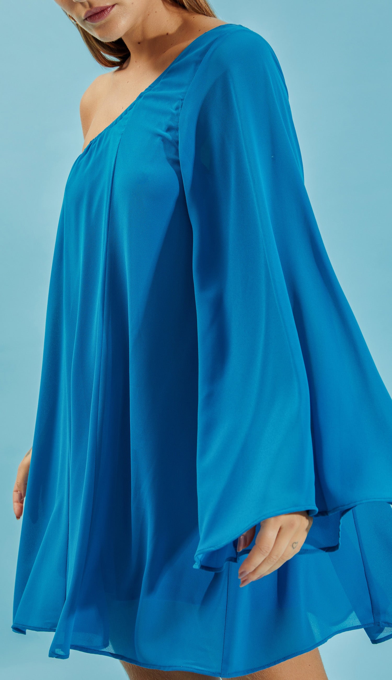 Vestido curto e amplo confeccionado em crepe leve com forro. Possui decote ombro único com elástico fino interno franzido, manga longa sino ampla e nesgas no comprimento da peça, deixando com aspecto bem esvoaçante.