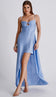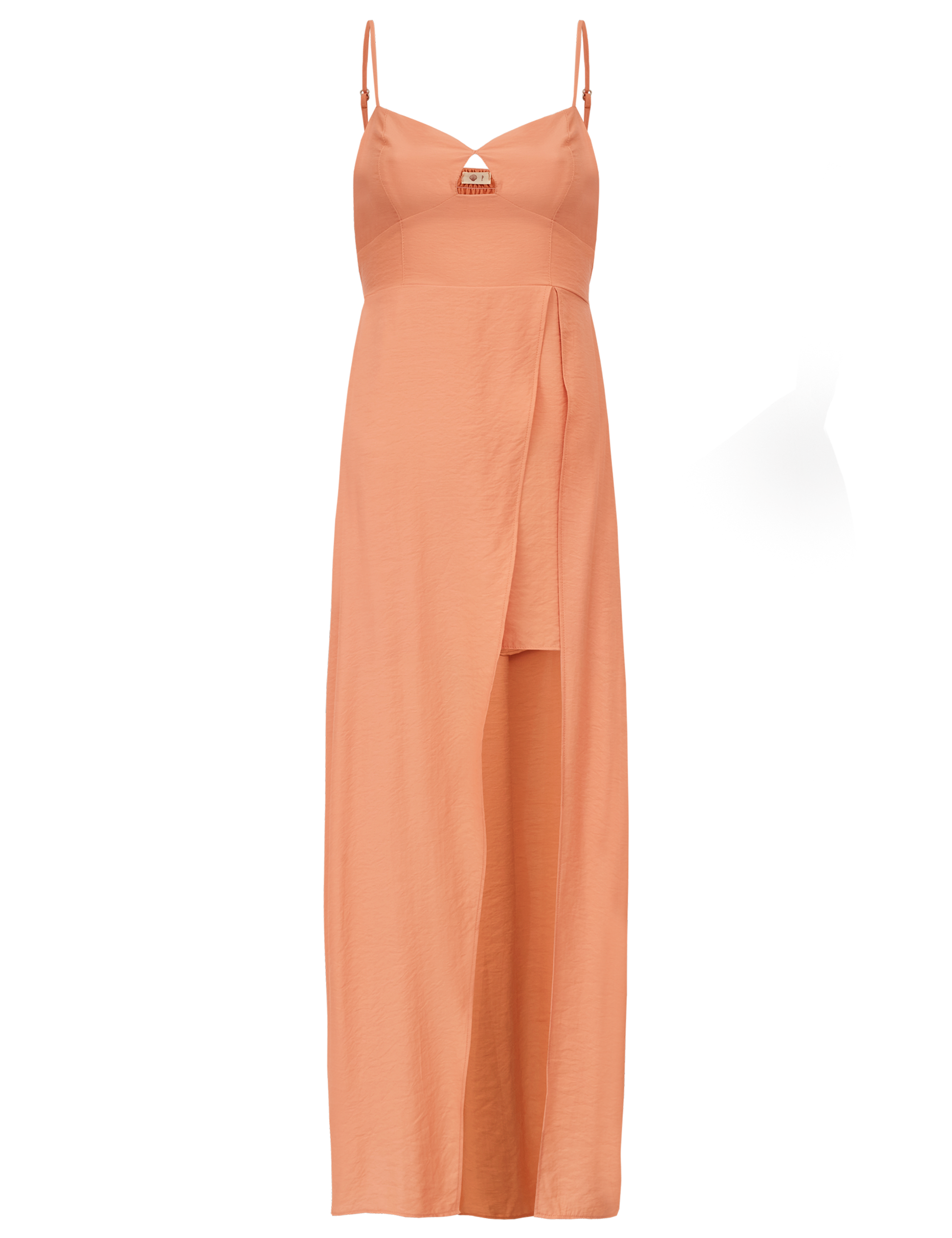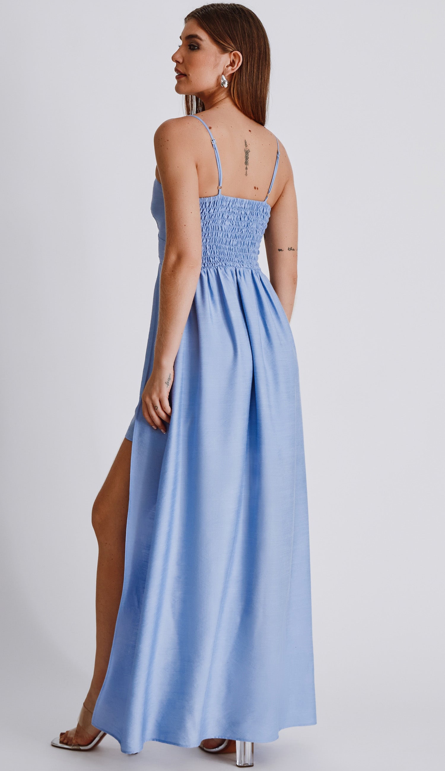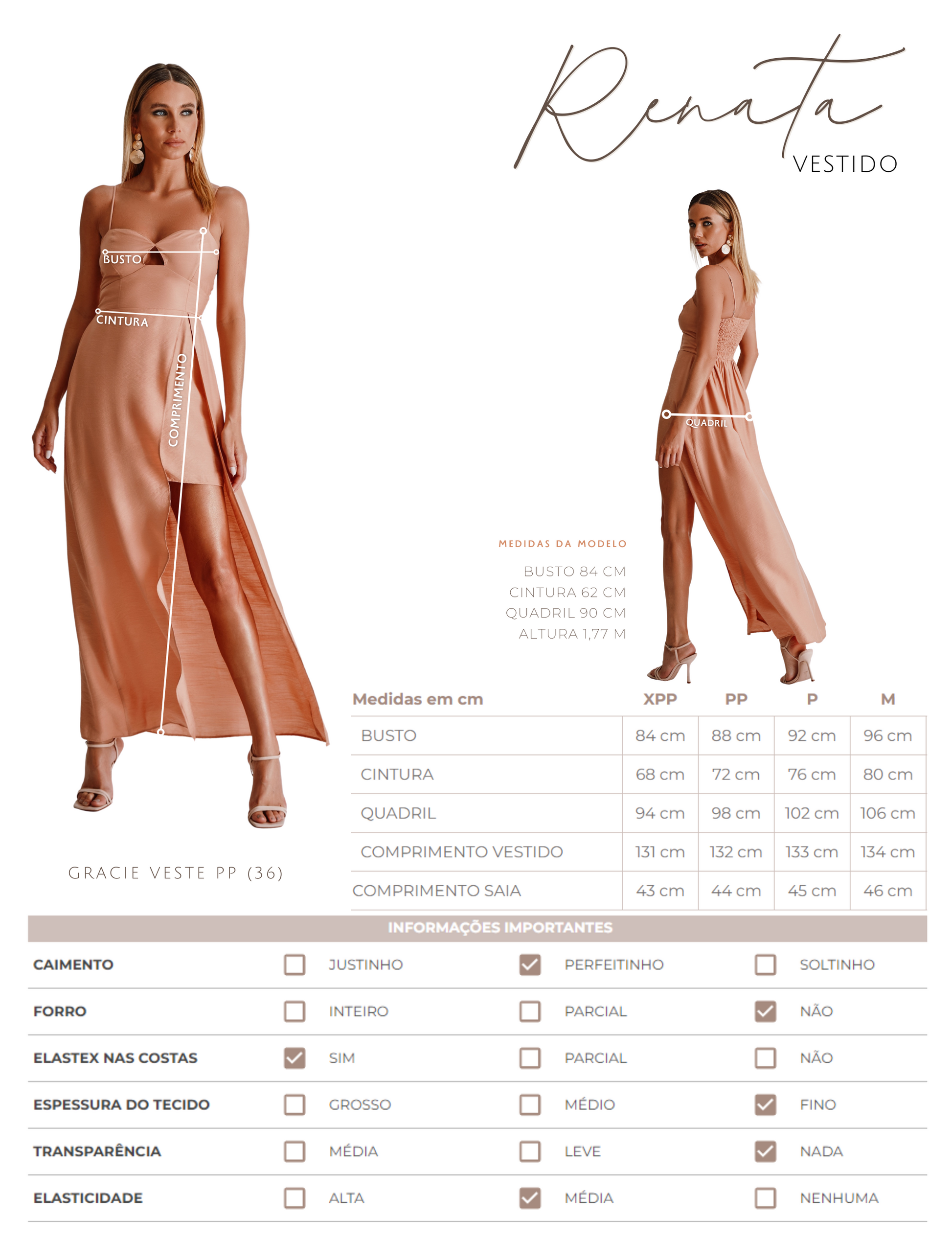 Vestido longo confeccionado em poliviscose com aparência levemente cintilante. Possui tecido duplo no busto para não ficar transparente, alcinhas reguláveis, decote arredondado estilo coração com recorte vazado no centro, recortes que modelam a peça, pala logo abaixo do busto, lastex franzido nas costas para melhor ajuste ao corpo e fenda lateral desde a cintura até a barra, deixando a saia curta que tem por baixo da peça à mostra.