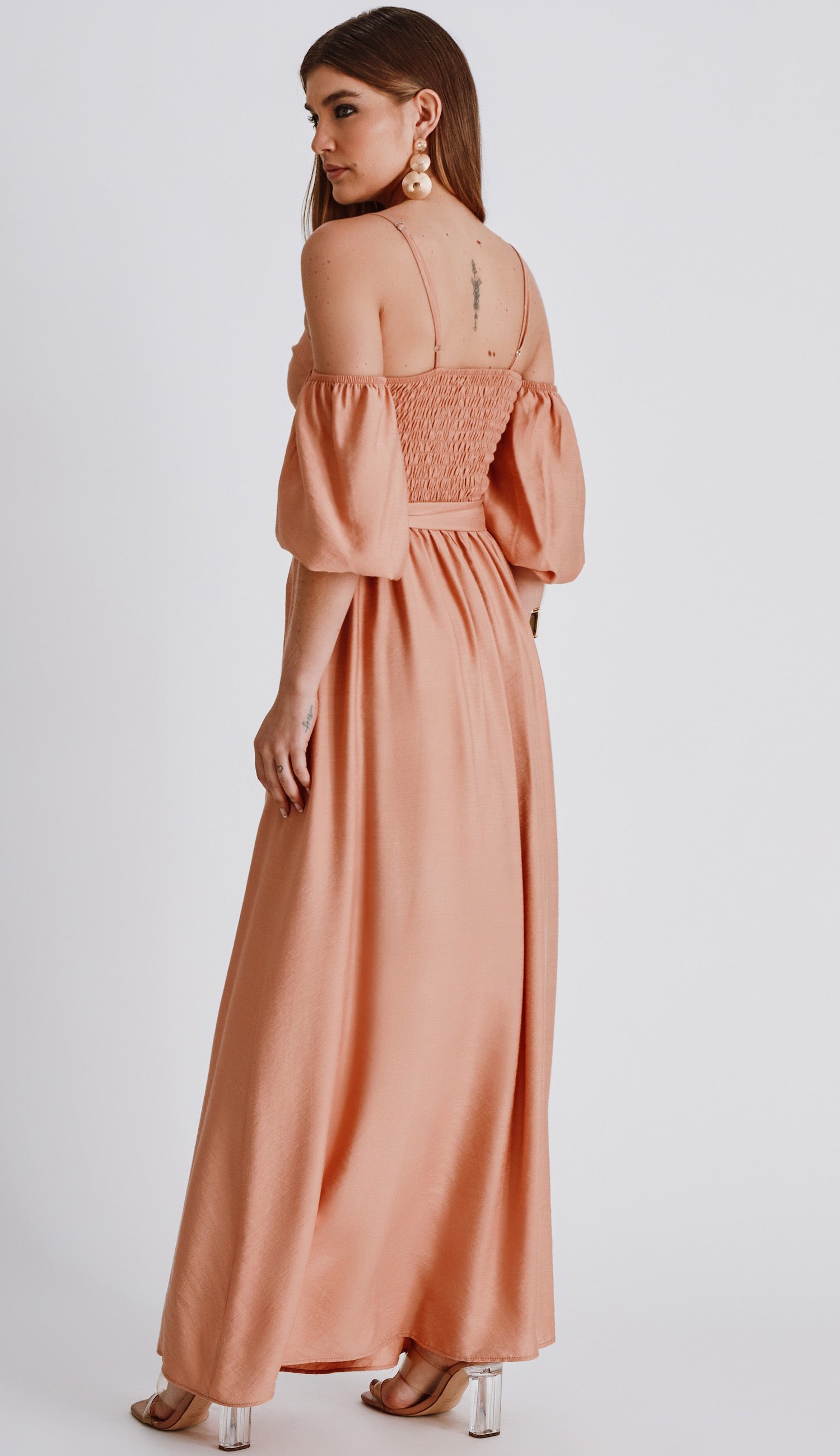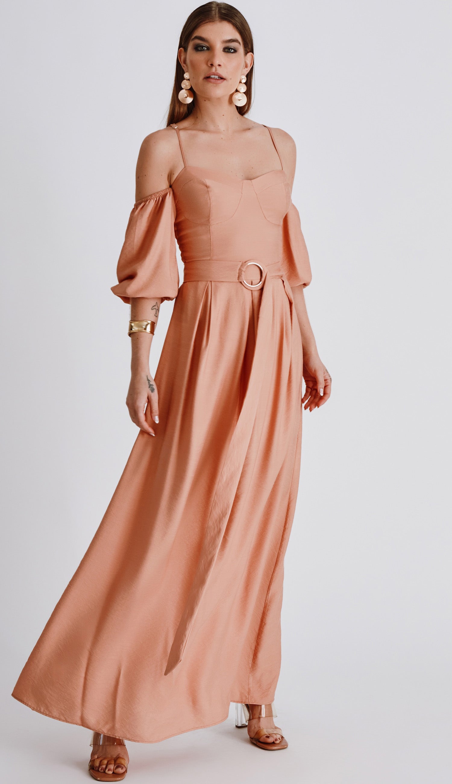 Vestido longo com forro, confeccionado em poliviscose com aparência levemente cintilante. Possui decote coração com pala e recortes que modelam o busto e a cintura, alcinhas reguláveis, mangas ciganinhas 3/4 bufantes com elástico franzido no ombro e no punho, pregas na saia que é mais reta, e lastex franzido nas costas para maior conforto. Acompanha cinto de faixa no mesmo tecido, com argola dupla para regulagem, sendo uma forrada e outra mais fina em metal.