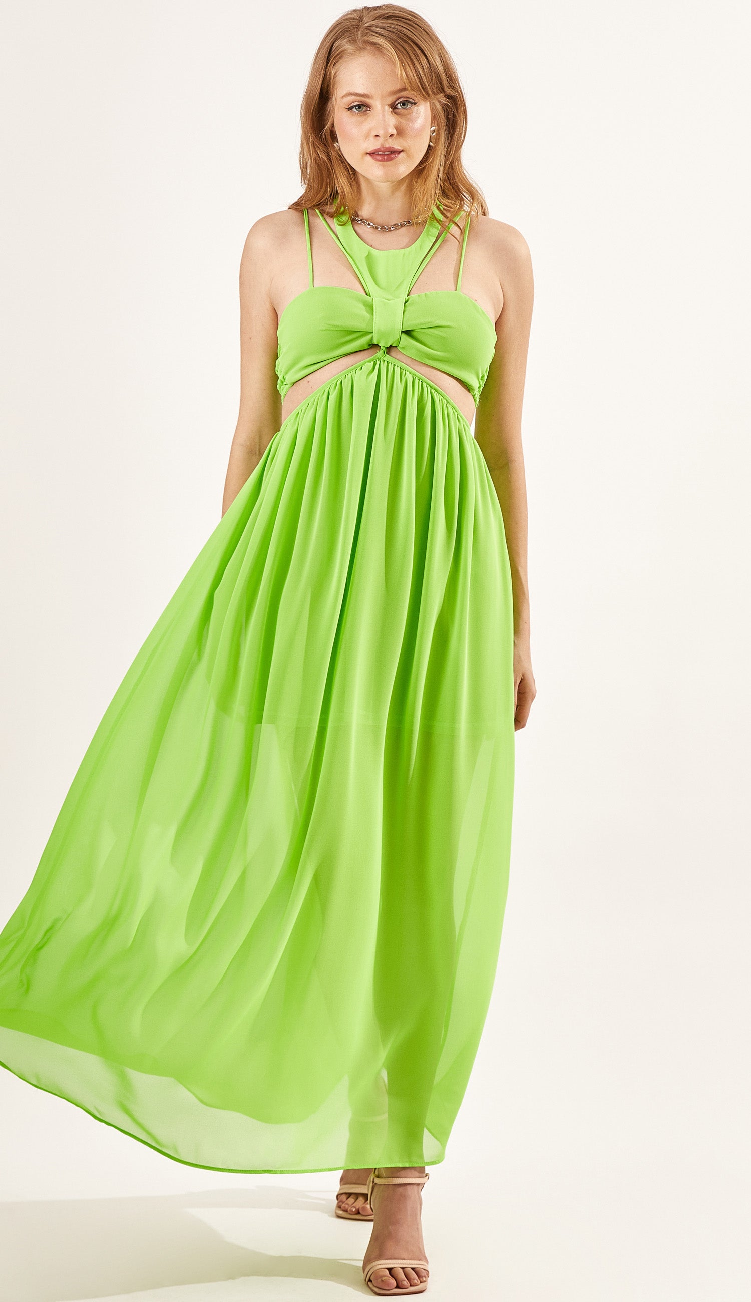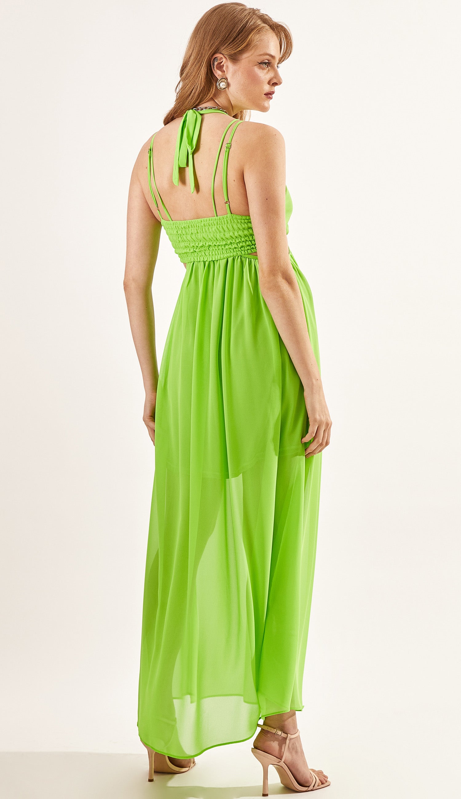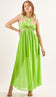 Vestido longo confeccionado em crepe. Possui o busto solto da saia e conta com alcinhas reguláveis, lastex franzido nas costas, decote coração levemente franzido com elástico interno para dar sustentação e detalhe no mesmo tecido para amarrar no pescoço, parecendo um colar. A saia tem modelagem soltinha e possui forro, alcinhas reguláveis, e franzidinhos em todo o cós, deixando a peça bem esvoaçante.