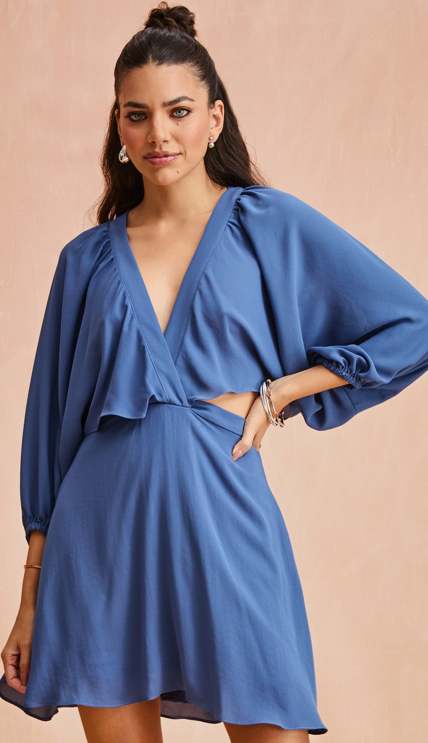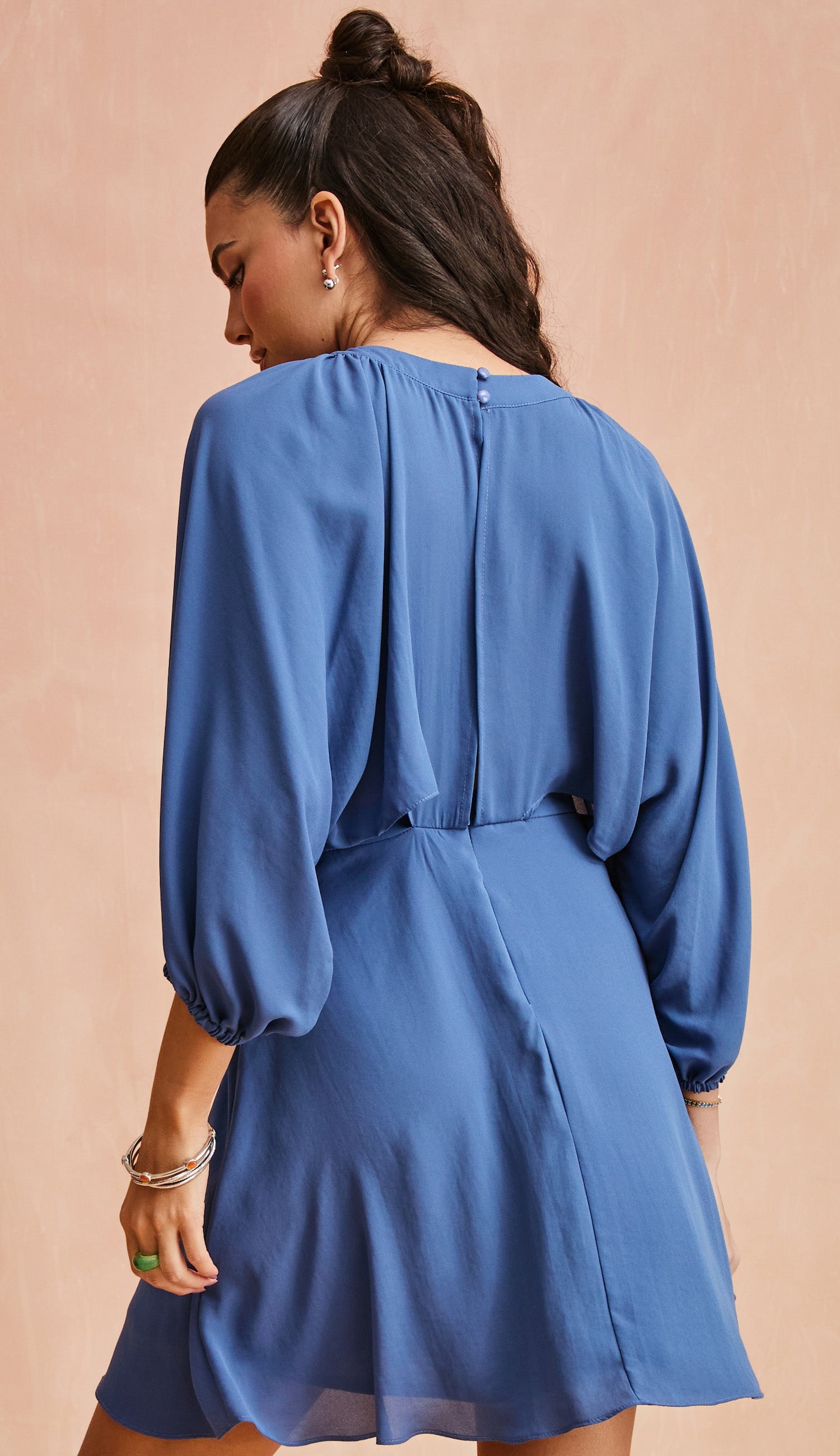 Vestido confeccionado em crepe com forro. Possui mangas morcego 3/4 com franzido nos ombros e elástico nos punhos. Decote "V" transpassado e fixo somente em uma parte da frente e das costas, com abertura nas laterais. A saia, mais soltinha, possui modelagem godê. Fechamento por zíper invisível nas costas.