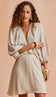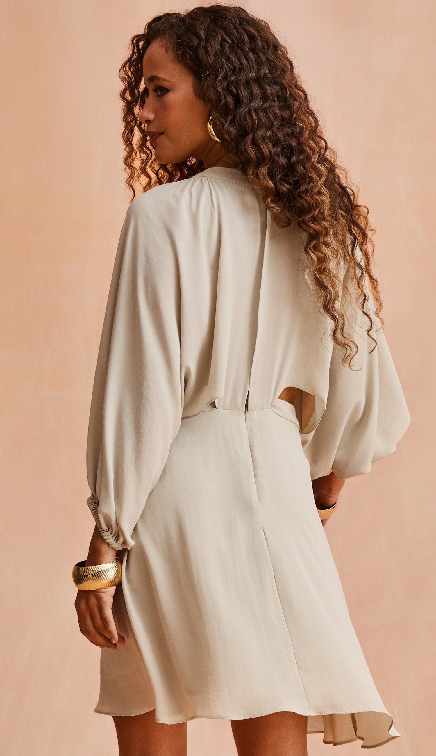 Vestido confeccionado em crepe com forro. Possui mangas morcego 3/4 com franzido nos ombros e elástico nos punhos. Decote "V" transpassado e fixo somente em uma parte da frente e das costas, com abertura nas laterais. A saia, mais soltinha, possui modelagem godê. Fechamento por zíper invisível nas costas.