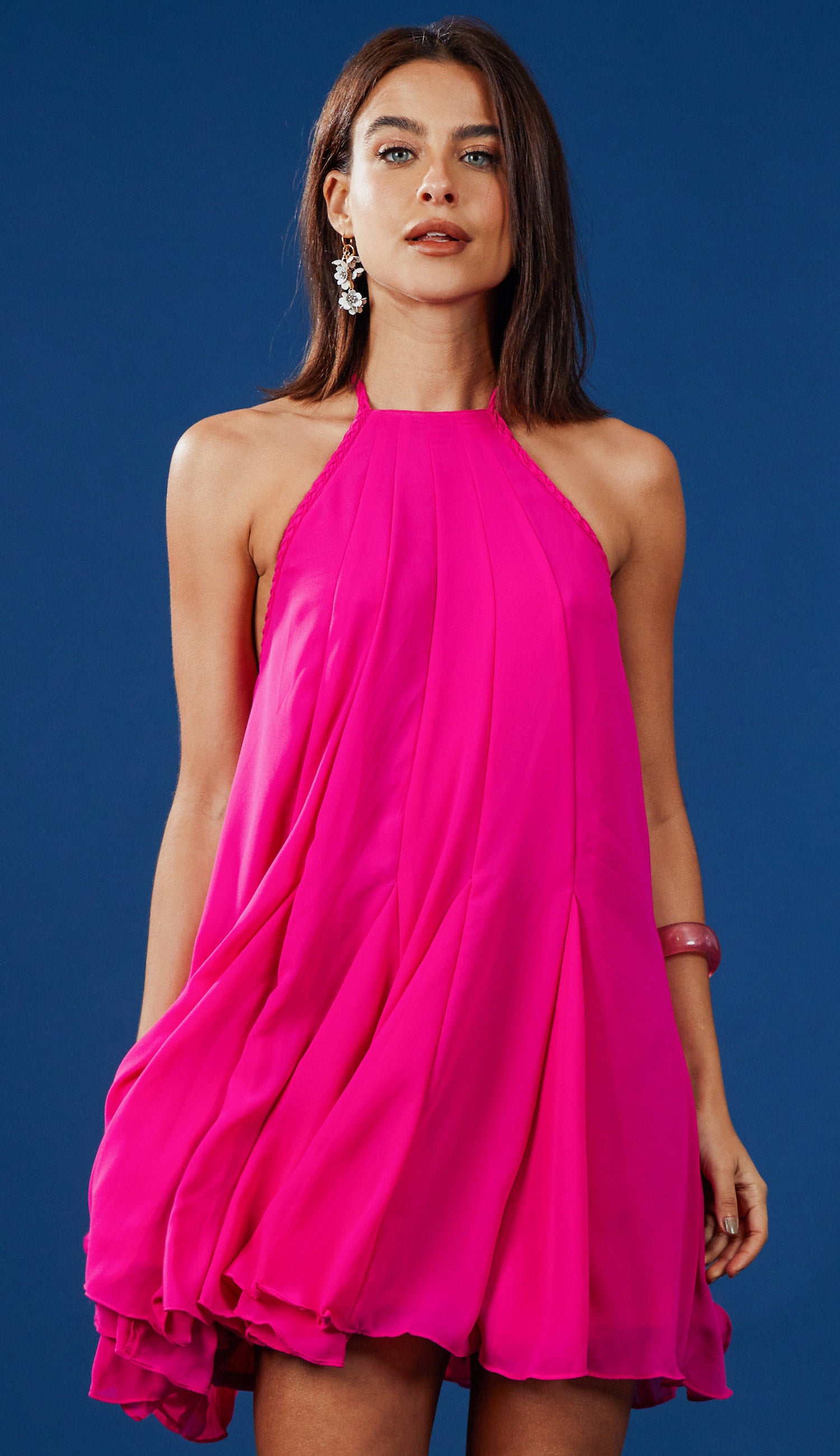 Vestido curto amplo confeccionado em crepe leve com forro. Possui decote halter frente única, com alcinhas trançadas em toda a cava para amarrar no pescoço, tiras para amarrar nas costas, uma mais larga e outra fina, além de recortes no decote com nesgas que dão um lindo movimento esvoaçante para a peça.