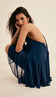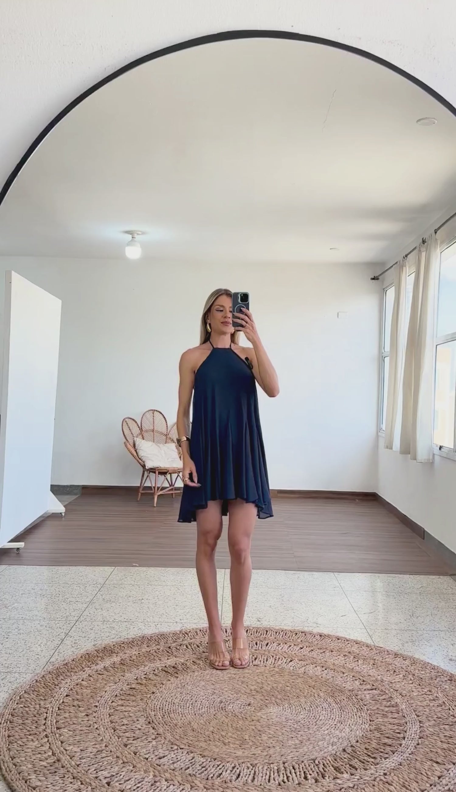 Vestido curto amplo confeccionado em crepe leve com forro. Possui decote halter frente única com alcinhas trançadas em toda a cava para amarrar no pescoço, tiras para amarrar nas costas, uma mais larga e outra fina, além de recortes no decote com nesgas que dão um lindo movimento esvoaçante para a peça.